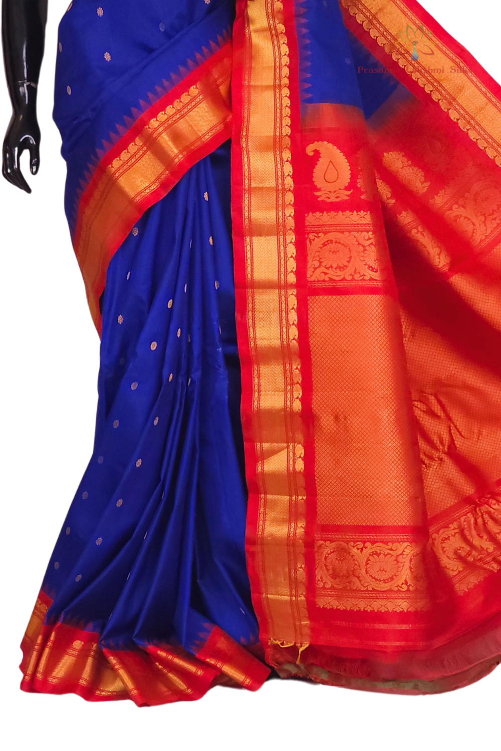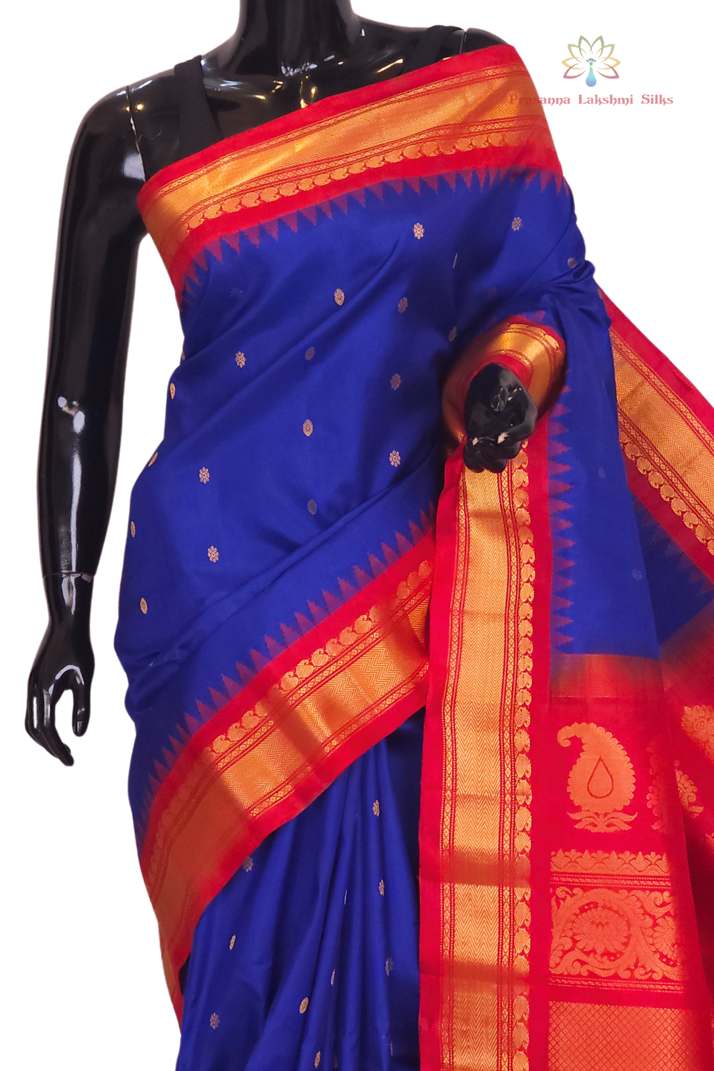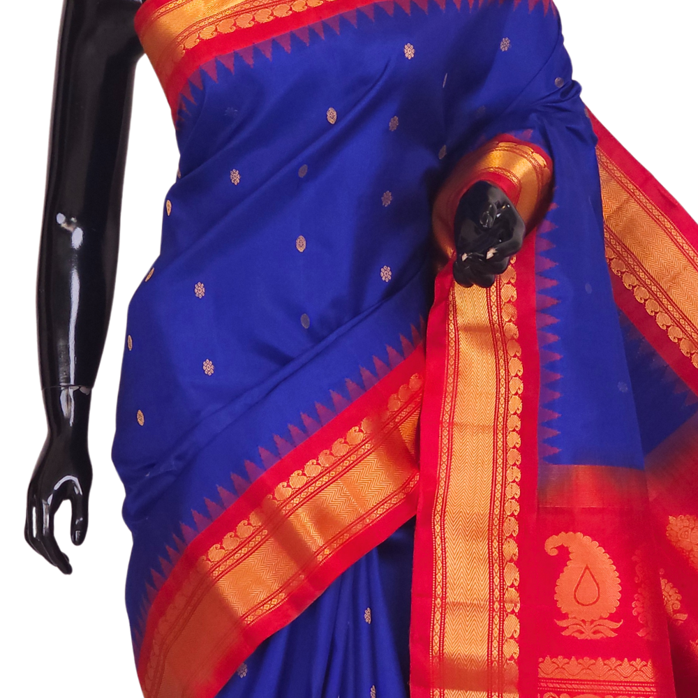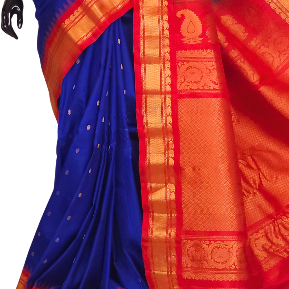 Elevate your elegance with our exquisite Handloom Gadwal Pure Silk Saree, adorned with Intricate small zari motifs zari-woven borders Rich zari-woven brocade adorns the pallu, making every drape a statement.