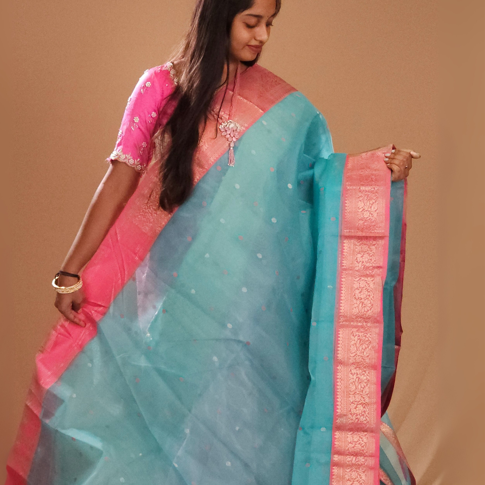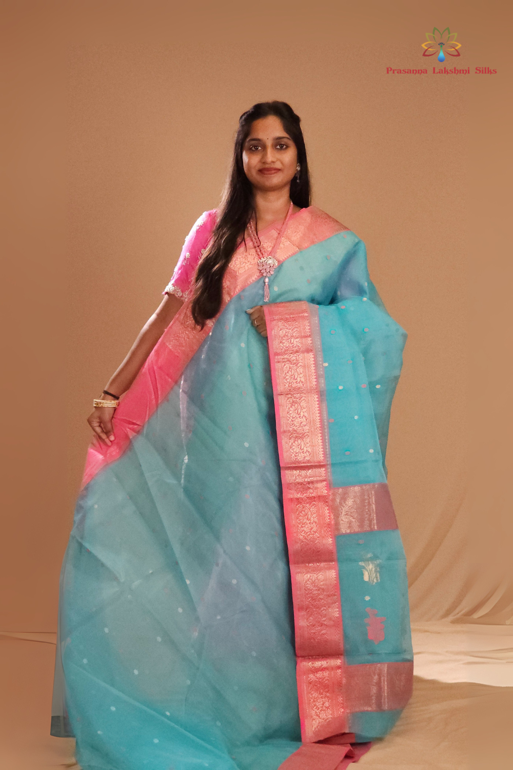 Elevate your ethnic wardrobe with our exquisite Chanderi Silk Sarees featuring allover zari-woven motifs, adorned with elegant zari khaddi borders and a rich brocade pallu that adds a regal touch. Paired with a running blouse, this saree beautifully blends grace and tradition....