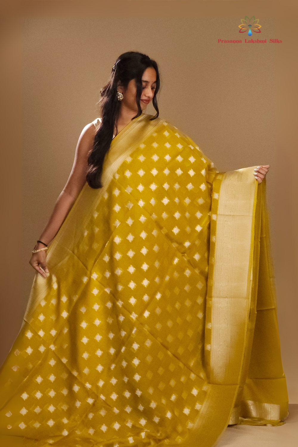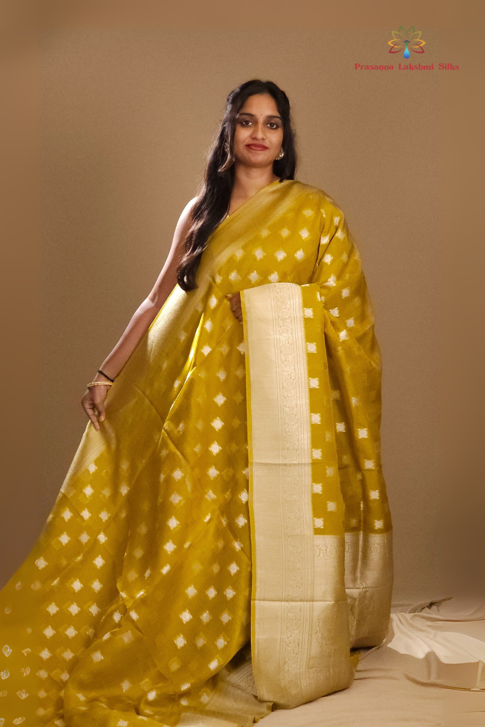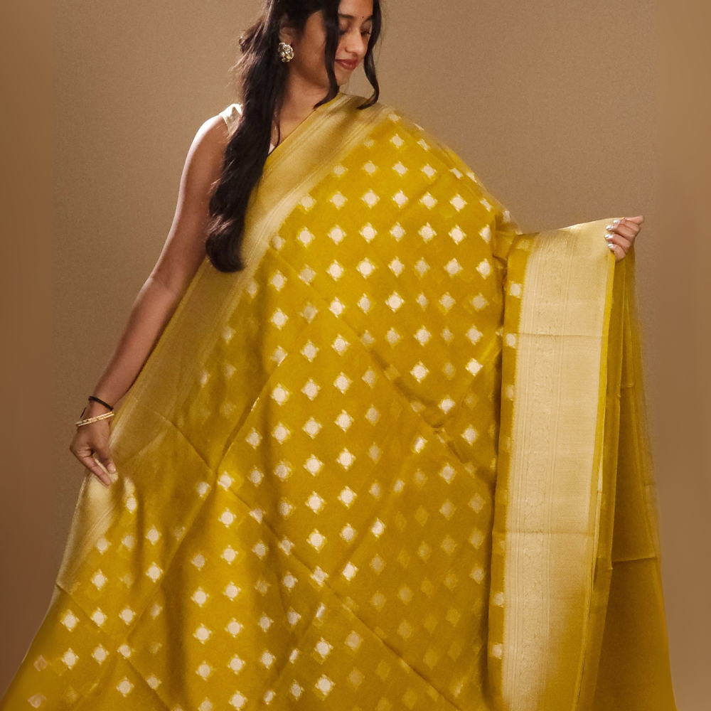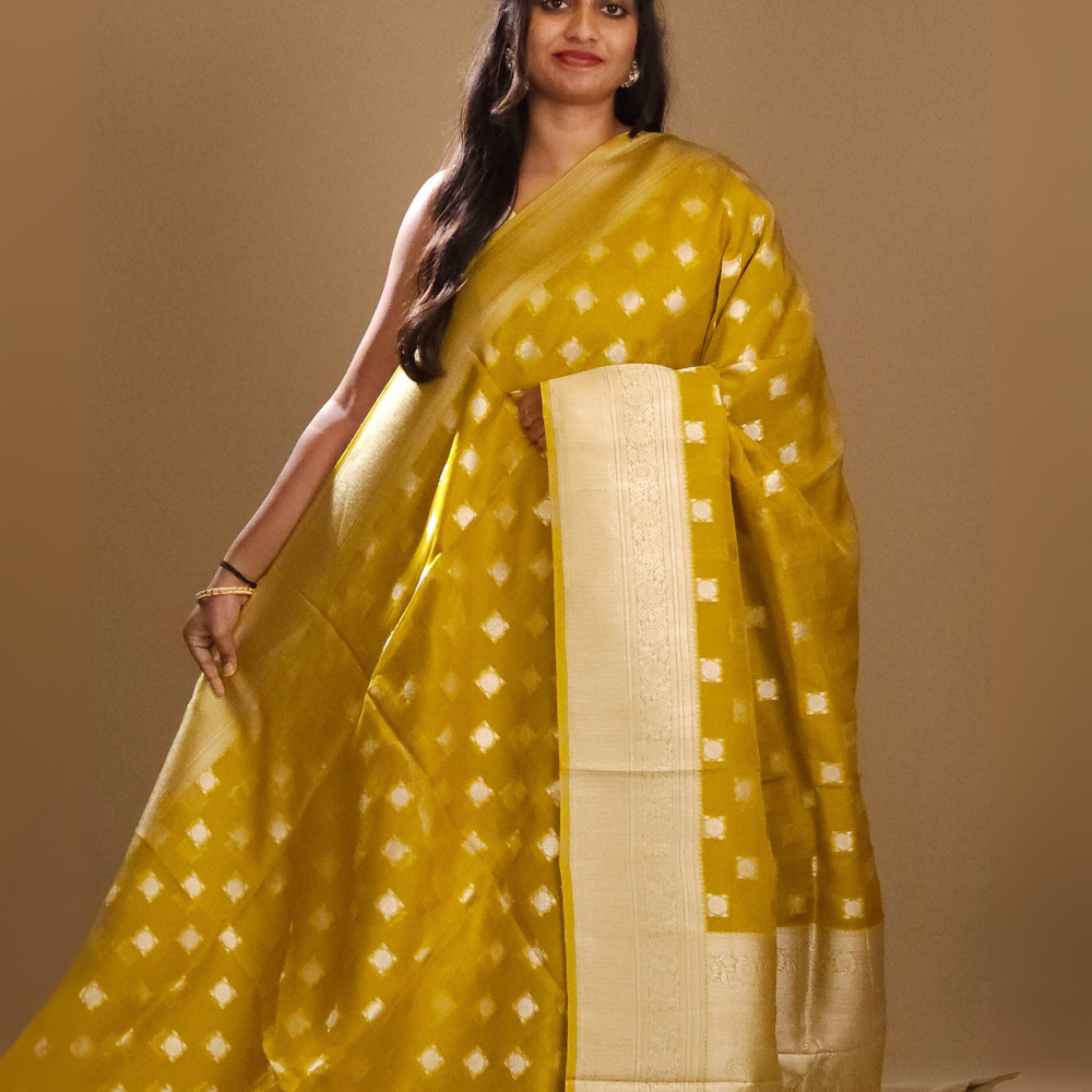 Exquisite Banarasi Kora Organza saree all-over Zari woven motifs for a timeless look,rich zari woven borders,rich brocade pallu paired with running blouse....