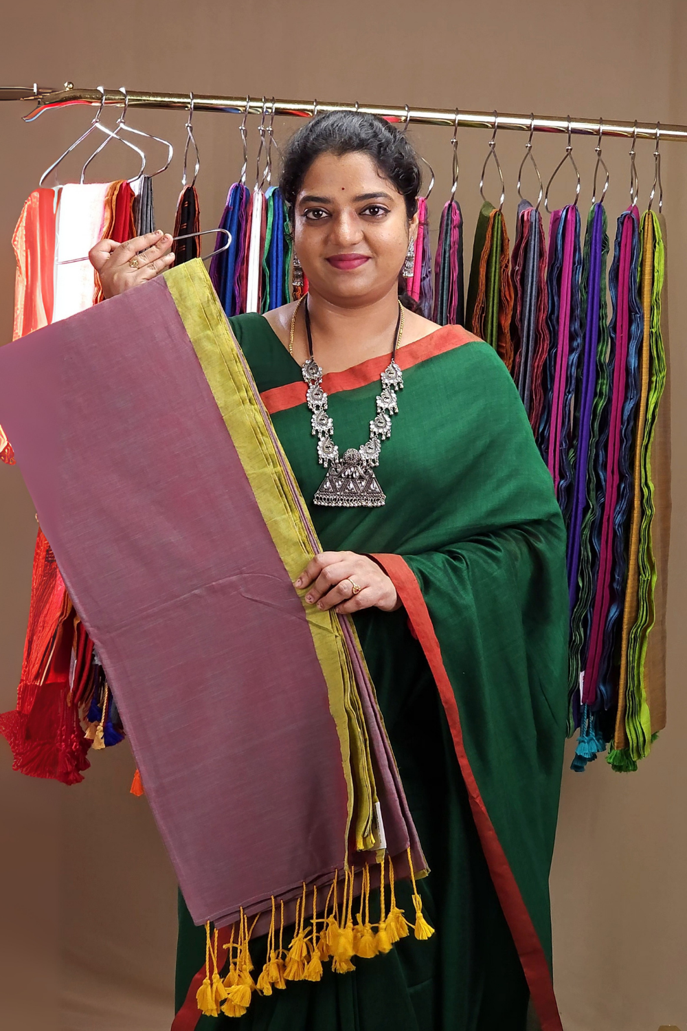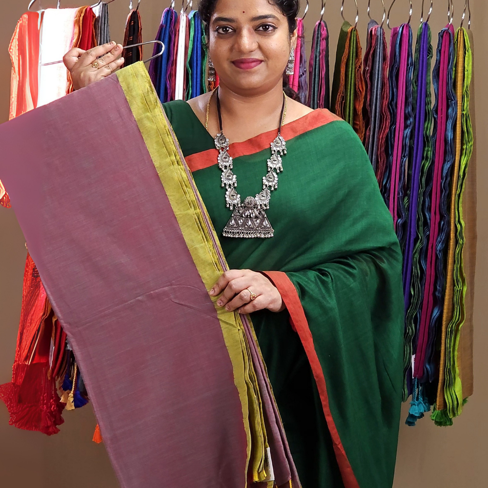 Discover the elegance of our Khadi Cotton Saree, featuring a plain body paired with contrast color detailing in 1 inch , pallu finished with tassels paired with a running blouse.....