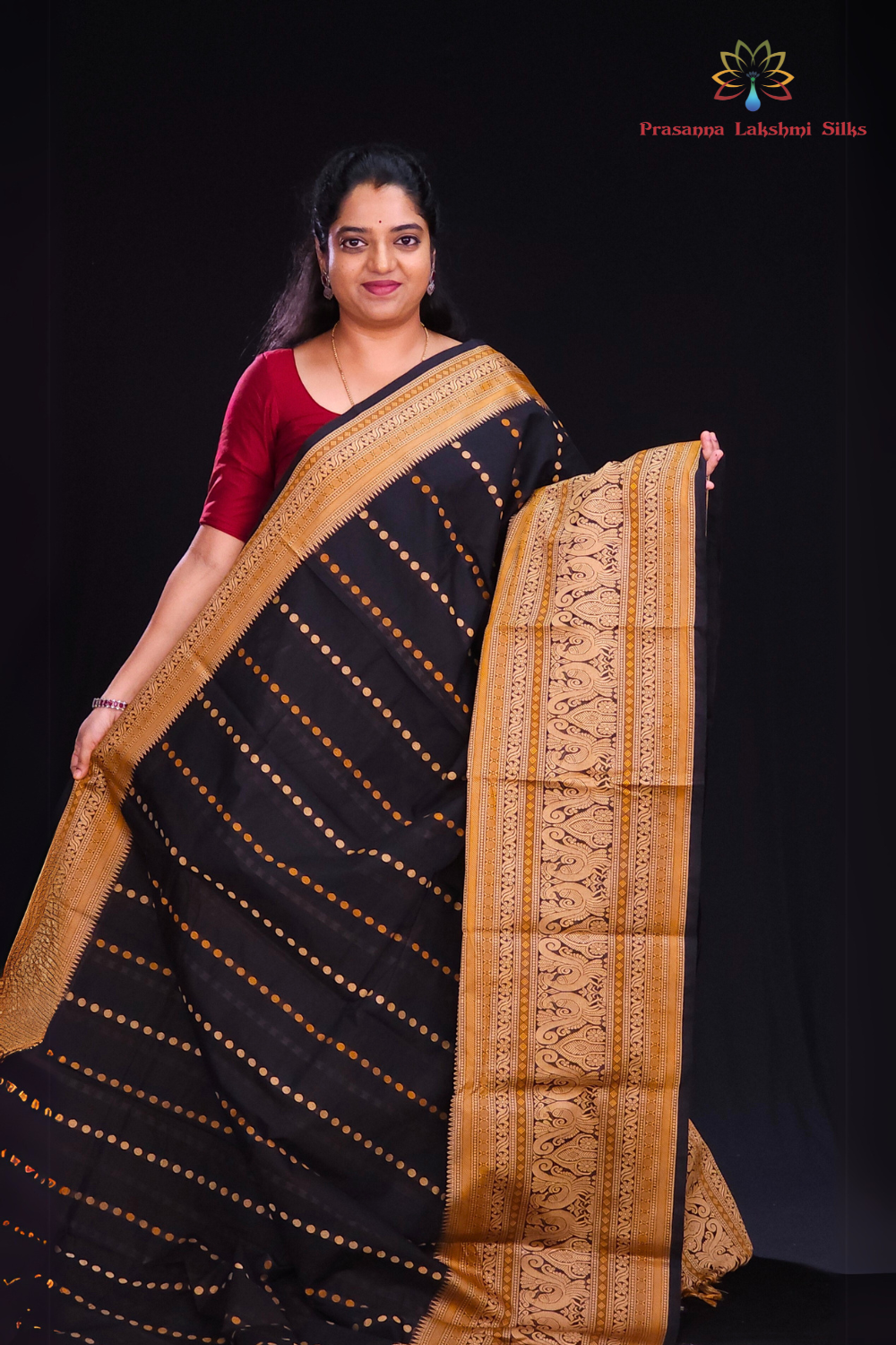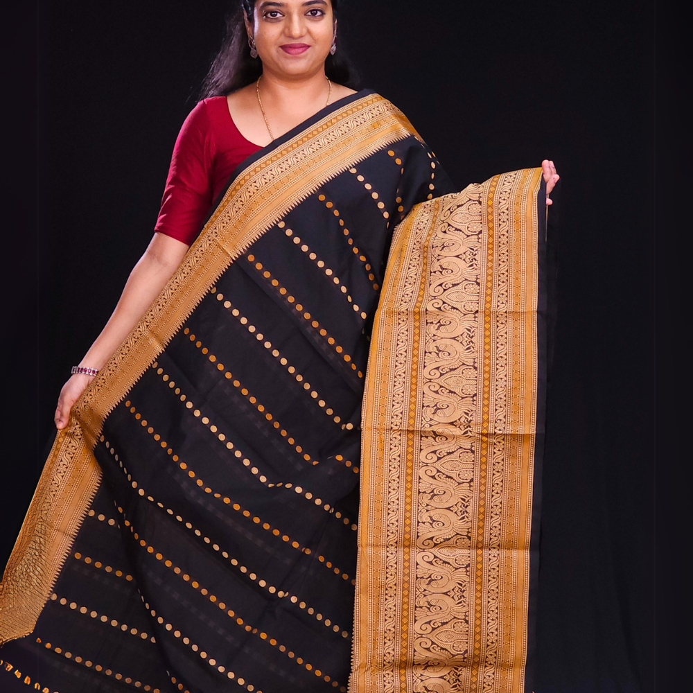 Elevate your style with our stunning Handloom Kanchi Cotton Saree allover thread woven motifs in stripes pattern with equisite thread woven rich borders, pallu paired with running blouse...