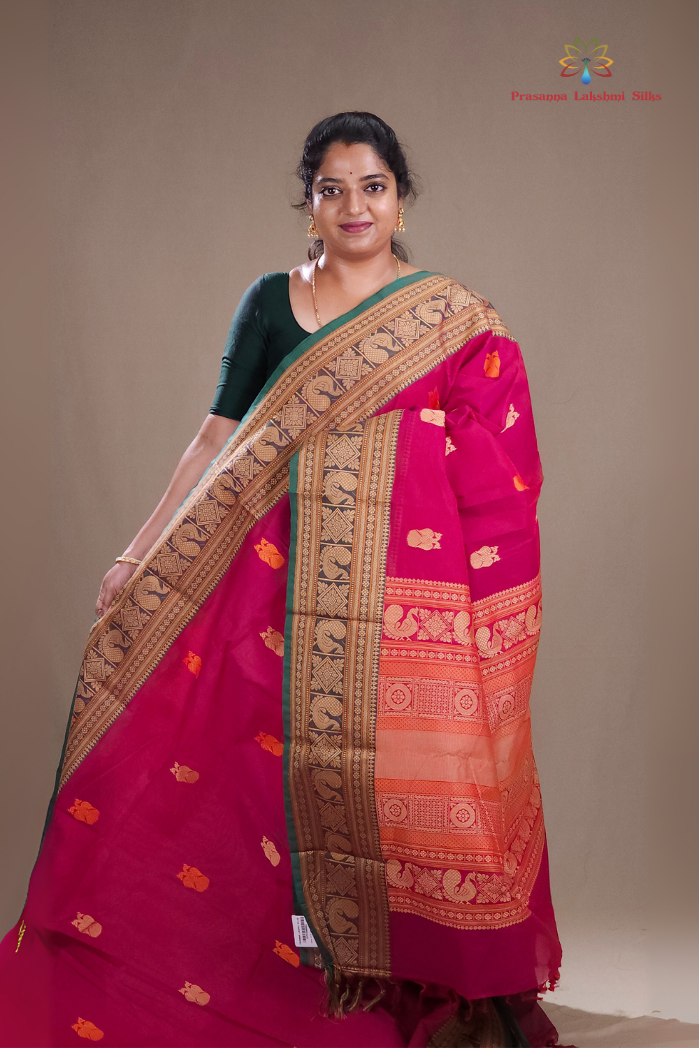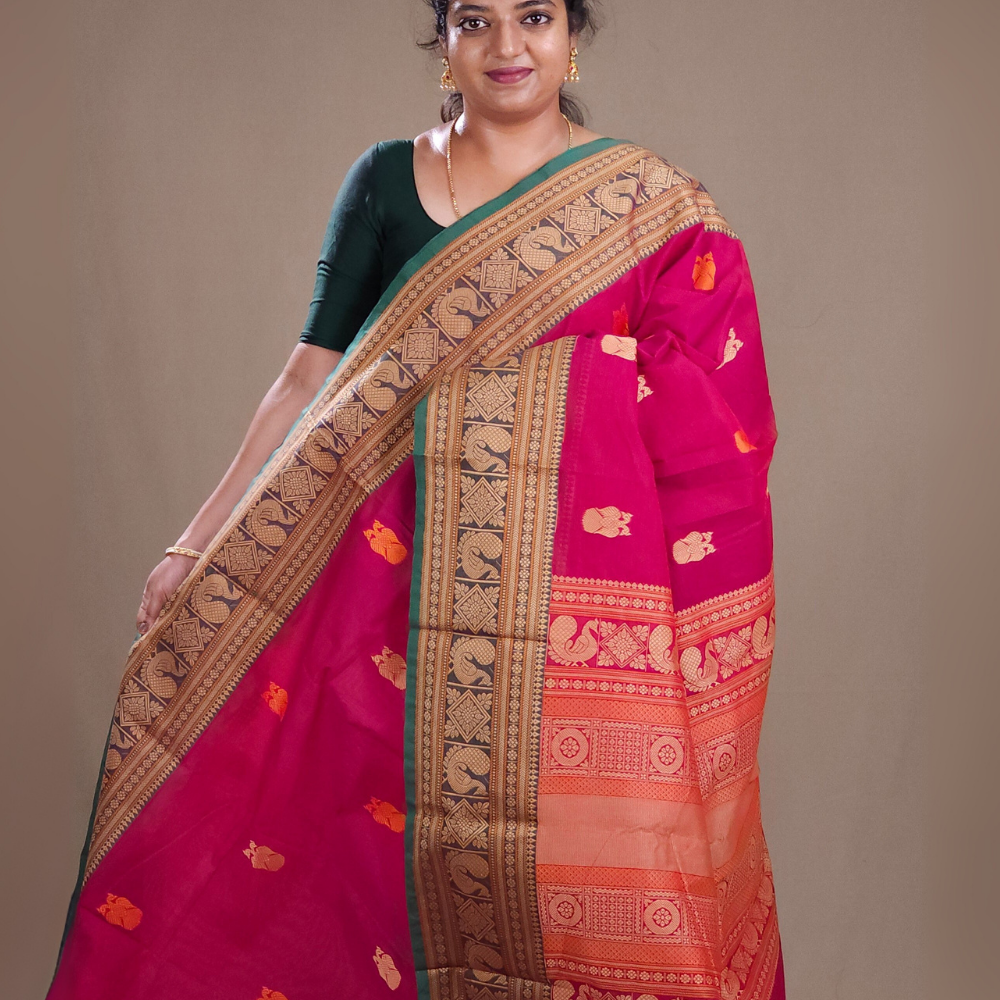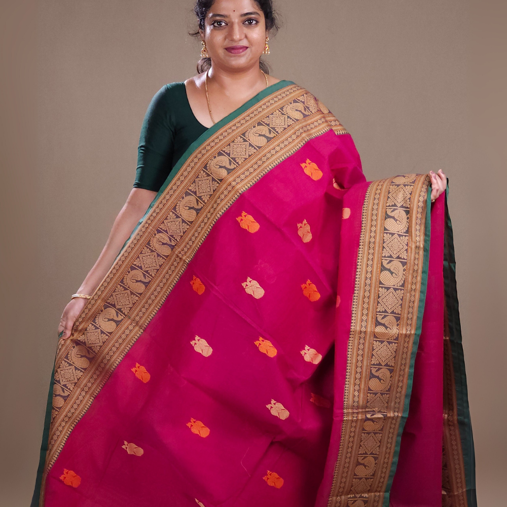 Elevate your style with our stunning Handloom Kanchi Cotton Saree allover thread woven peacock motifs with equisite thread woven contrast borders, Rich pallu paired with running blouse...