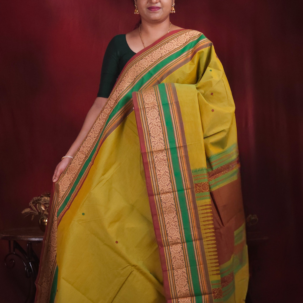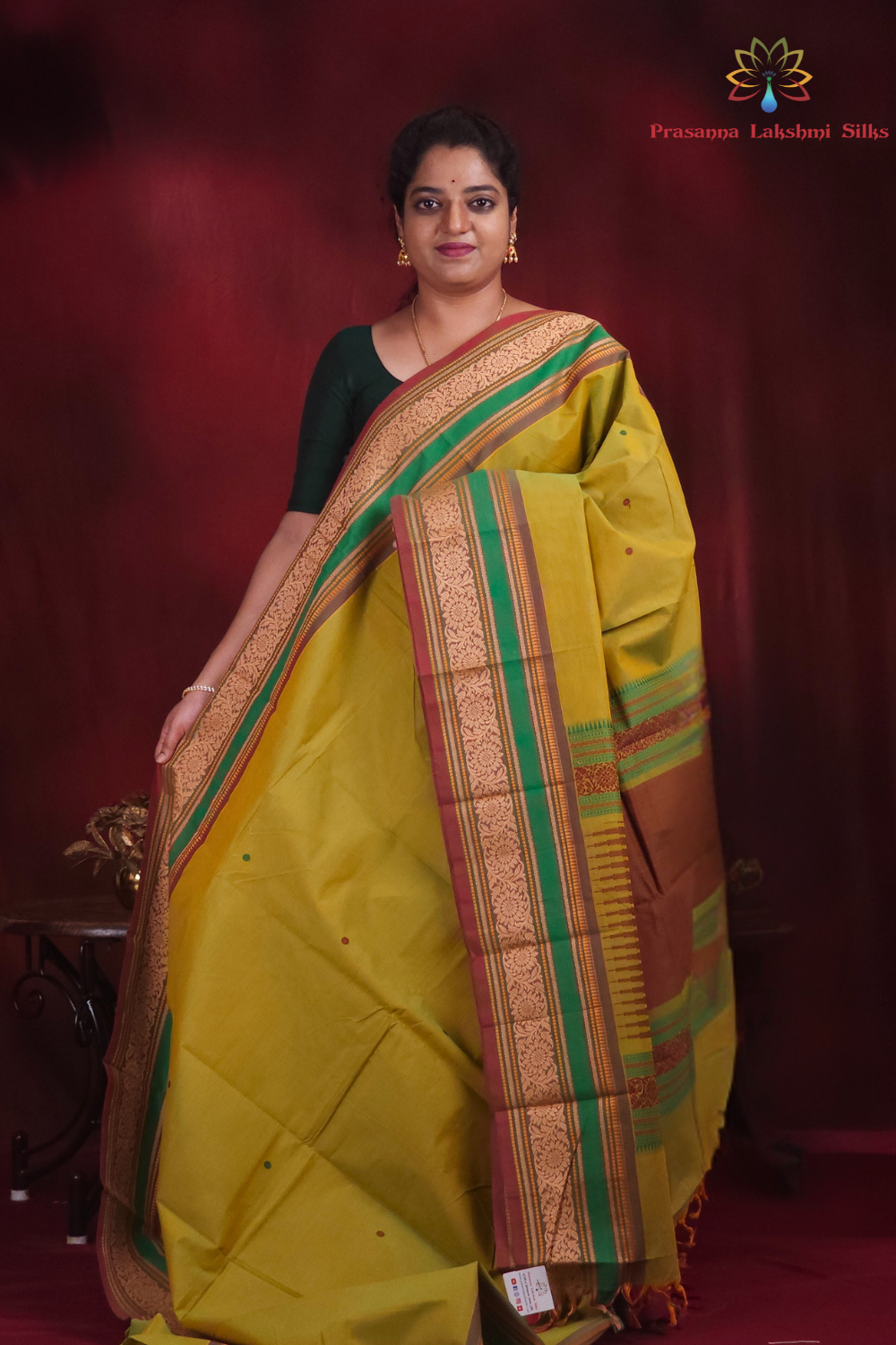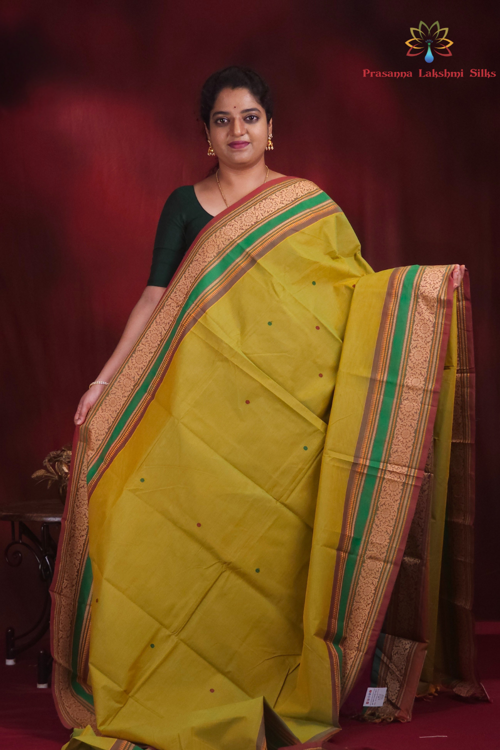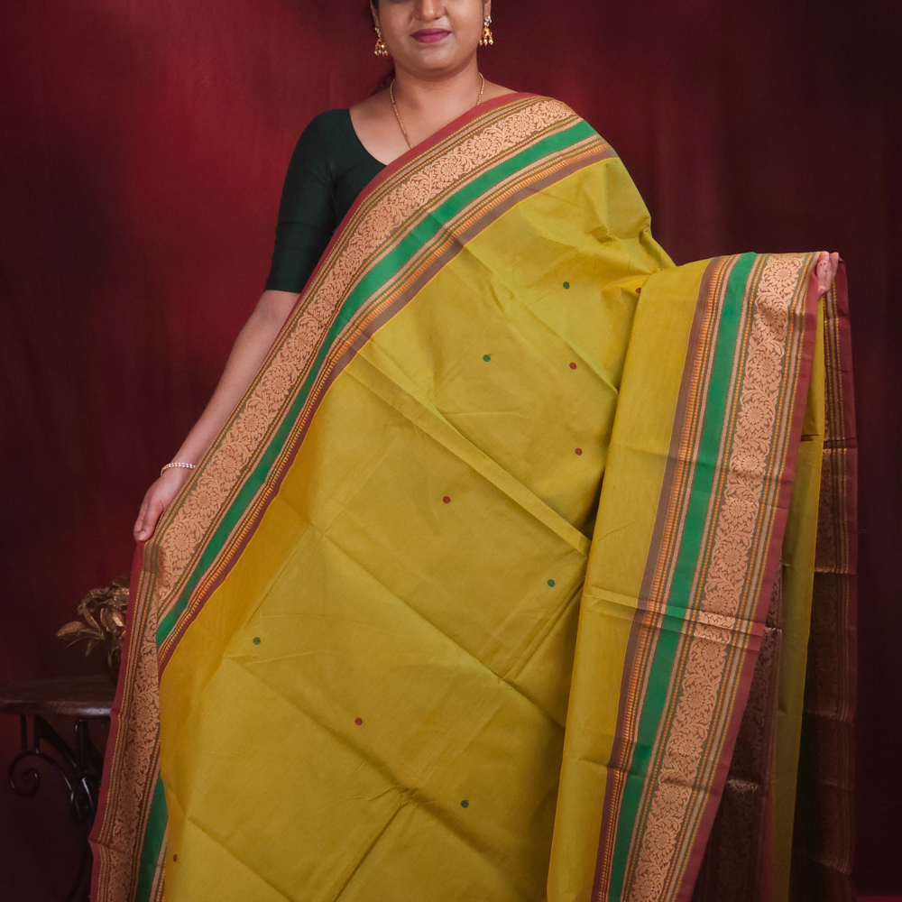 Experience the beauty of Handloom Pure Kanjeevaram Cotton Saree allover small buttas with elegantly designed thread woven floral borders rich thread woven brocade pallu paired with running blouse......
