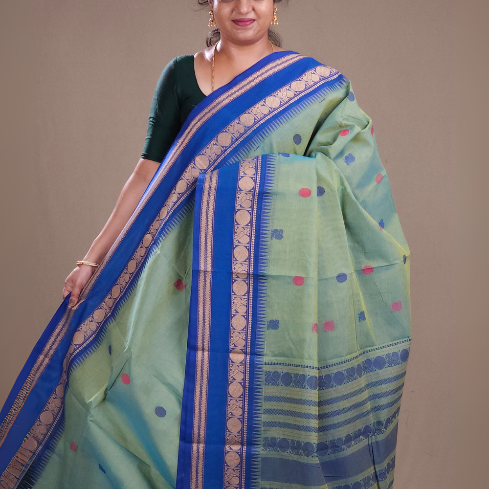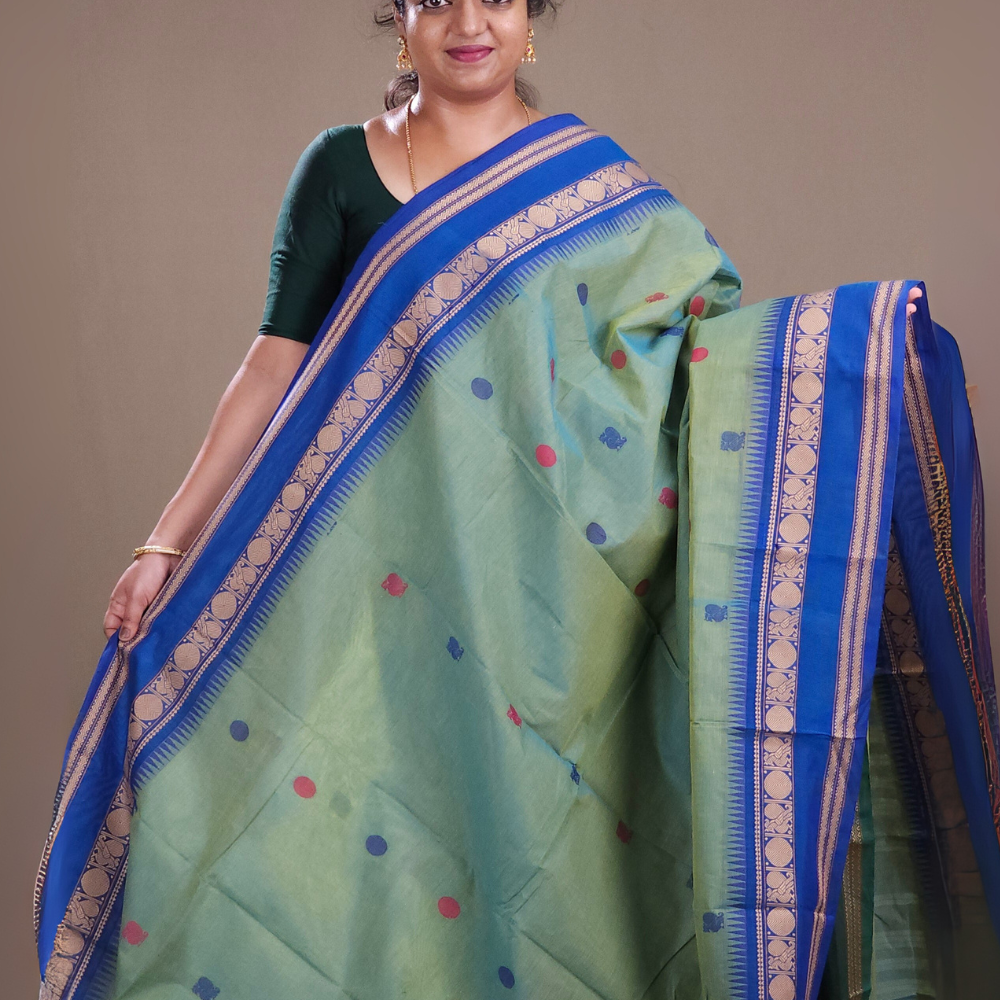 Elevate your style with our stunning Handloom Kanchi Cotton Saree allover thread woven motifs with equisite thread woven gap borders, Rich pallu paired with running blouse...