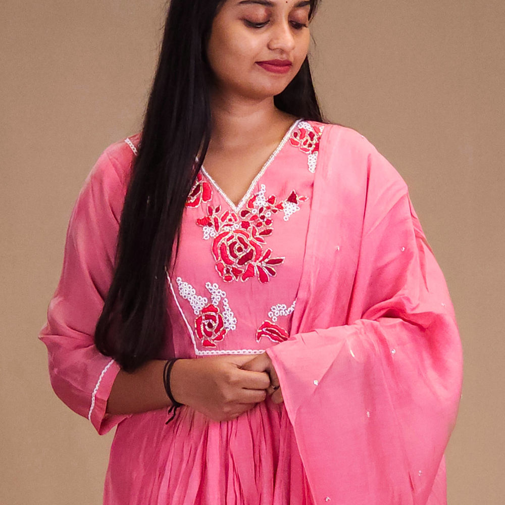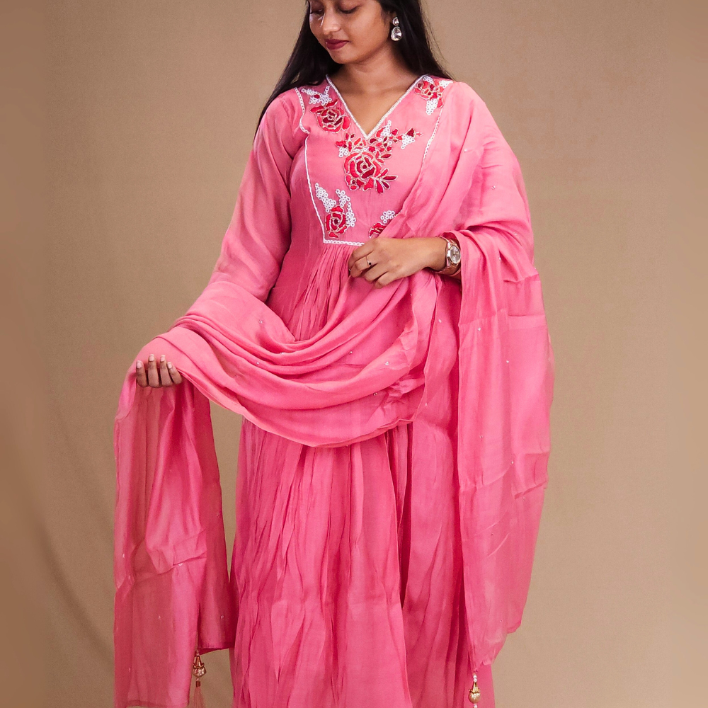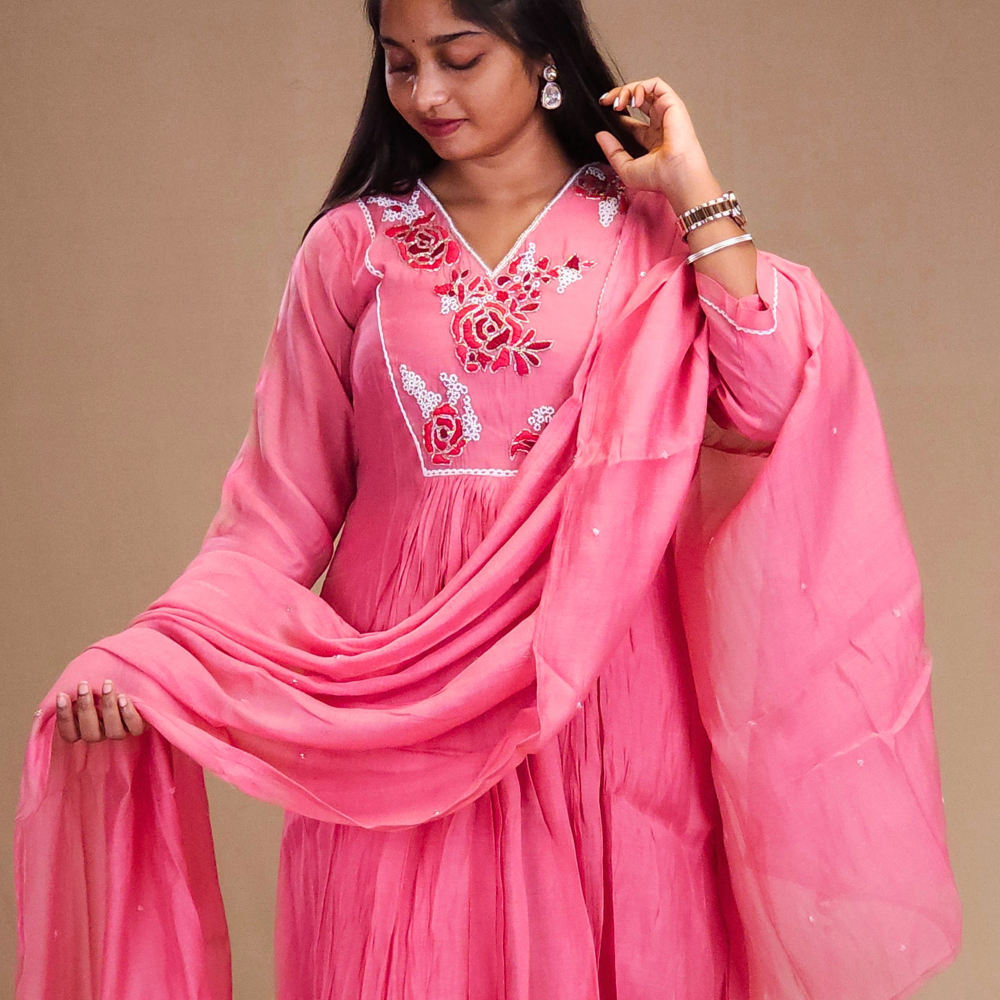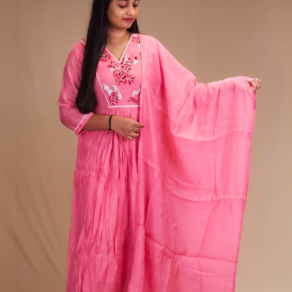 Step into elegance with our Mul Chanderi Suit Set in a graceful frock-style. Designed with a stylish V-neckline adorned with rich threadwork & beadwork in floral bunches with a lace detailing Paired with straight-cut pant and dupatta with small beads work.....
