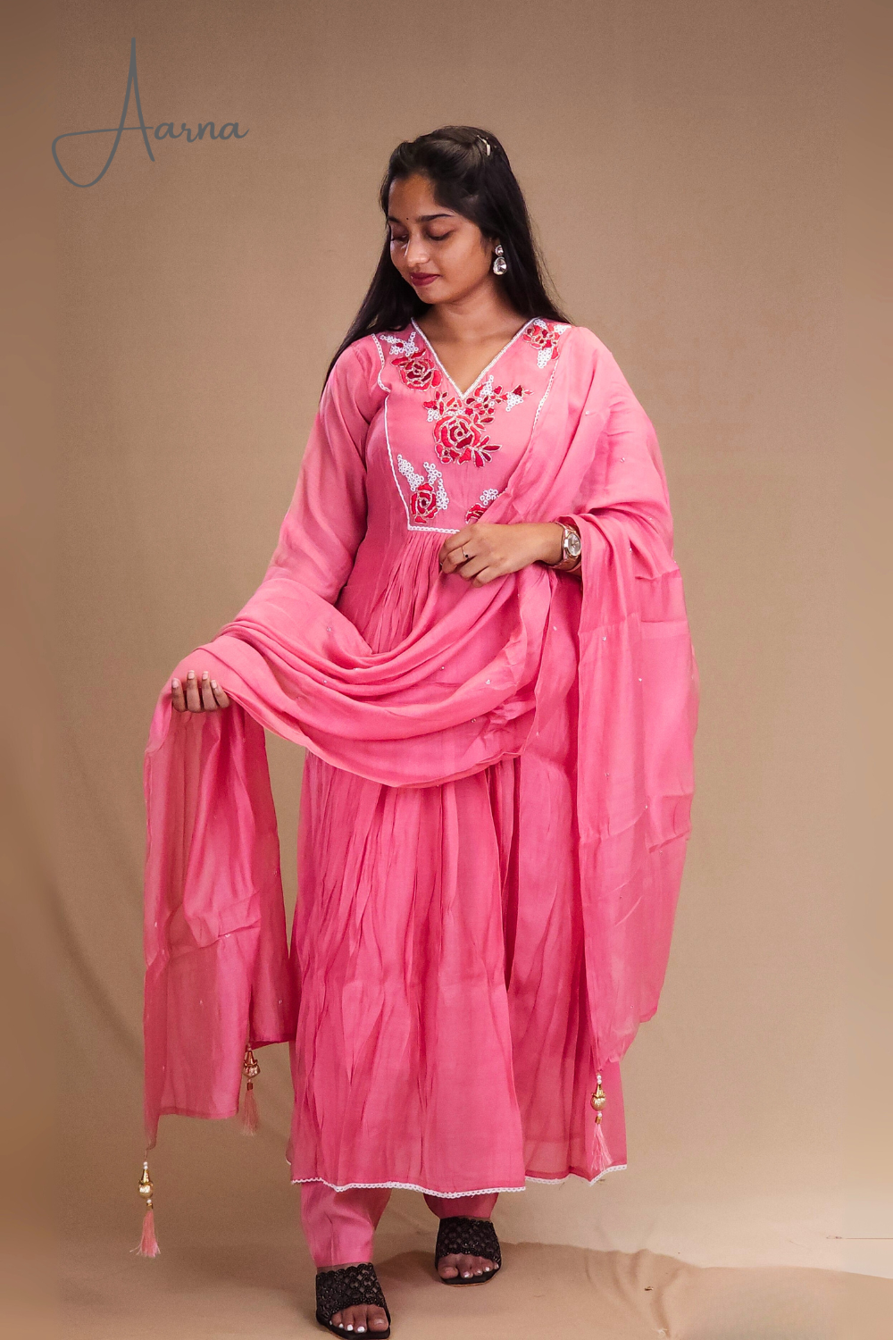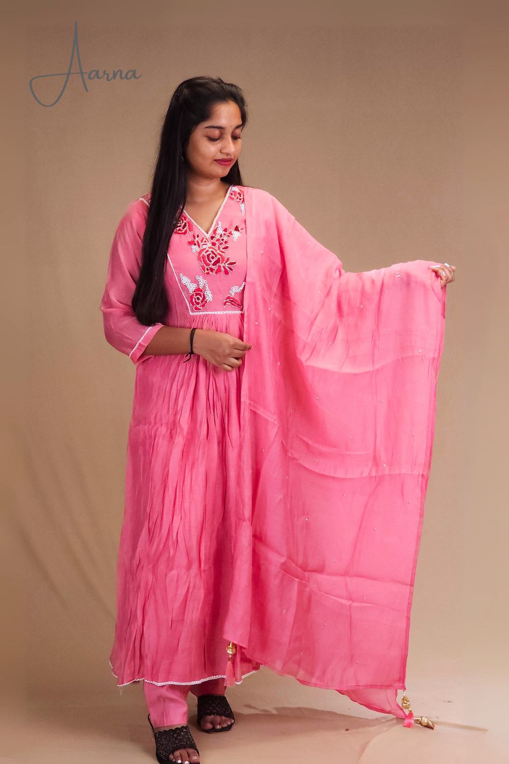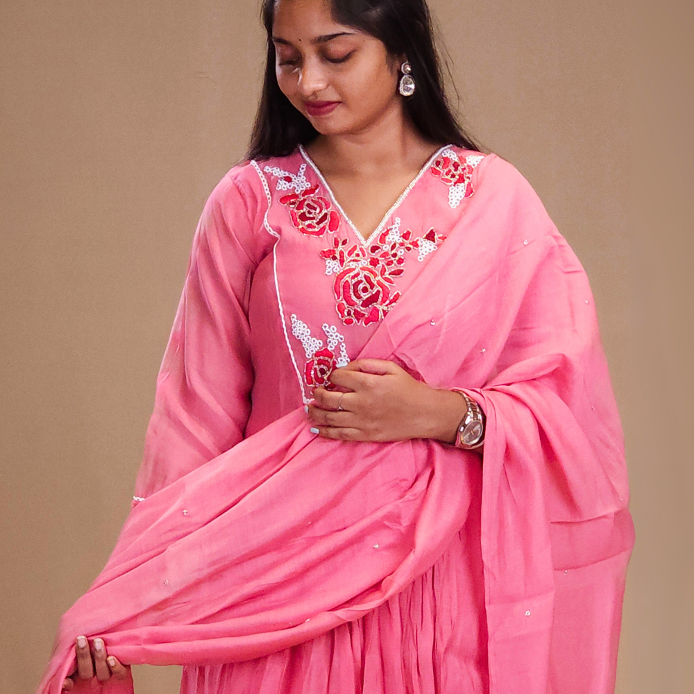 Step into elegance with our Mul Chanderi Suit Set in a graceful frock-style. Designed with a stylish V-neckline adorned with rich threadwork & beadwork in floral bunches with a lace detailing Paired with straight-cut pant and dupatta with small beads work.....
