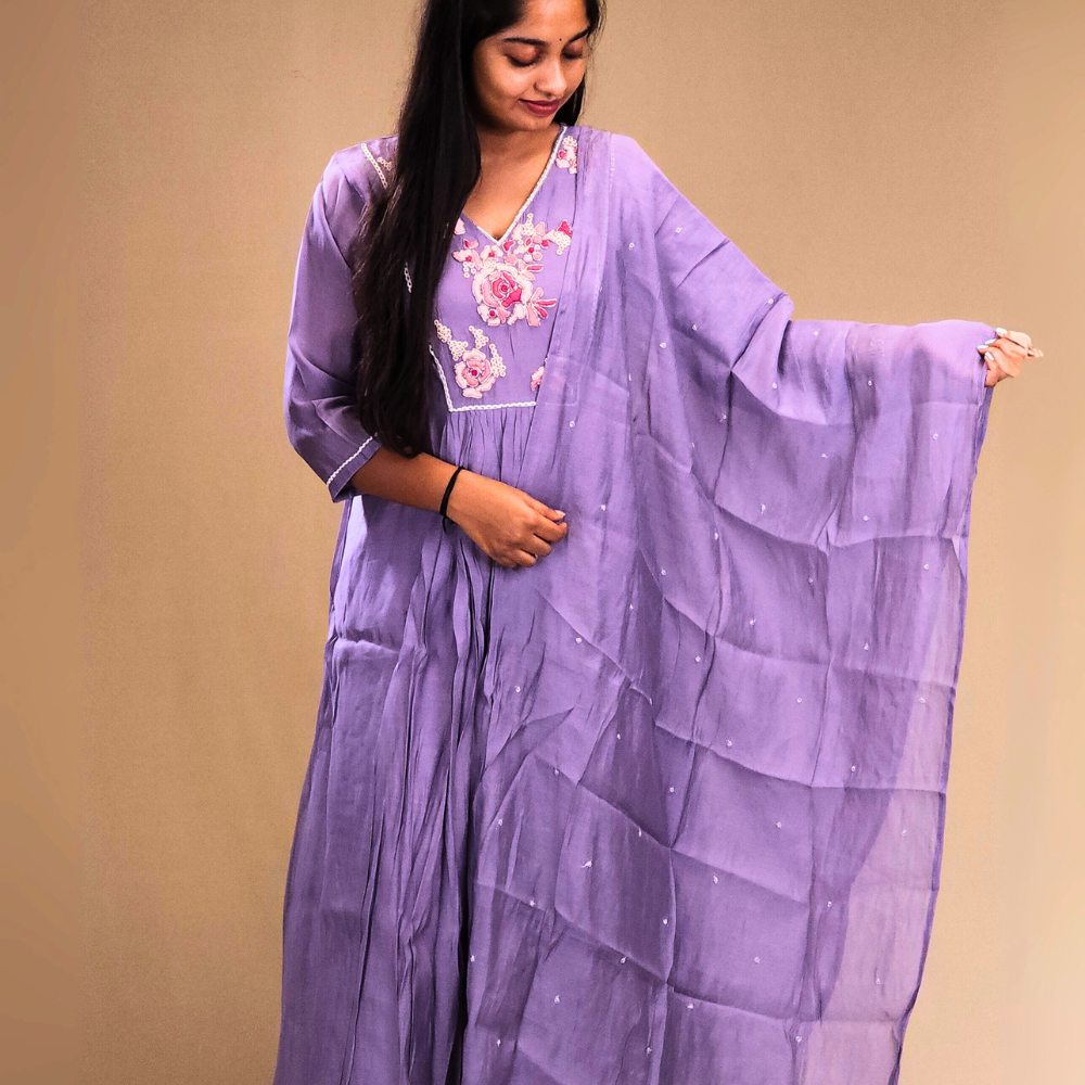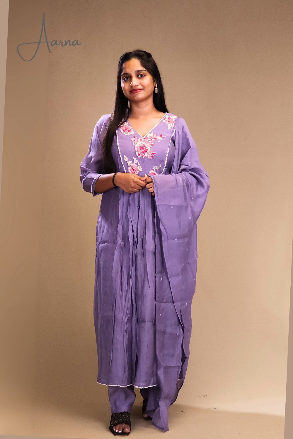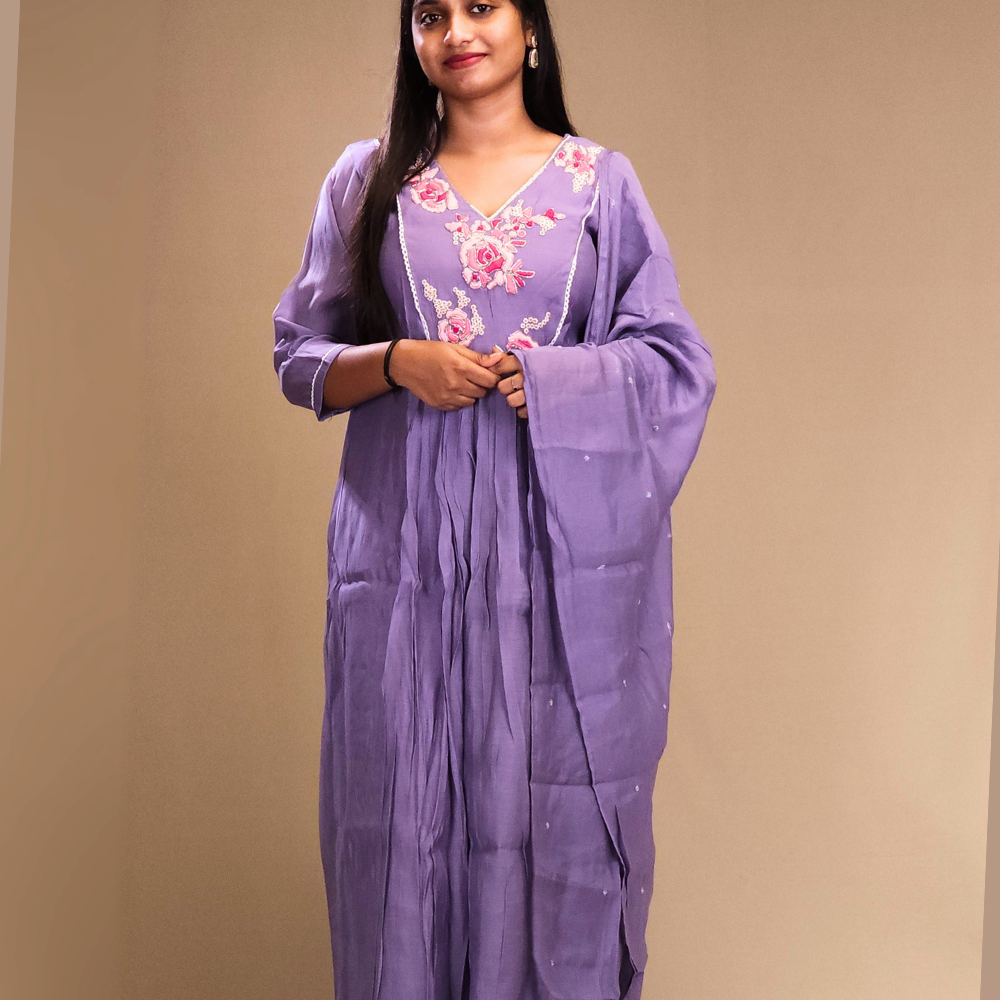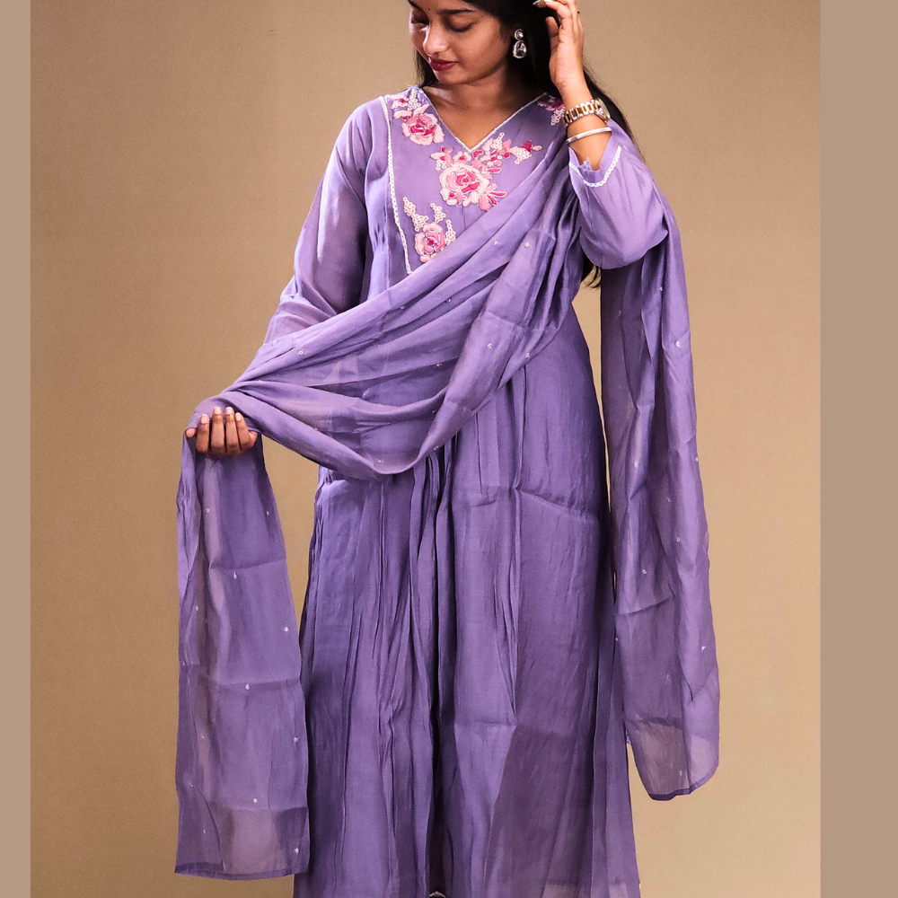 Step into elegance with our Mul Chanderi Suit Set in a graceful frock-style. Designed with a stylish V-neckline adorned with rich threadwork & beadwork in floral bunches with a lace detailing Paired with straight-cut pant and dupatta with small beads work.....