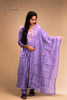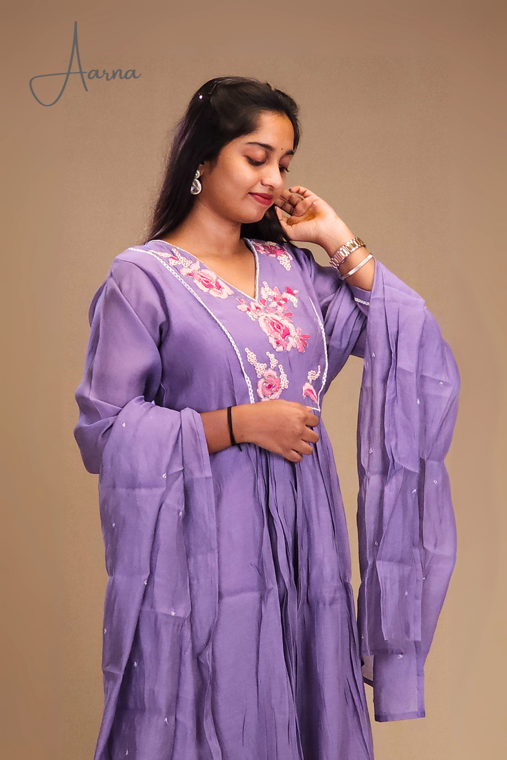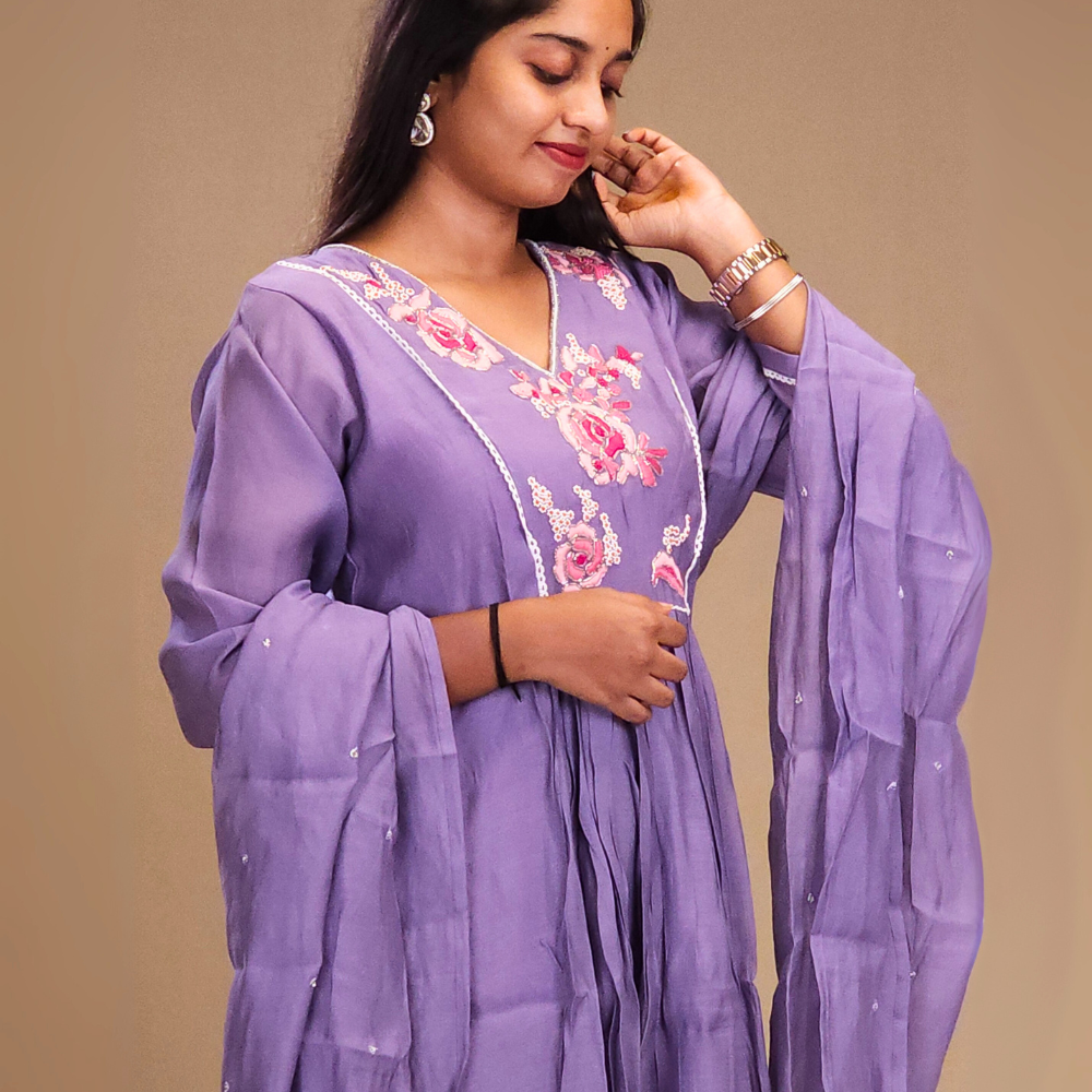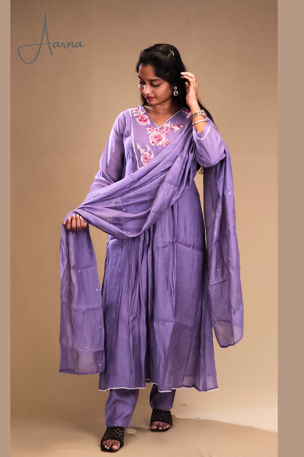 Step into elegance with our Mul Chanderi Suit Set in a graceful frock-style. Designed with a stylish V-neckline adorned with rich threadwork & beadwork in floral bunches with a lace detailing Paired with straight-cut pant and dupatta with small beads work.....
