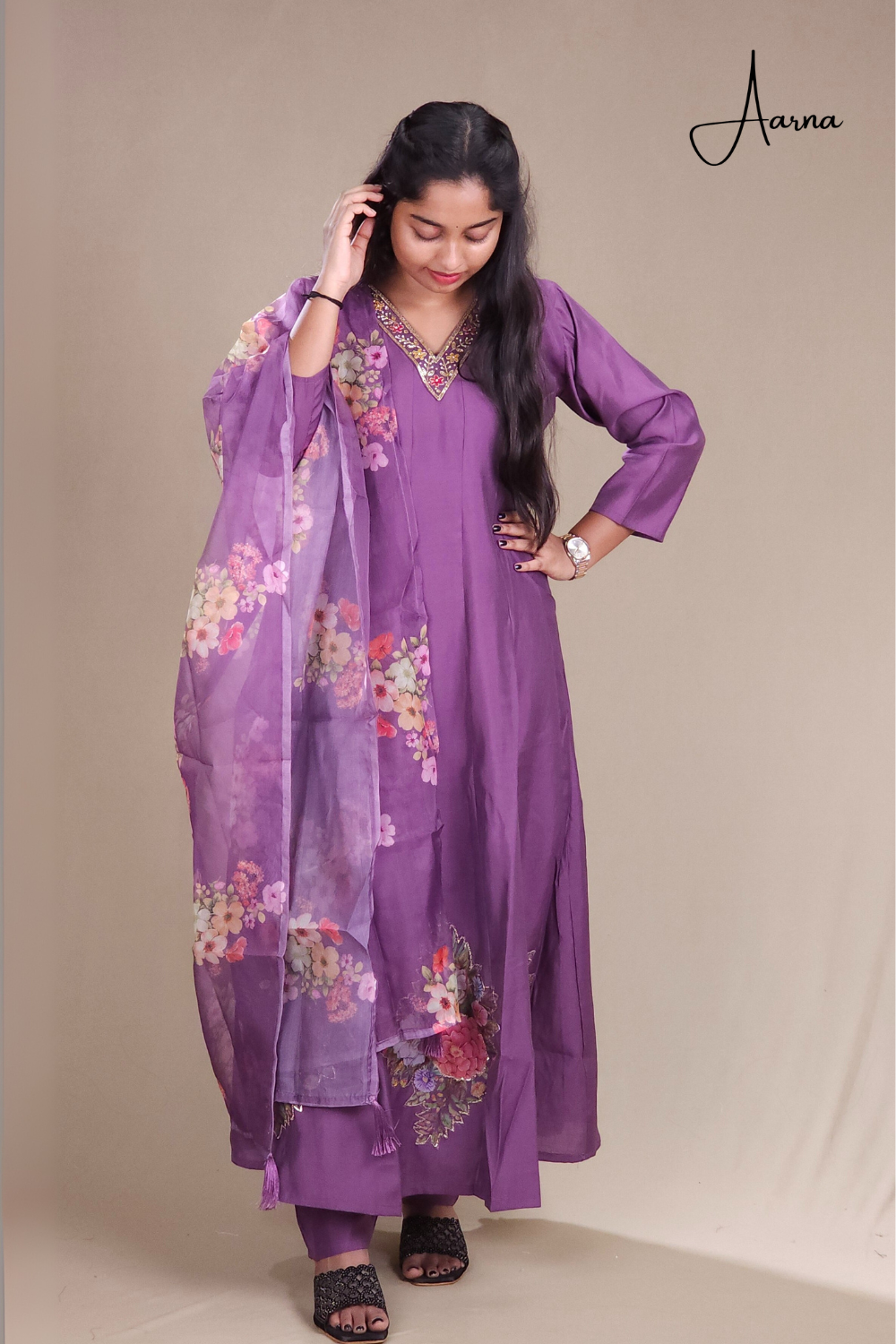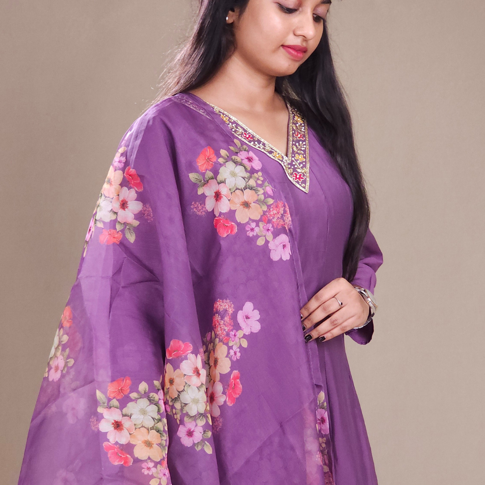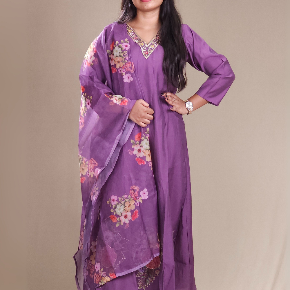 Step into elegance with our Mul Chanderi Suit Set in a graceful frock-style. Designed with a stylish V-neckline adorned with beadwork,digital printed flower bunches for a charming touch.Paired with straight-cut pant and floral organza dupatta....