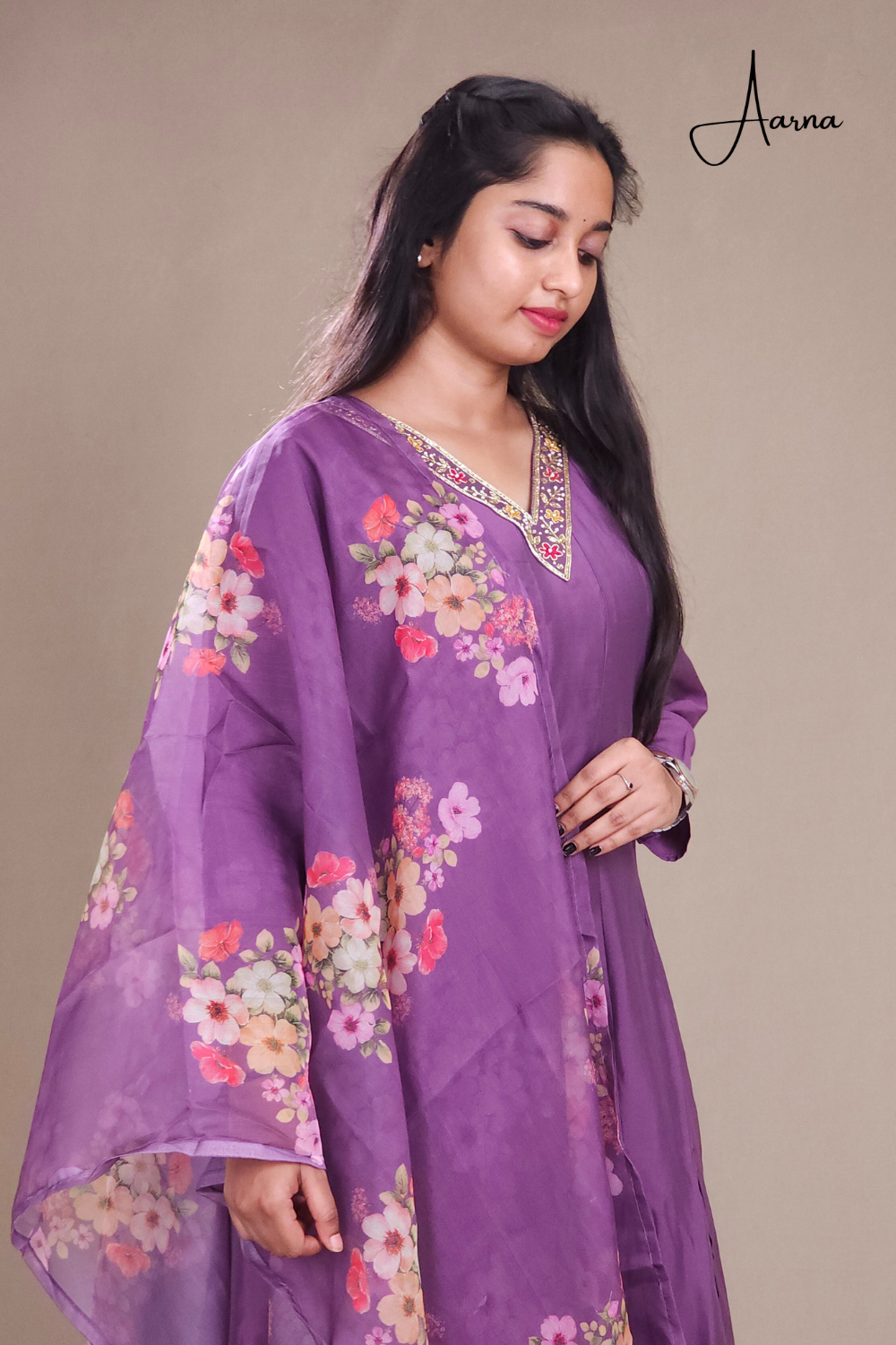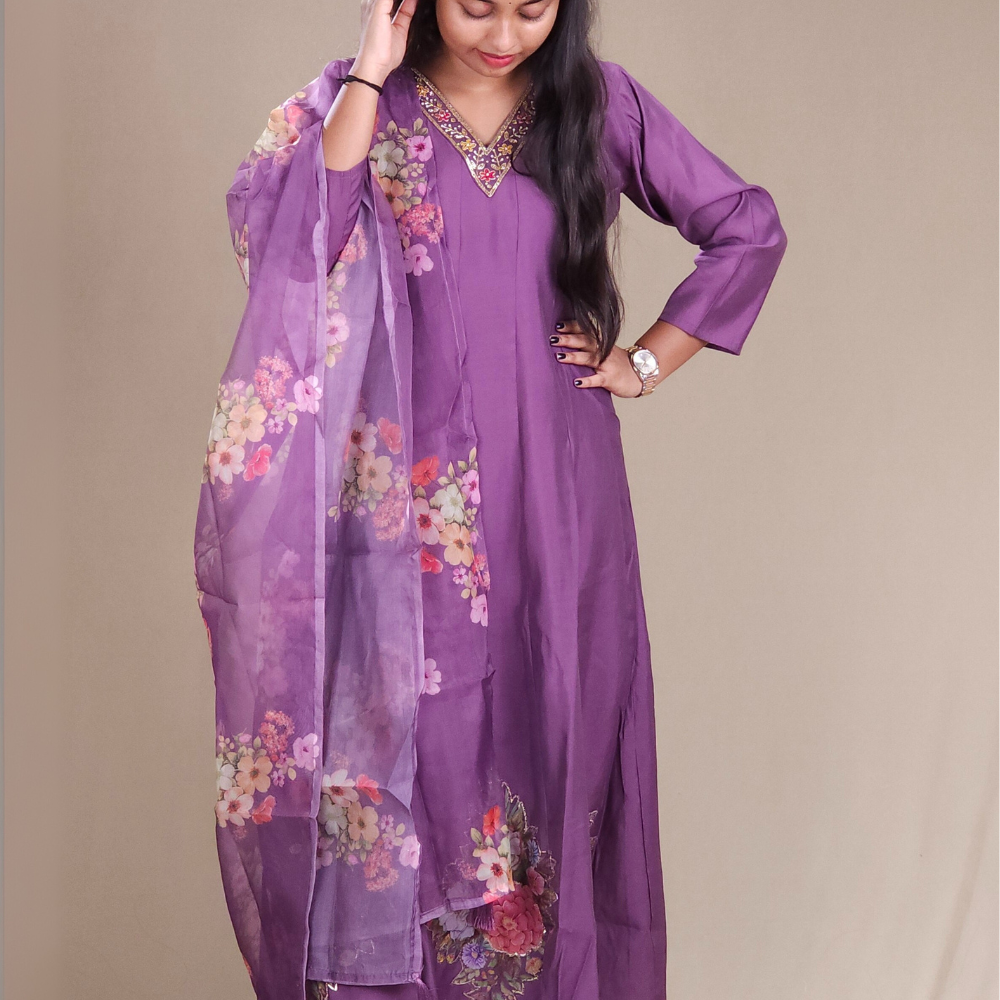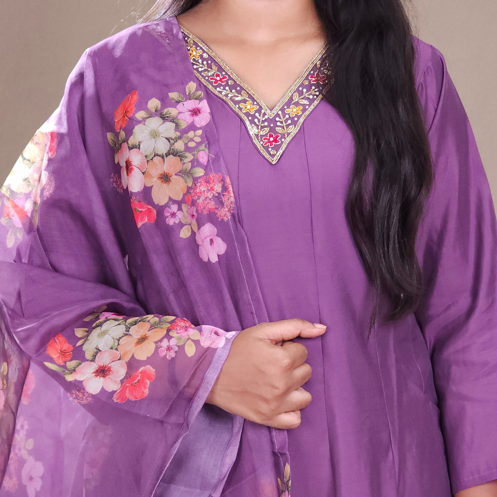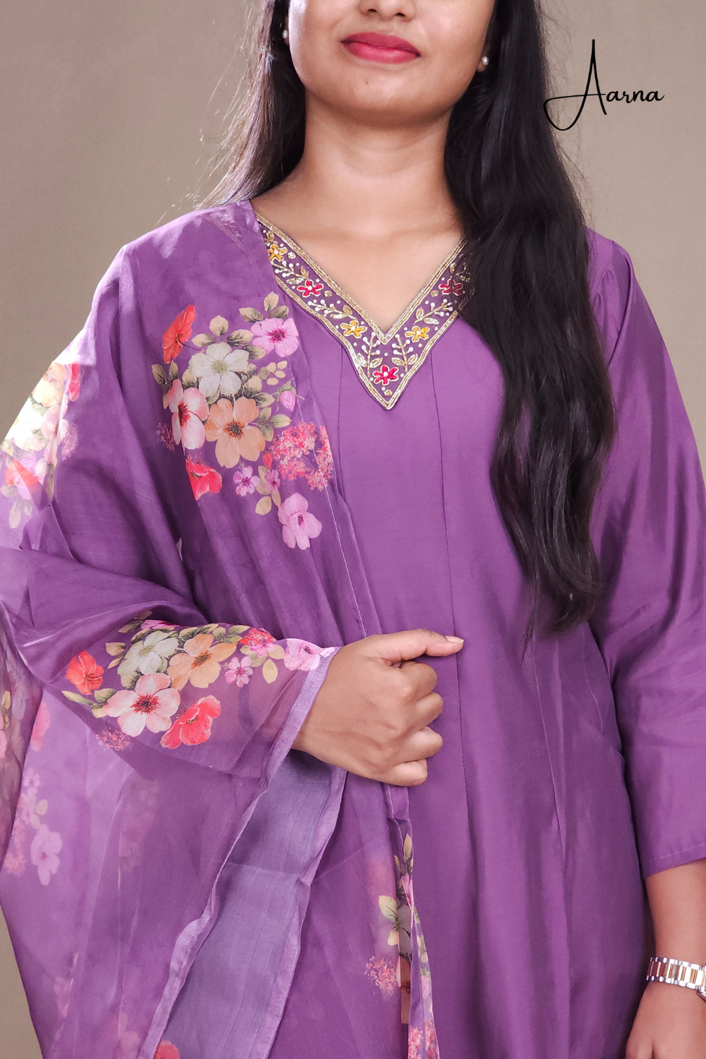 Step into elegance with our Mul Chanderi Suit Set in a graceful frock-style. Designed with a stylish V-neckline adorned with beadwork,digital printed flower bunches for a charming touch.Paired with straight-cut pant and floral organza dupatta....