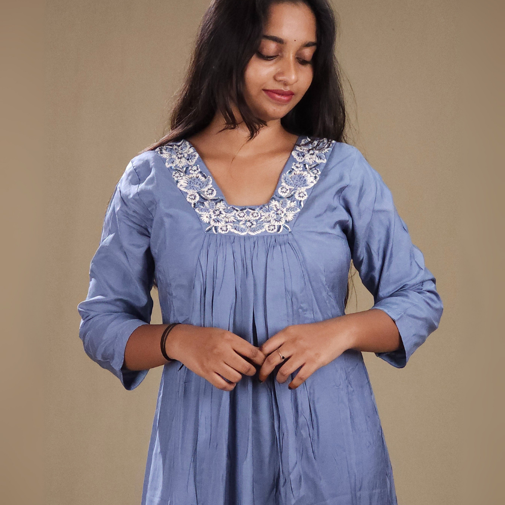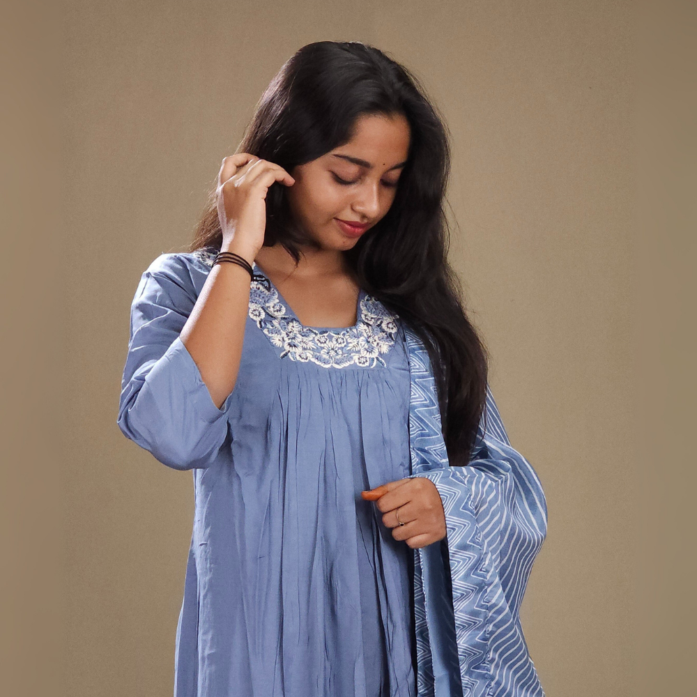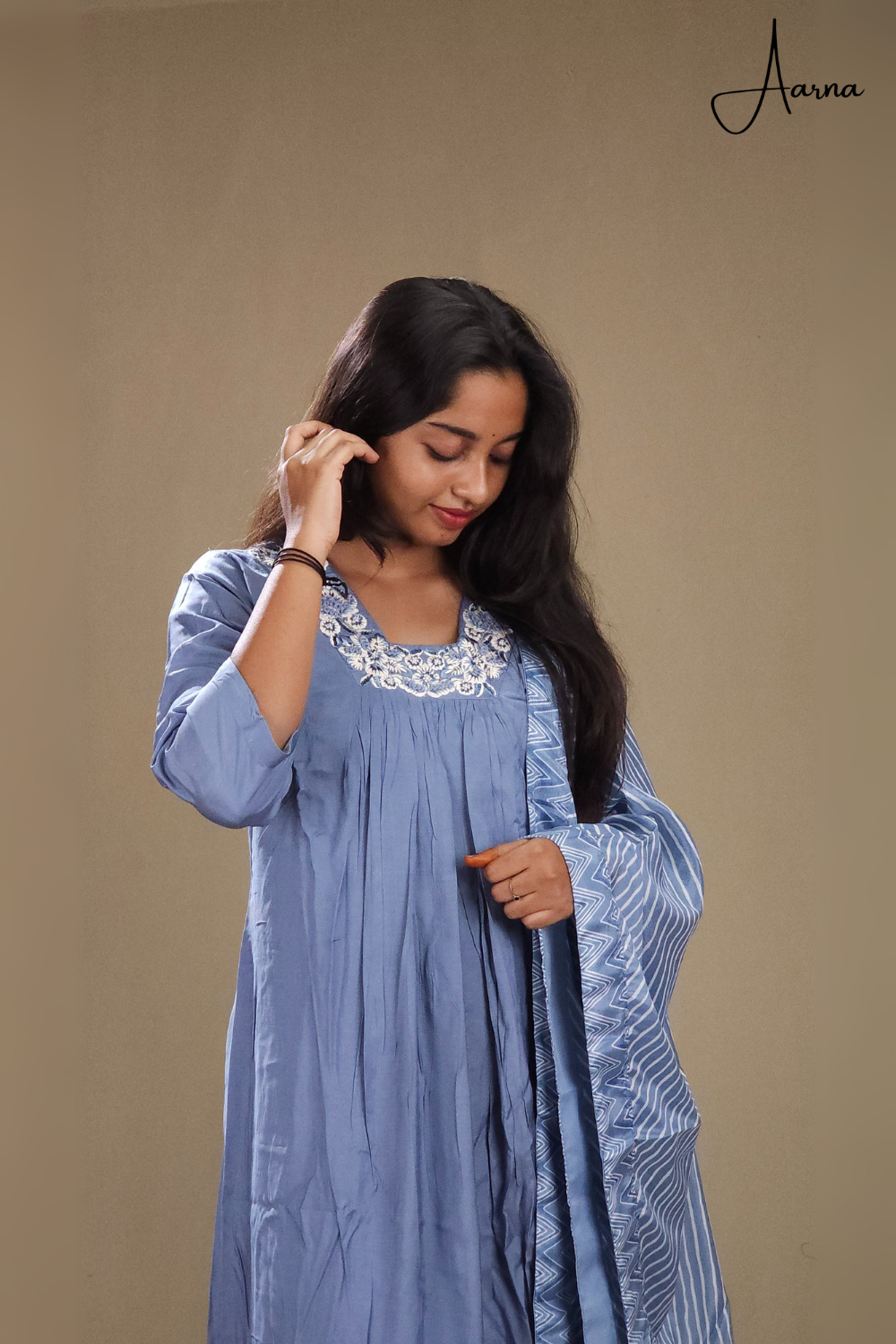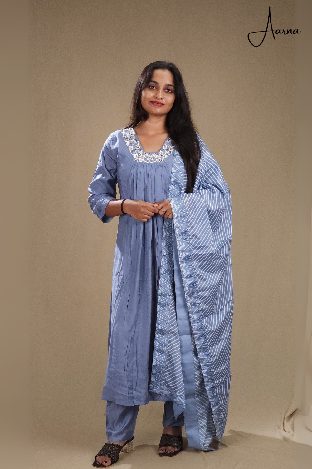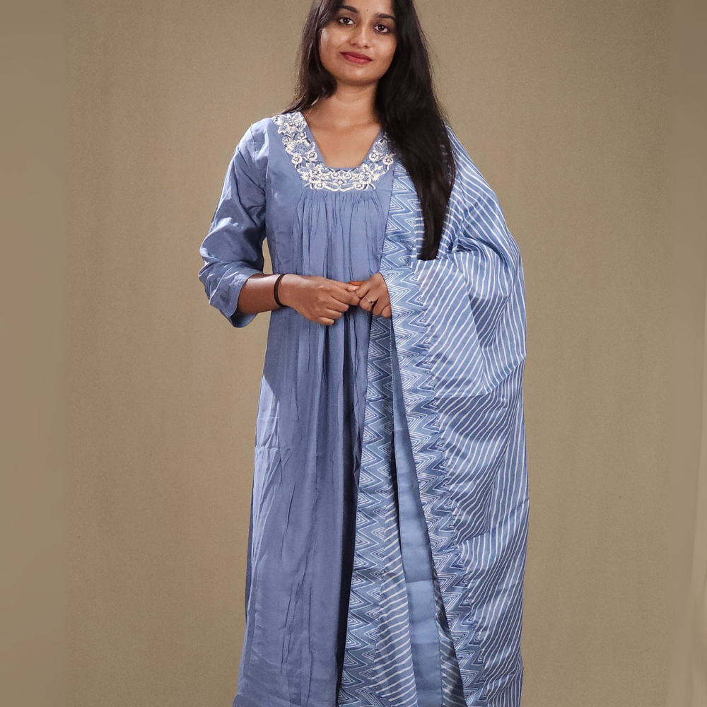 Experience the luxury of Crepe Chiffon suit with beads and thread work on neckline, straight-cut pant, and contrast dupatta . Perfect for festive flair!