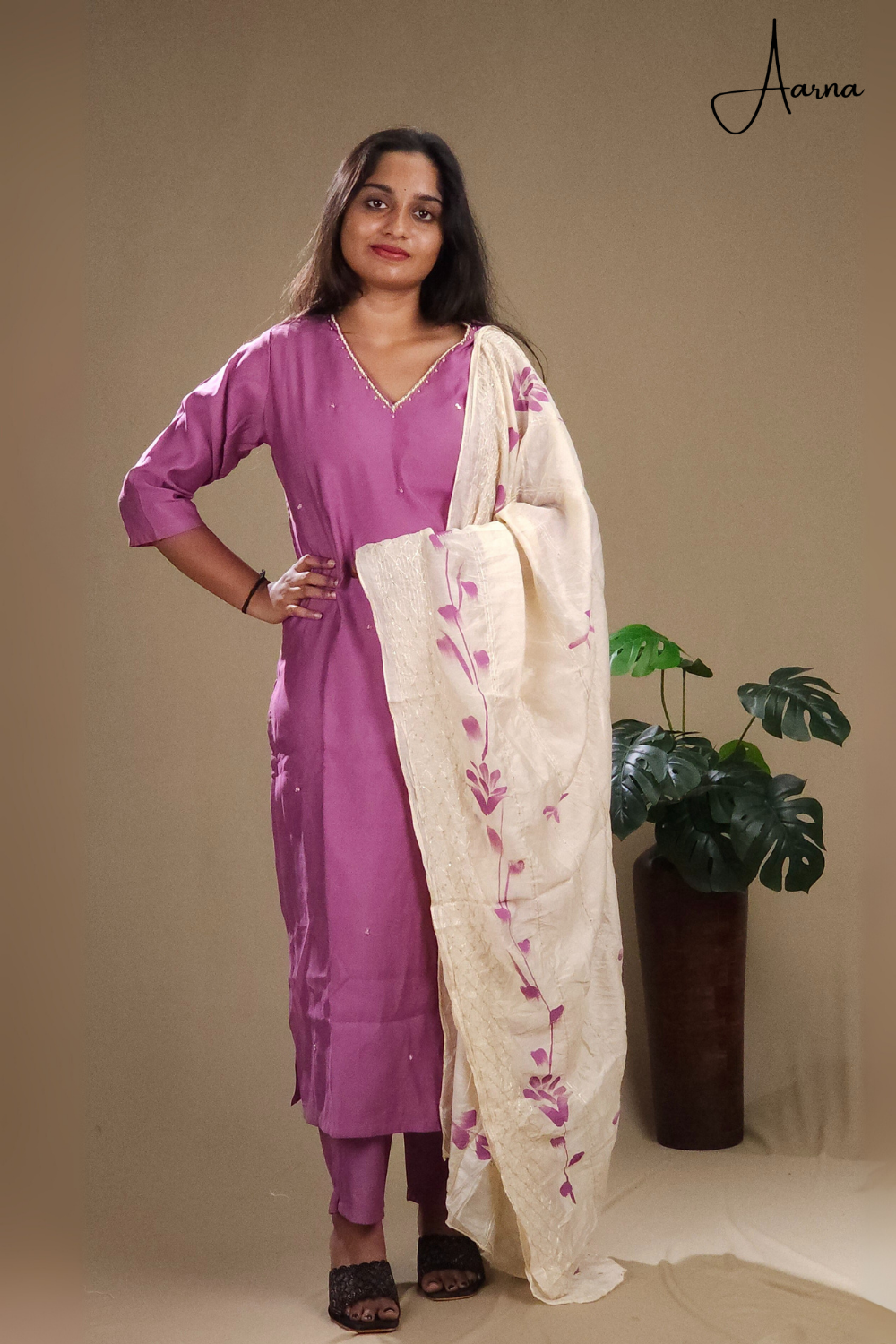 Chanderi silk suit with elegant beads & stylish V-neck on neckline, straight-cut pant, and a two-shaded dupatta with sequin highlights. Perfect for festive flair!
