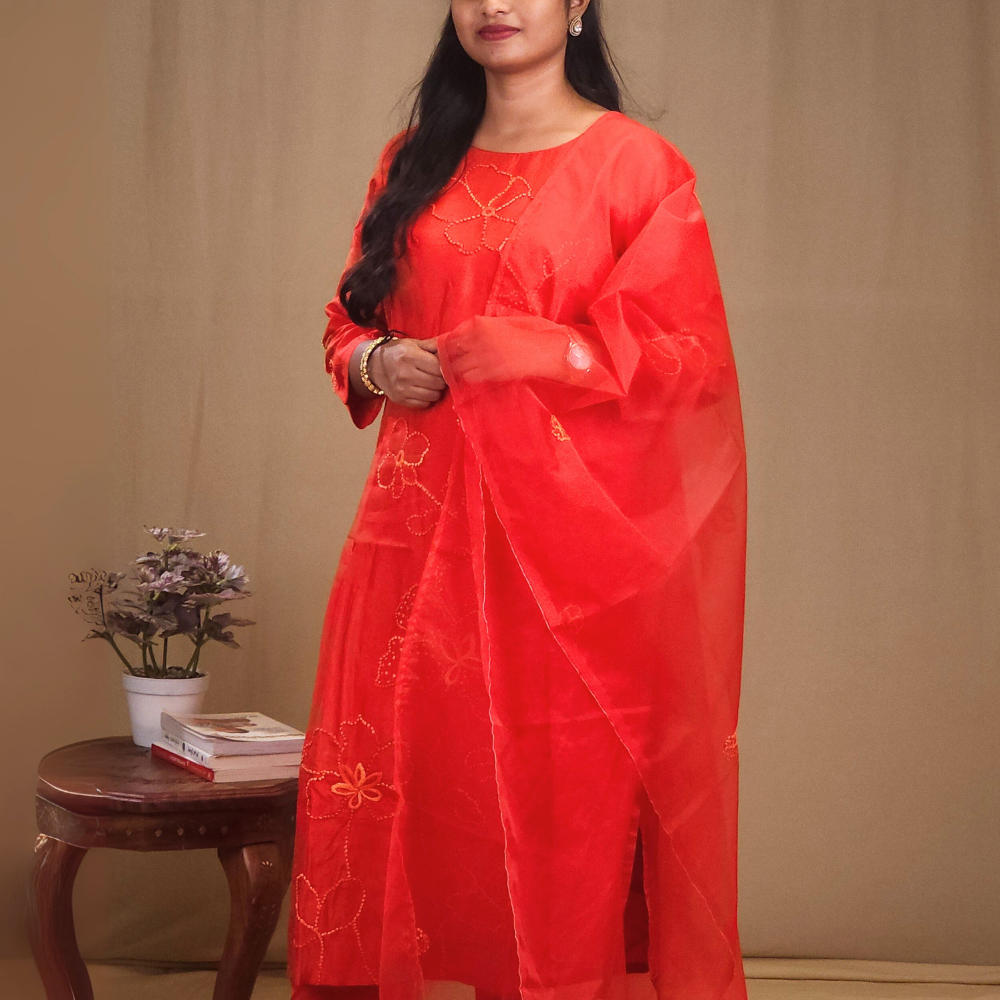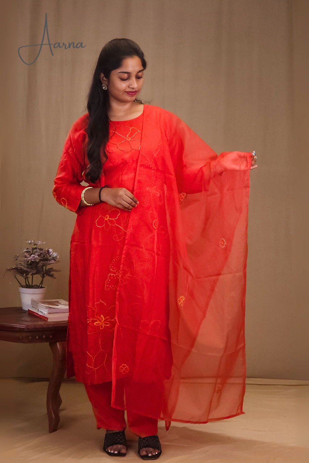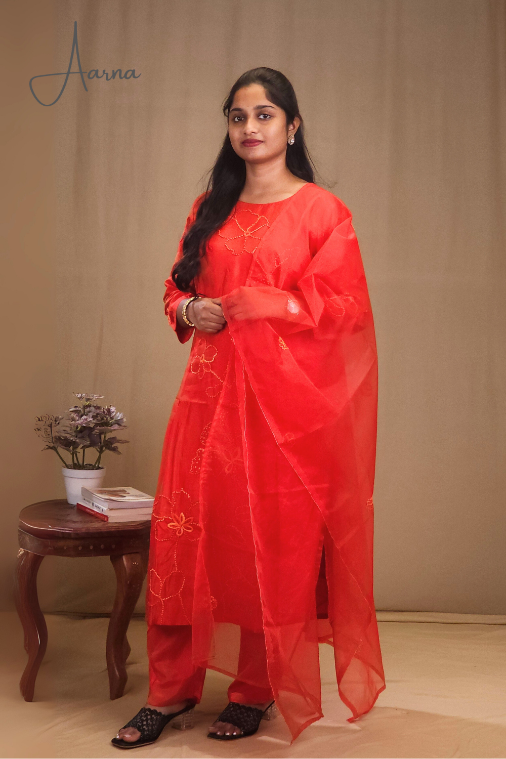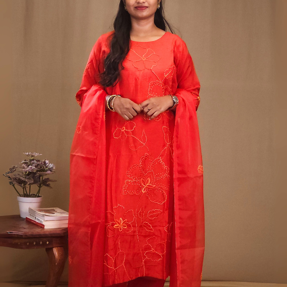 Experience the comfort of Chanderi silk suit allover french knot floral thread work, straight-cut pant, paired with floral organza dupatta. Perfect for festive flair!