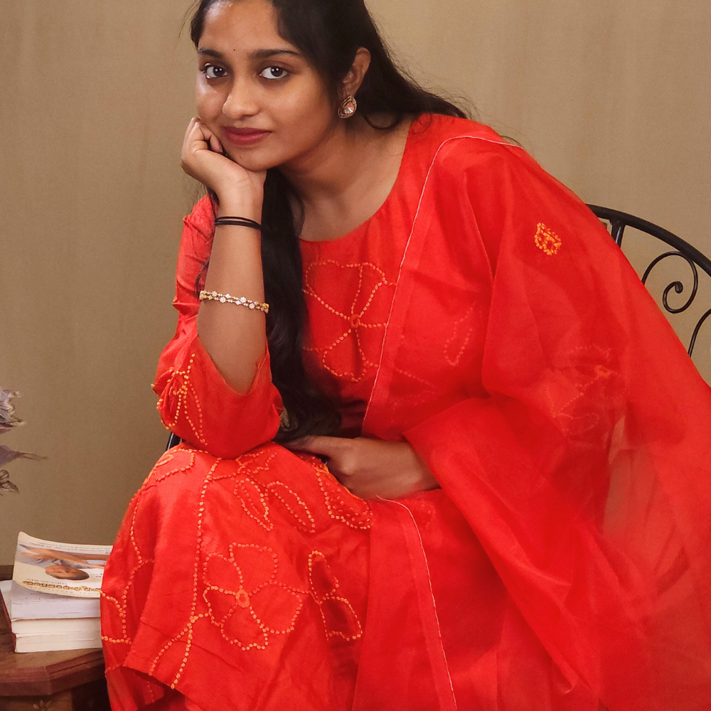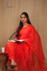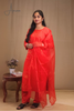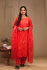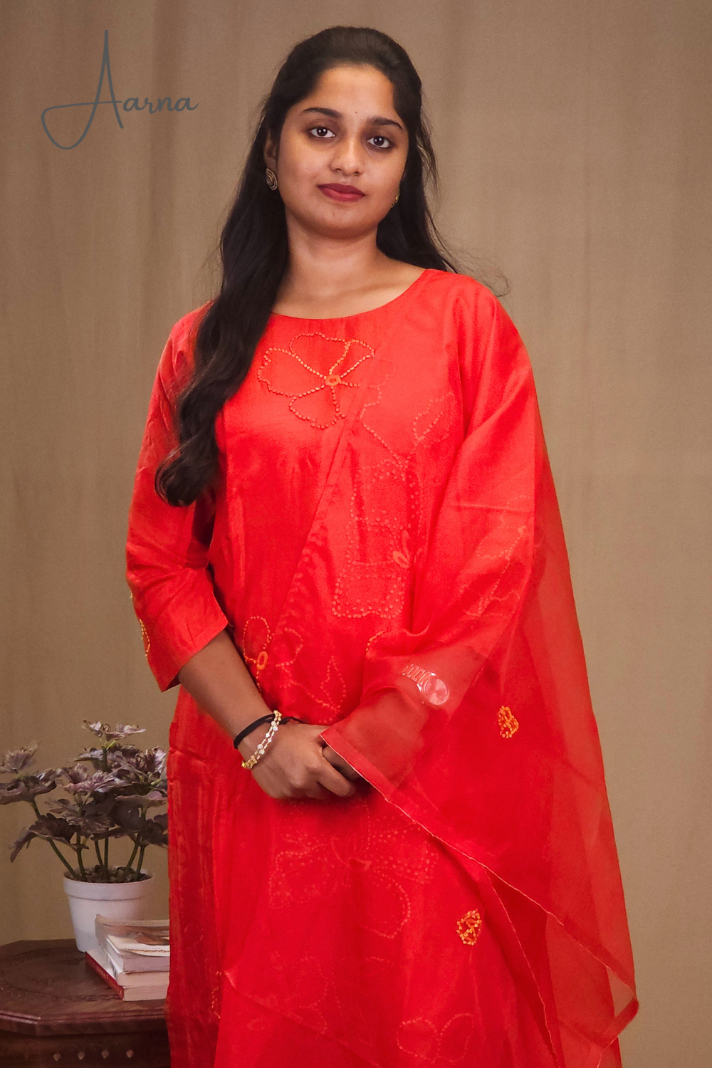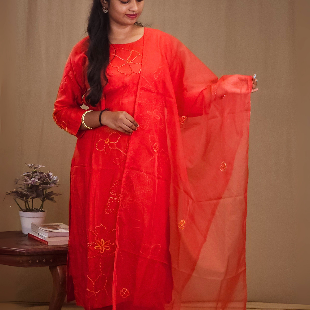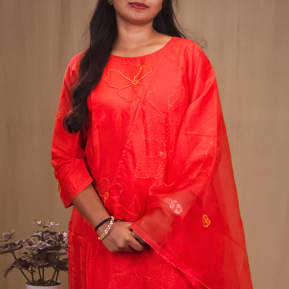 Experience the comfort of Chanderi silk suit allover french knot floral thread work, straight-cut pant, paired with floral organza dupatta. Perfect for festive flair!