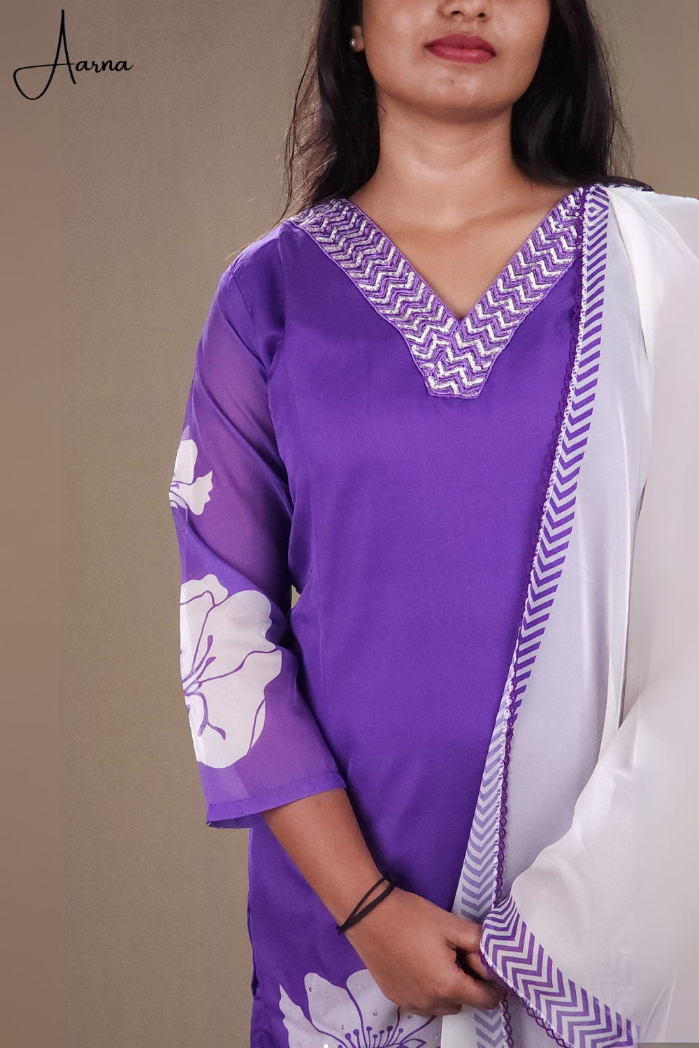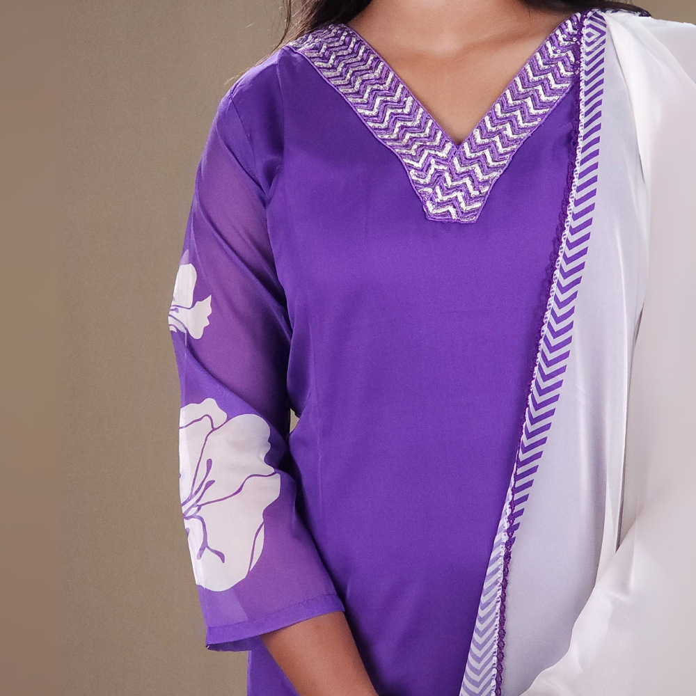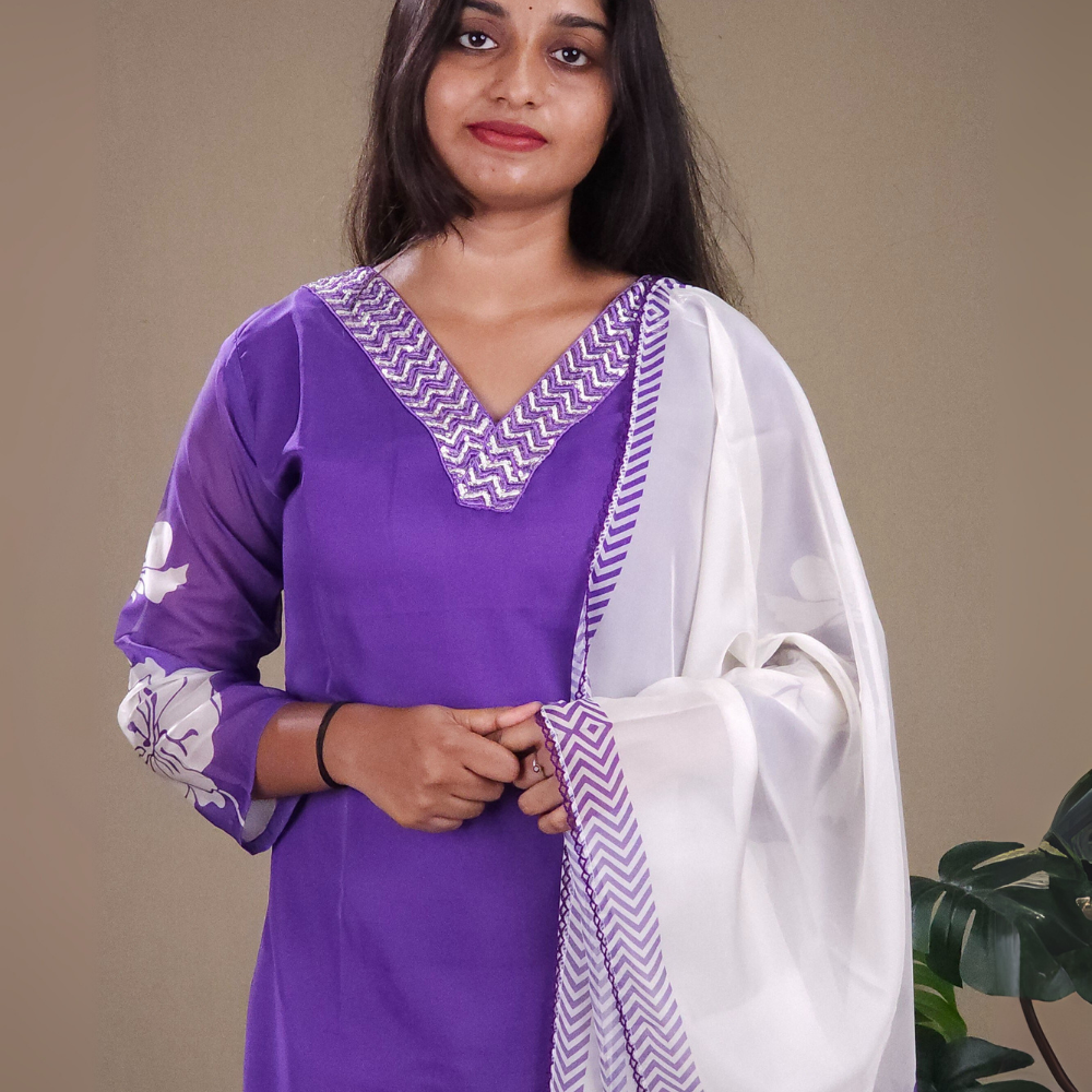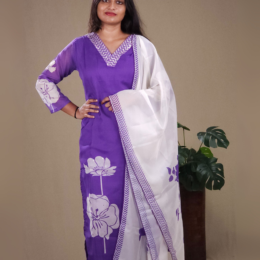 Soft Organza Suit floral digital prints, elegant beads with sequence work V - neckline and a straight-cut pant . Paired with a beautifully crafted dupatta, this ensemble offers comfort and sophistication for any occasion."