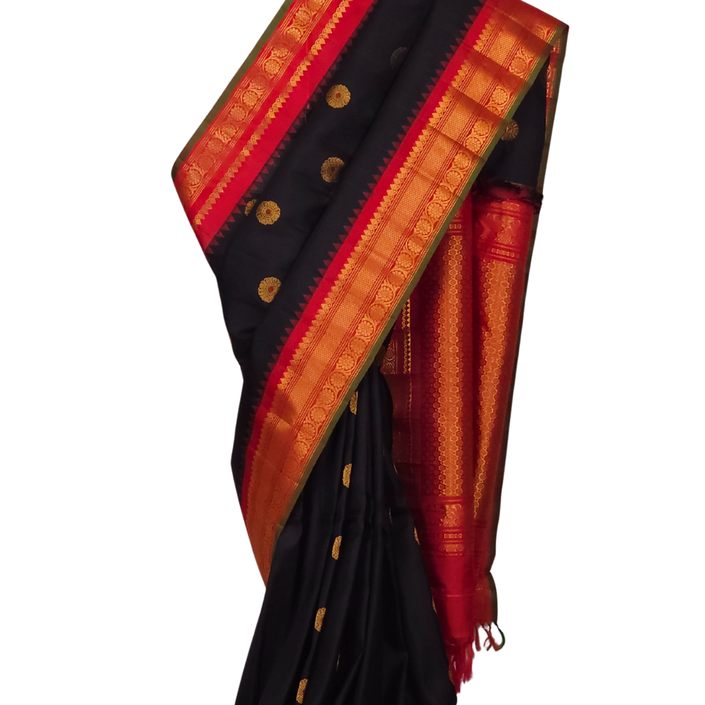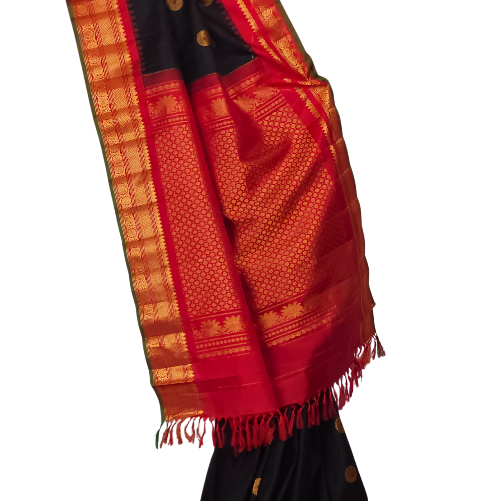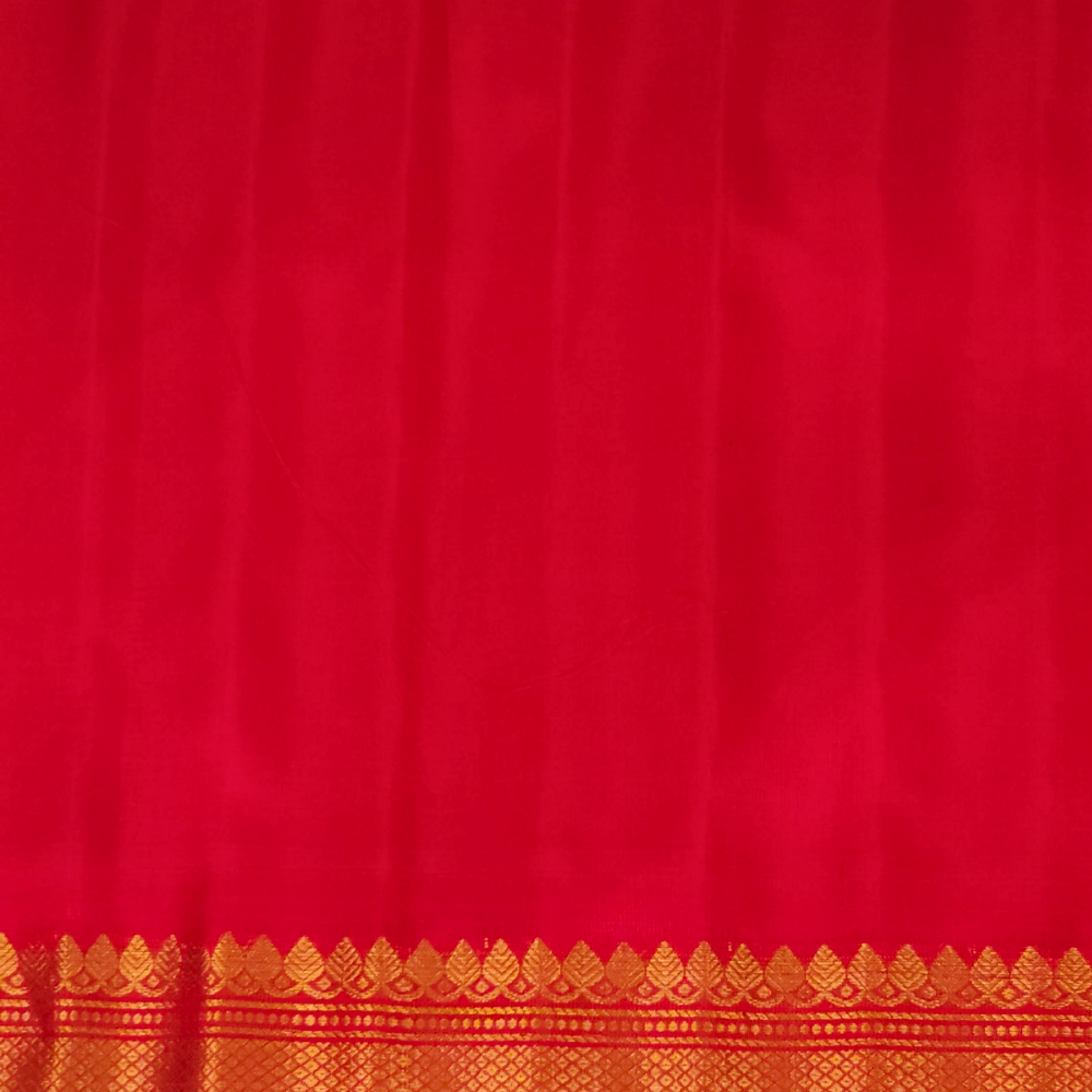 Elevate your elegance with our exquisite Handloom Gadwal Pure Silk Saree, adorned with Intricate zari motifs zari-woven borders Rich zari-woven brocade adorns the pallu, making every drape a statement.