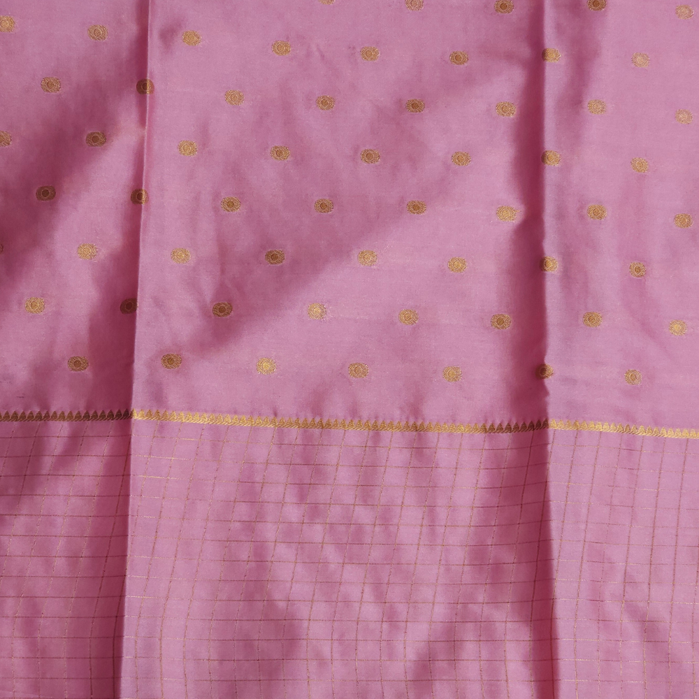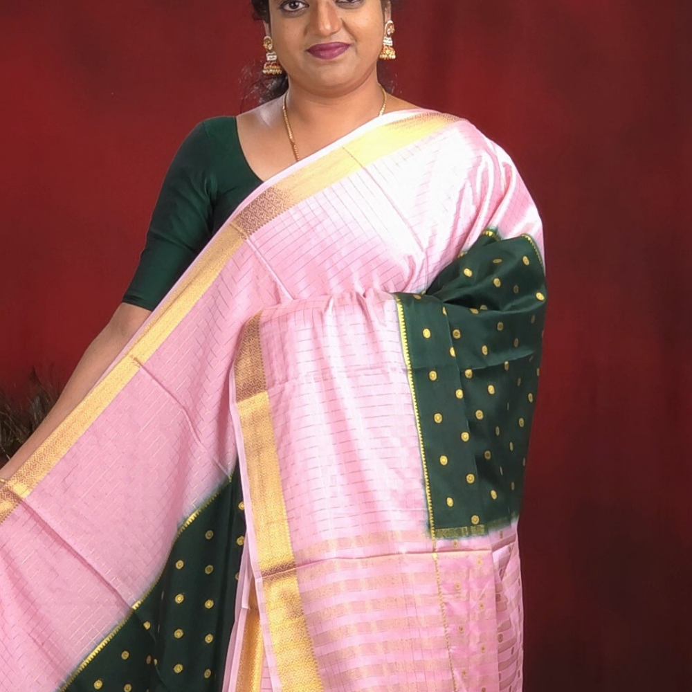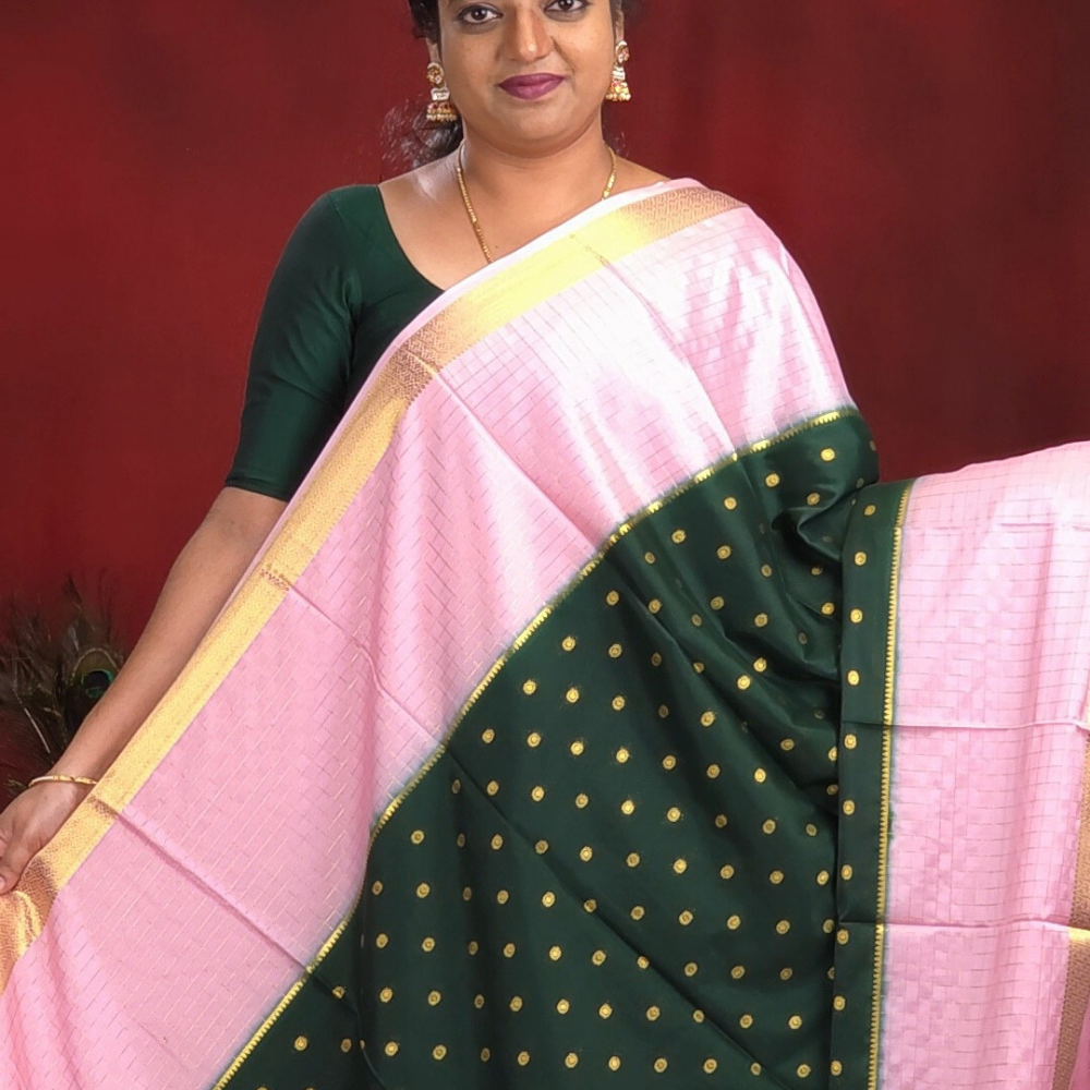 Experience the richness of Semi Mysore silk saree with zari woven motifs all over the saree, complemented by contrast checks borders, paired with contrast tissue stripe pallu and contrast blouse with zari woven motifs.....