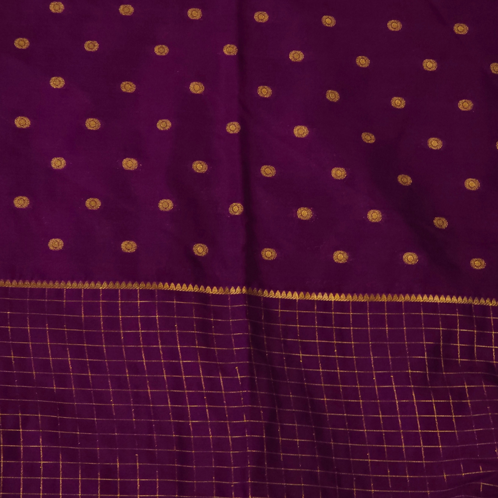 Experience the richness of Semi Mysore silk saree with zari woven motifs all over the saree, complemented by contrast checks borders, paired with contrast tissue stripe pallu and contrast blouse with zari woven motifs.....