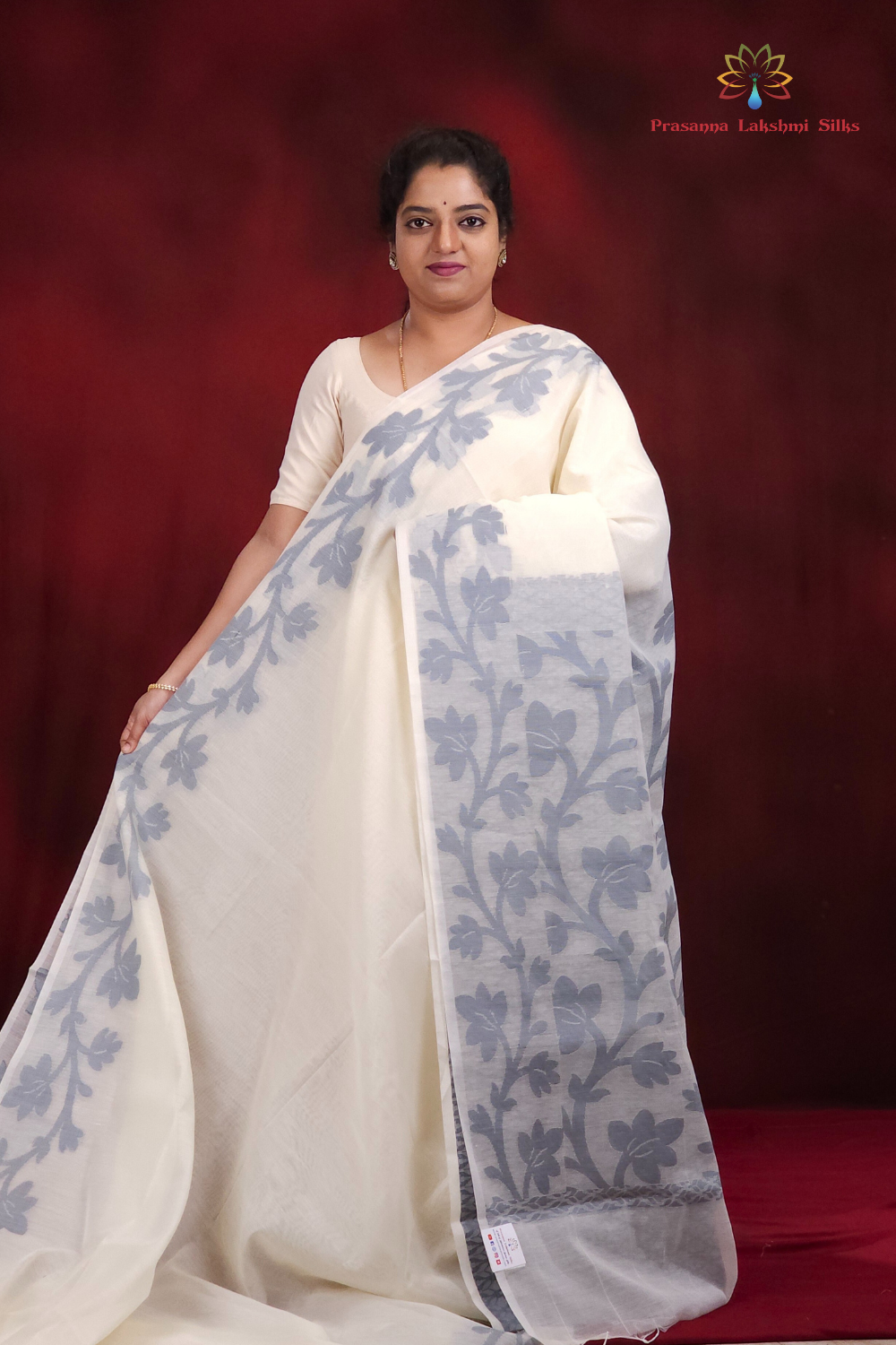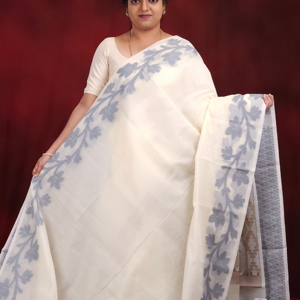 Experience the comfort of Semi muslin jhamdhani sarees with intricate jhamdhani borders ,pallu with tassels paired with contrast brocade blouse.....