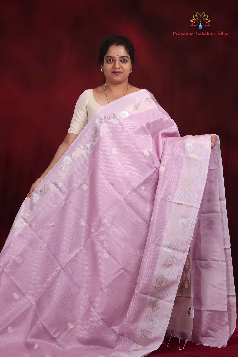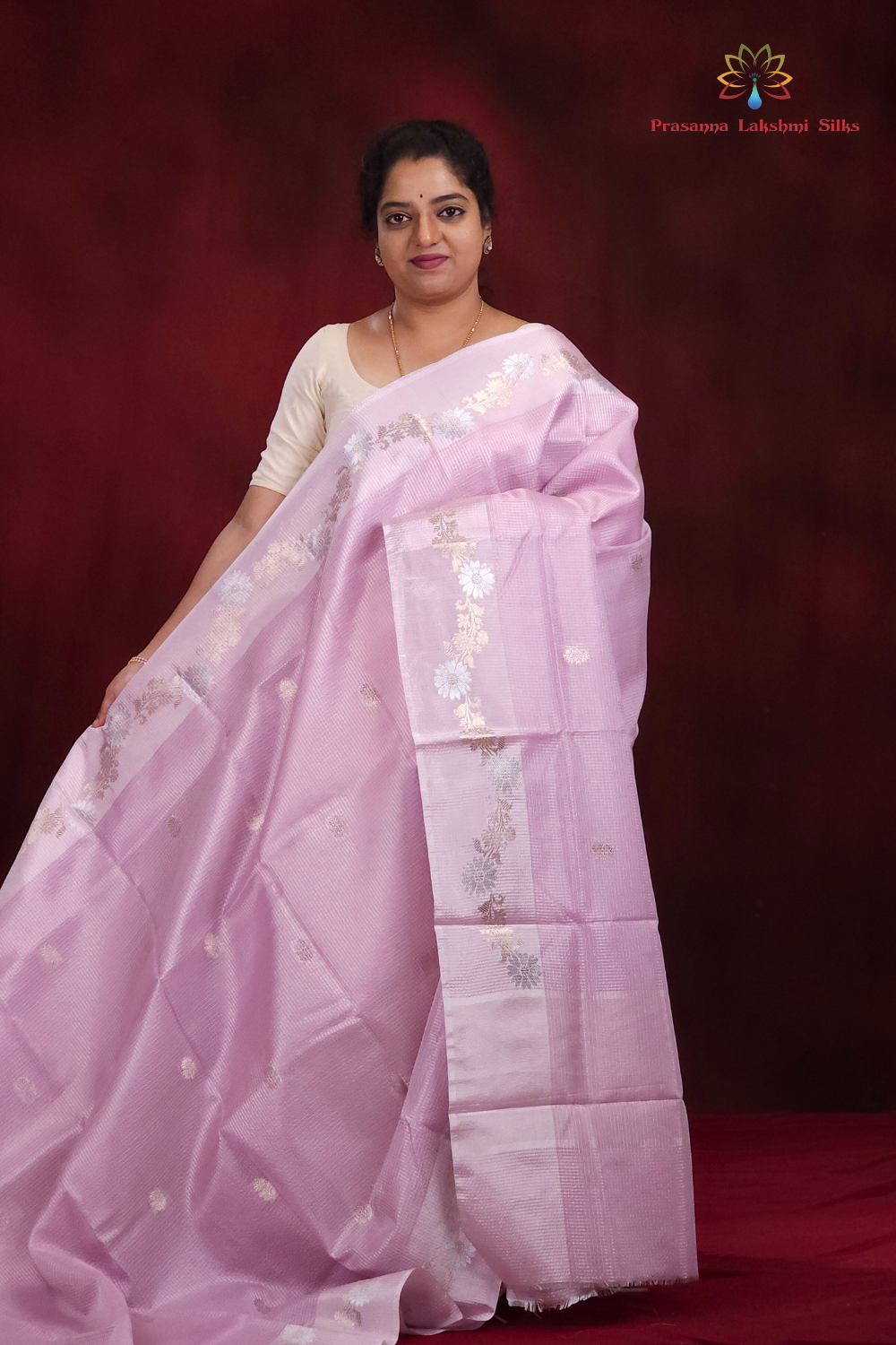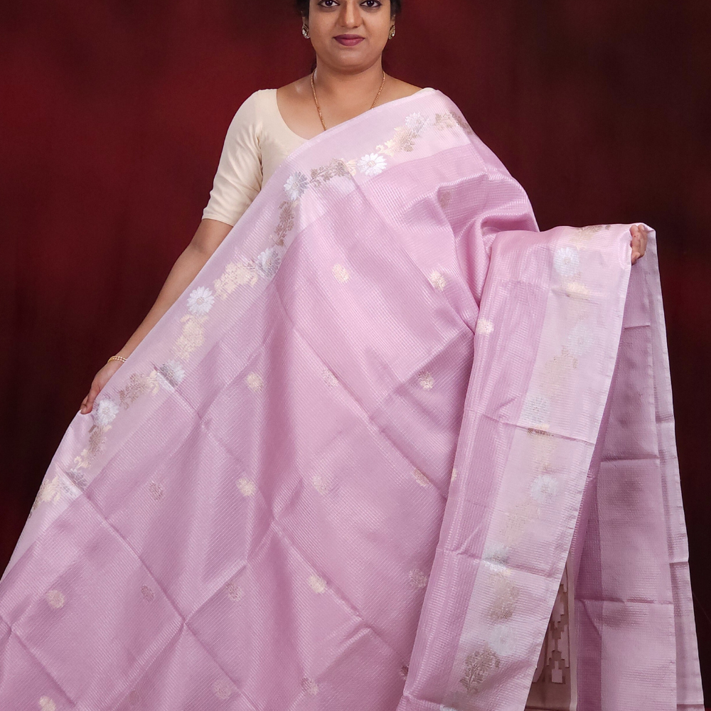 Experience the grandeur of Kota checks saree allover tiny checks with zari-woven motifs and small floral creeper-style borders in gold and silver zari with simple pallu and running blouse.....