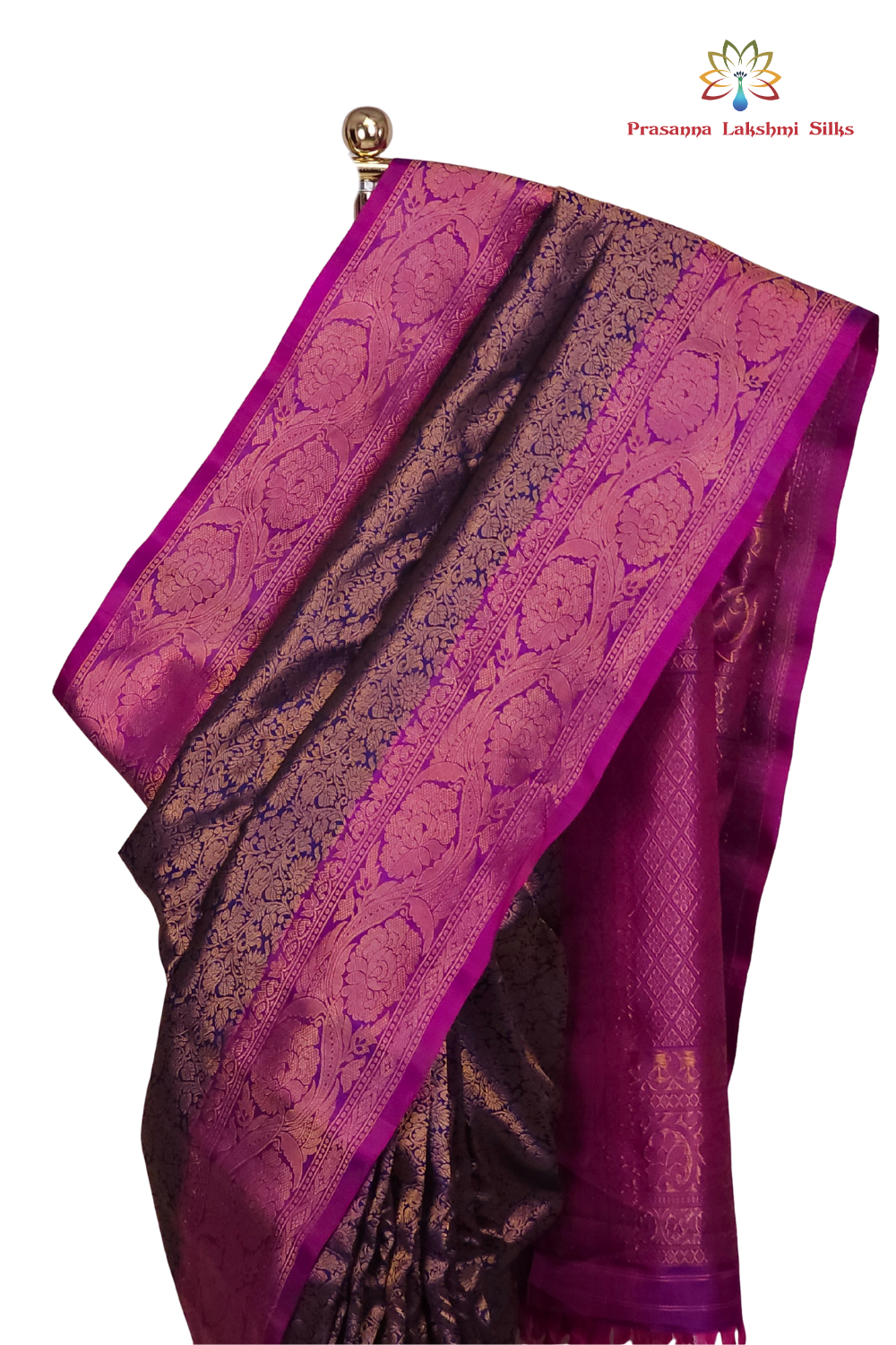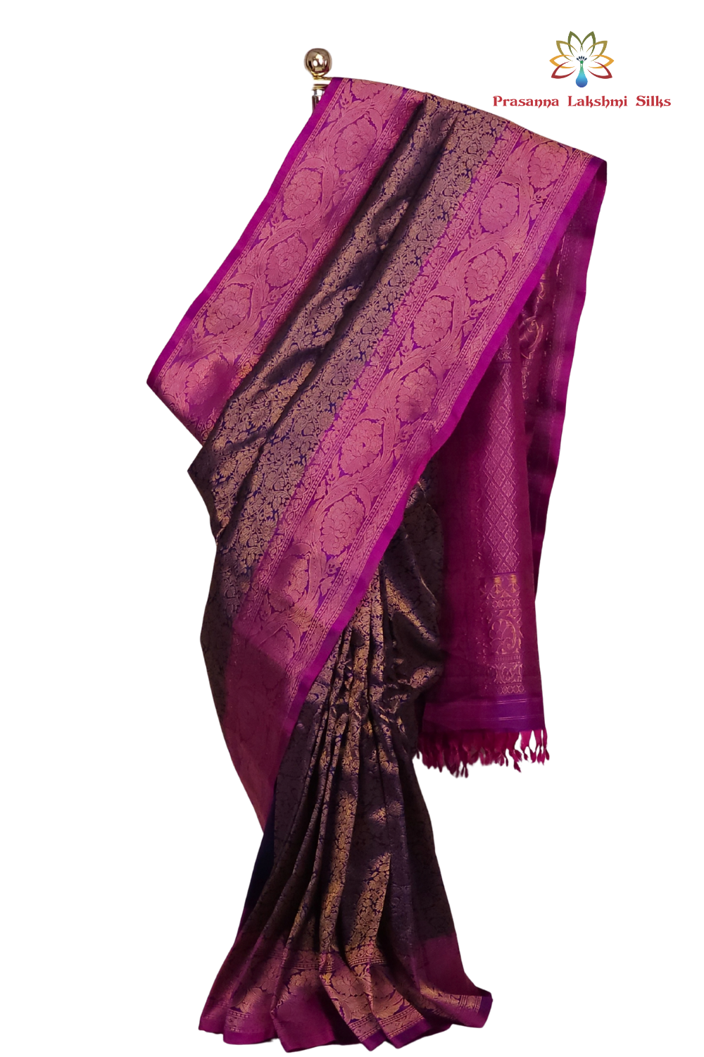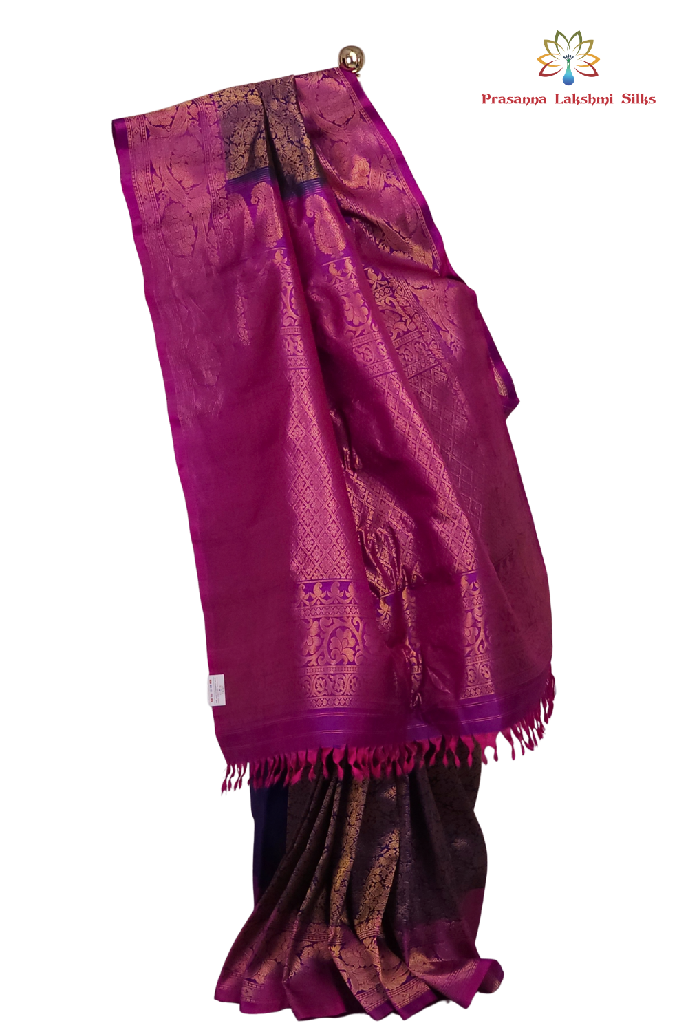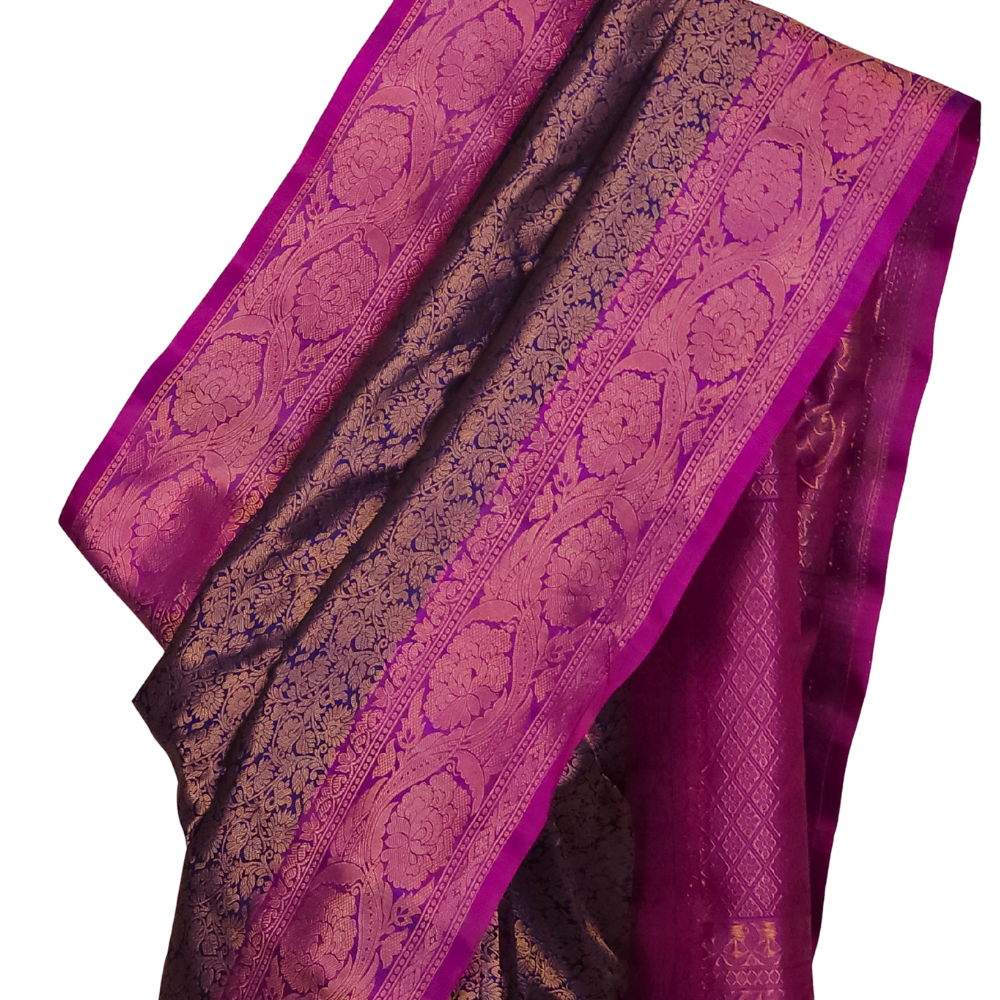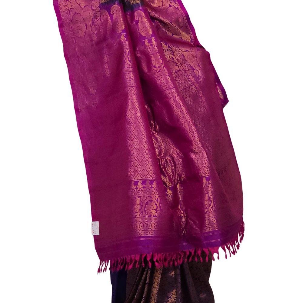 Experience the epitome of Telugu tradition with this exquisite Pure Handloom Gadwal Silk Saree.All-over intricate zari brocade design with turning borders Rich pallu adorned with intricate zari work. This masterpiece weaves together elegance and royalty, perfect for special occasions.