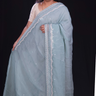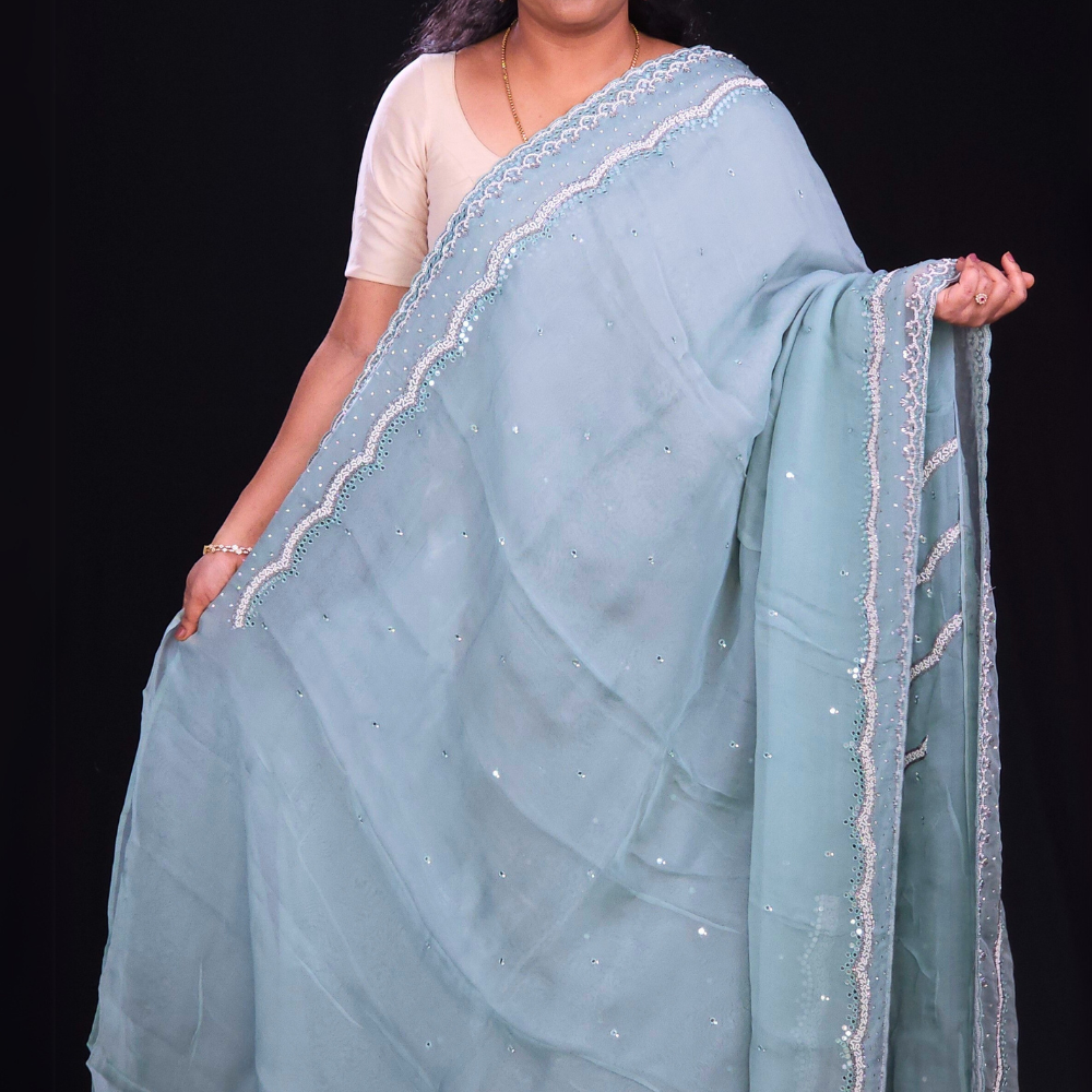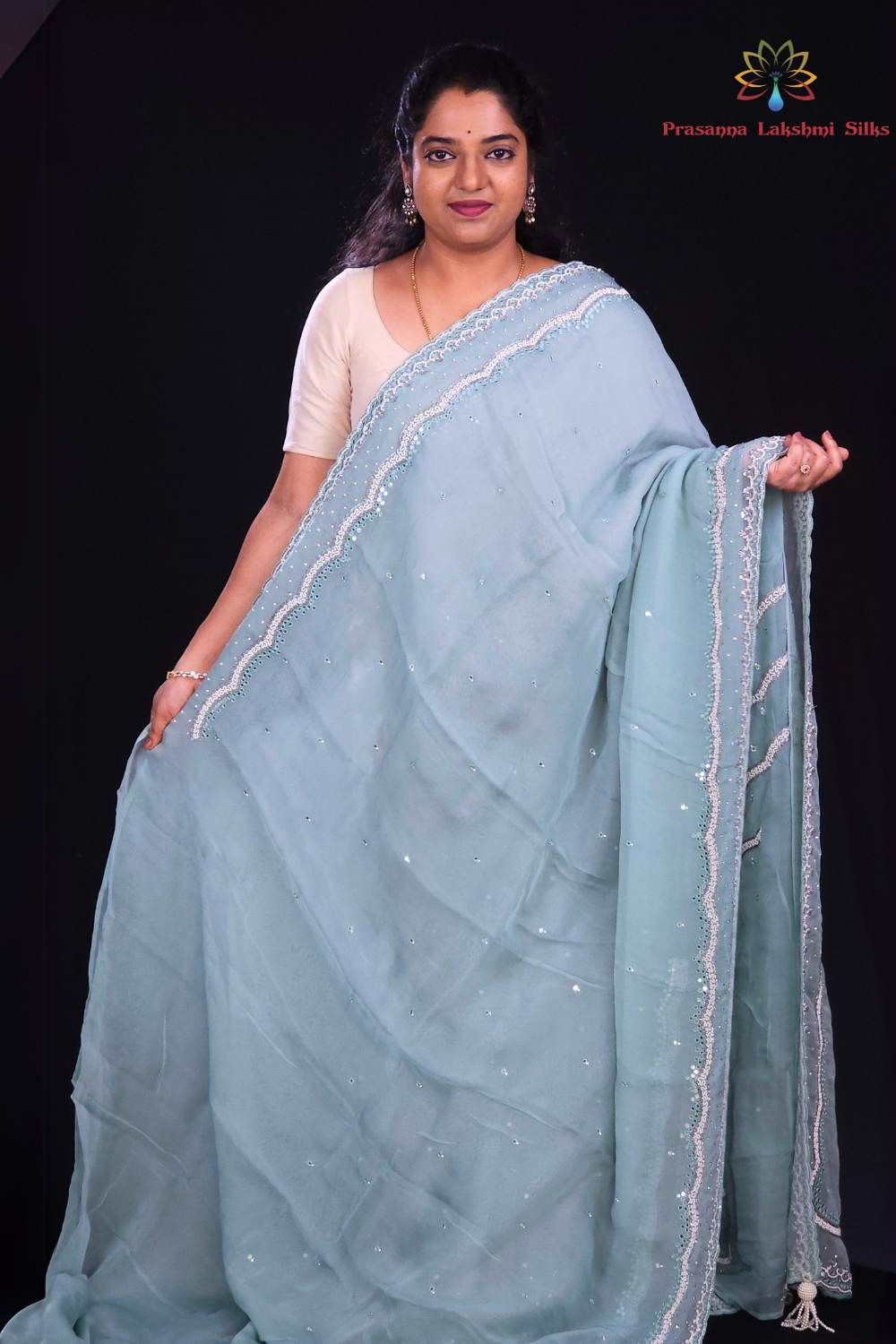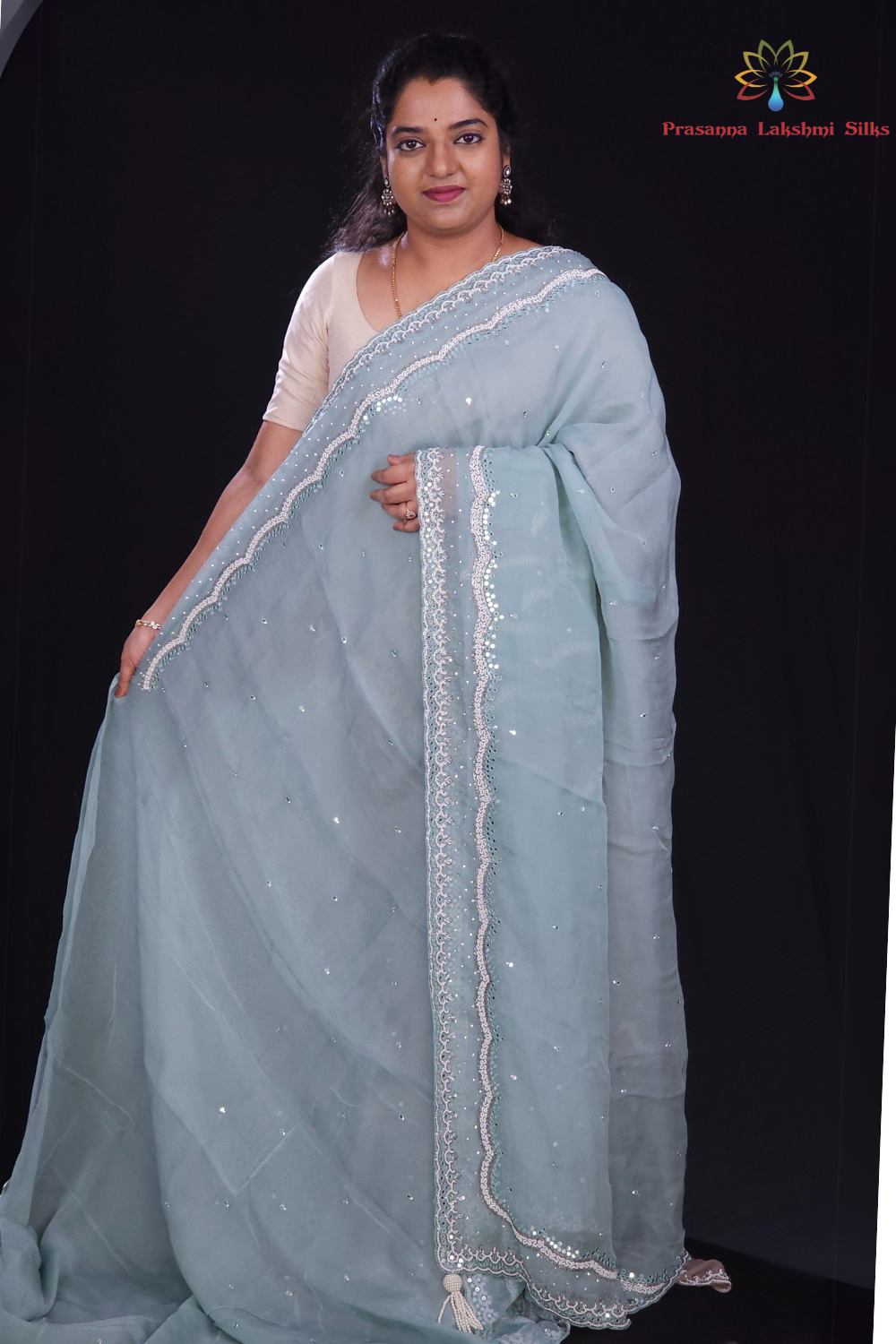 Shine Bright in Our Mirror Embellished Organza Saree allover Small Mirror work with intricate pearls and beads cutwork adorns the borders and stunning pallu paired with soft raw silk designer blouse.