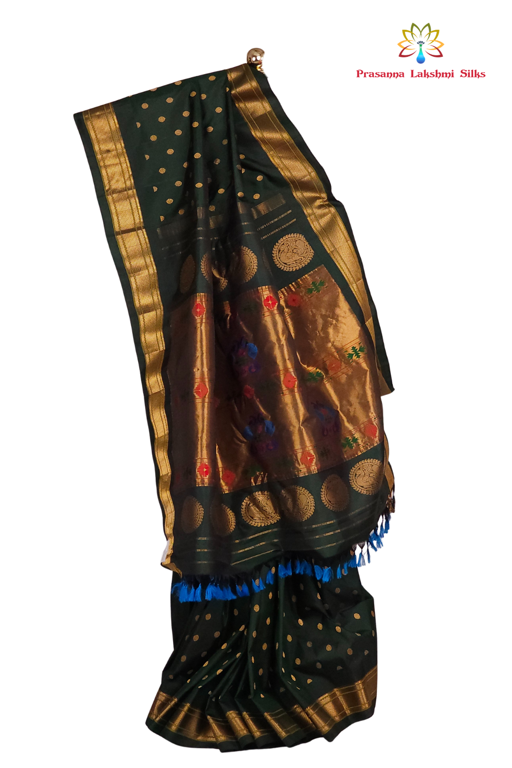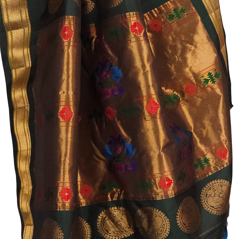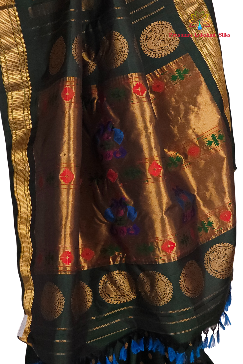 Experience the opulence of Handloom Paithani Pure Silk Saree, featuring irakkal design in the borders adding a touch of sophistication with Luxurious Paithani weave on the pallu....