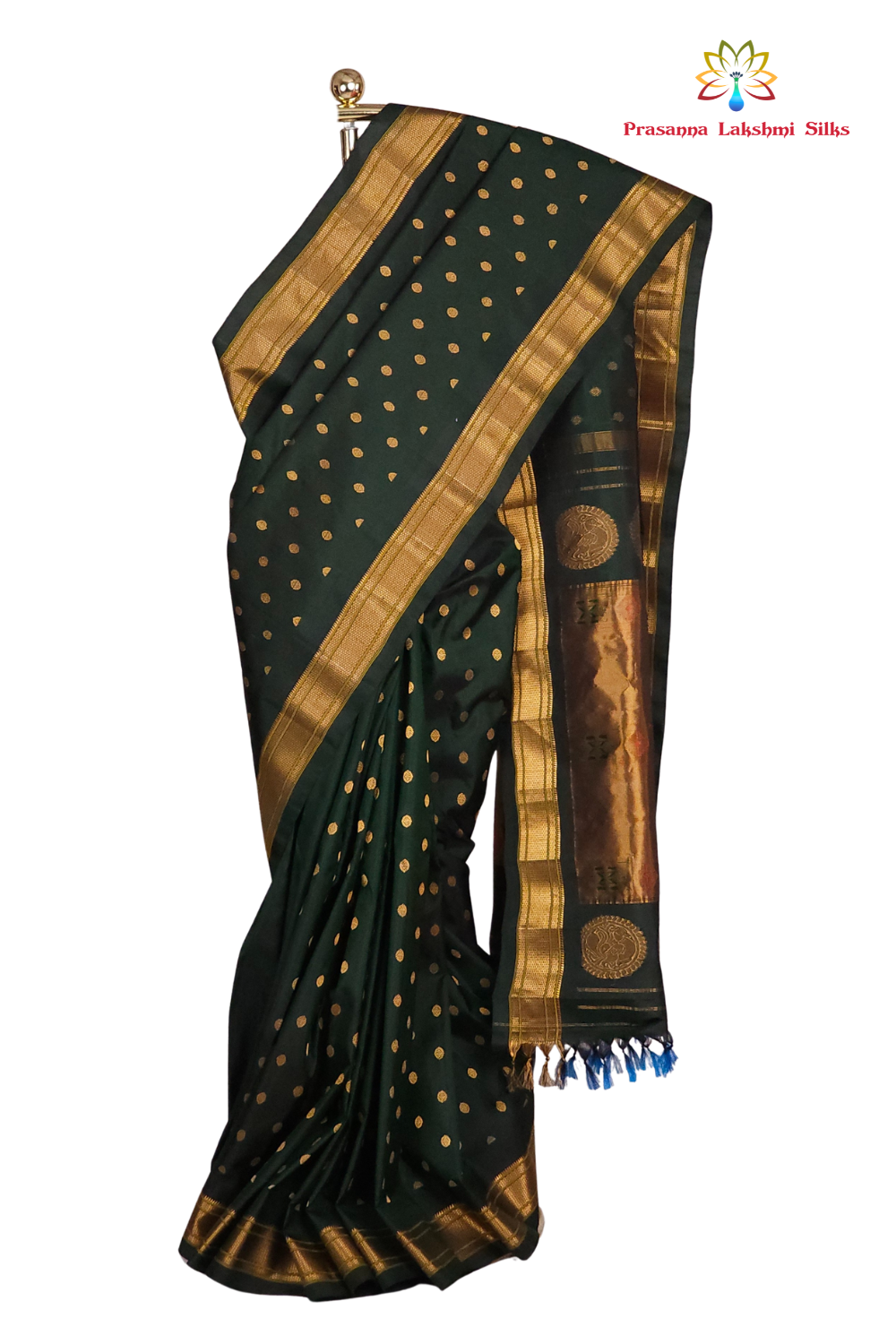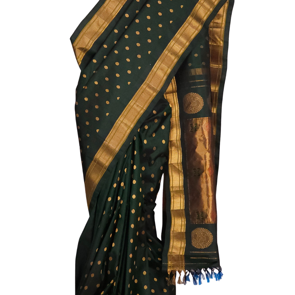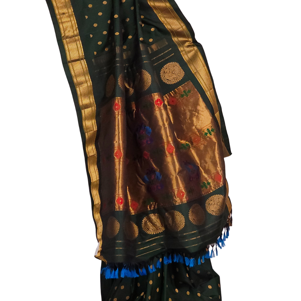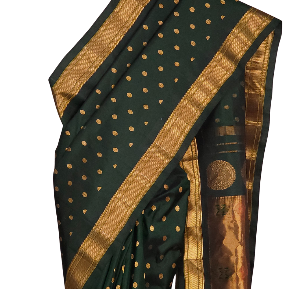 Experience the opulence of Handloom Paithani Pure Silk Saree, featuring irakkal design in the borders adding a touch of sophistication with Luxurious Paithani weave on the pallu....