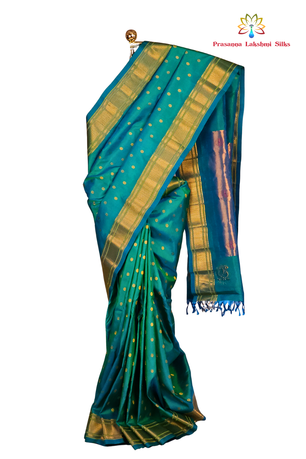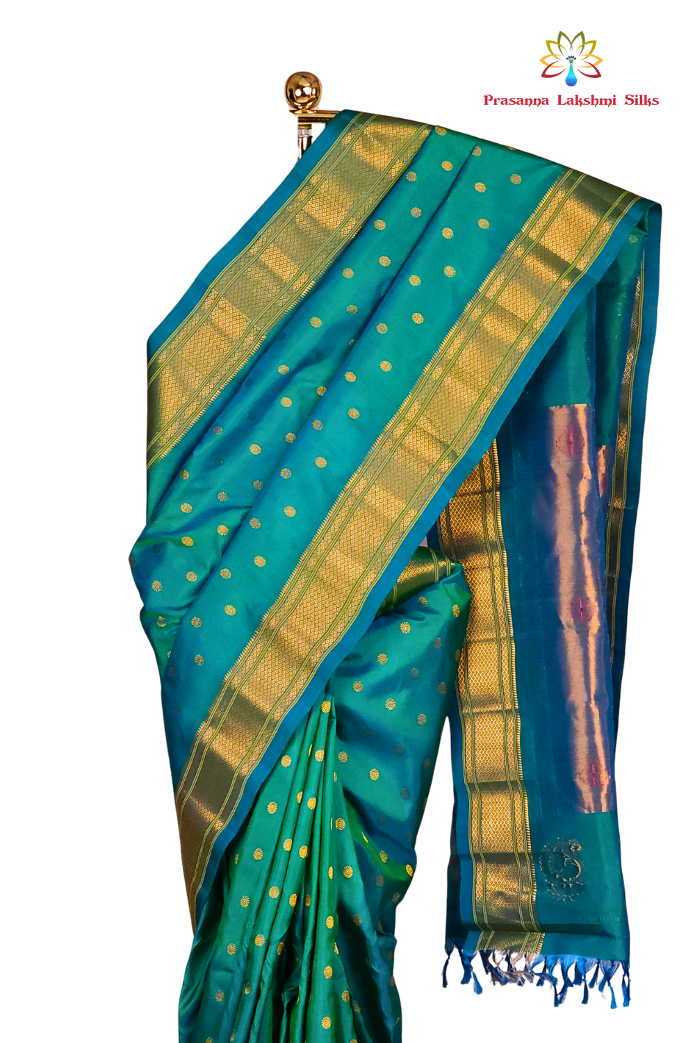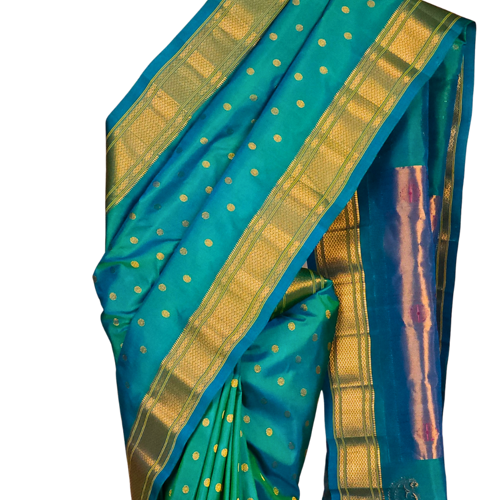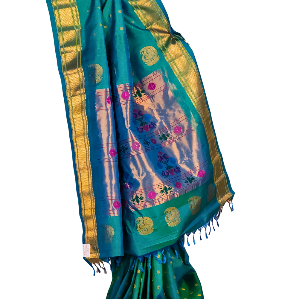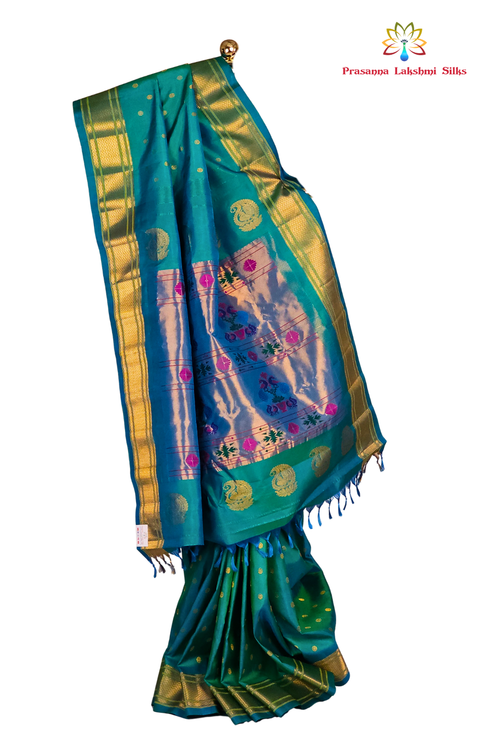 Experience the opulence of Handloom Paithani Pure Silk Saree, featuring irakkal design in the borders adding a touch of sophistication with Luxurious Paithani weave on the pallu....