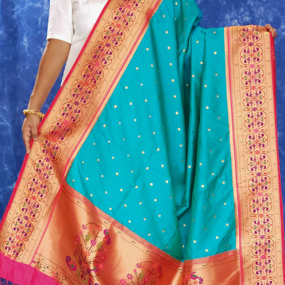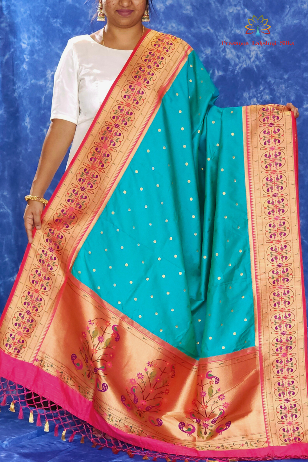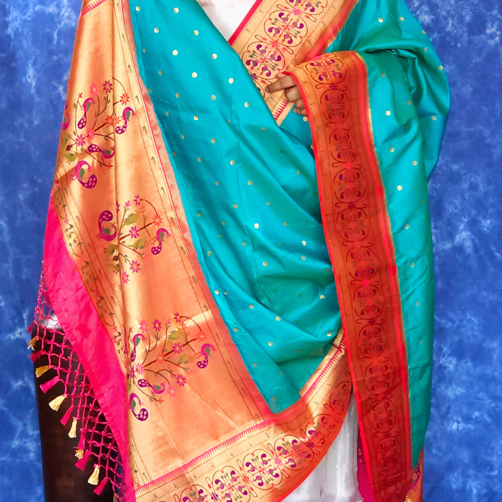 Experience the richness of our stunning Banarasi Dupatta,allover zari motifs,paithani borders with Two-Sided Pallu,paired with beautiful tussals