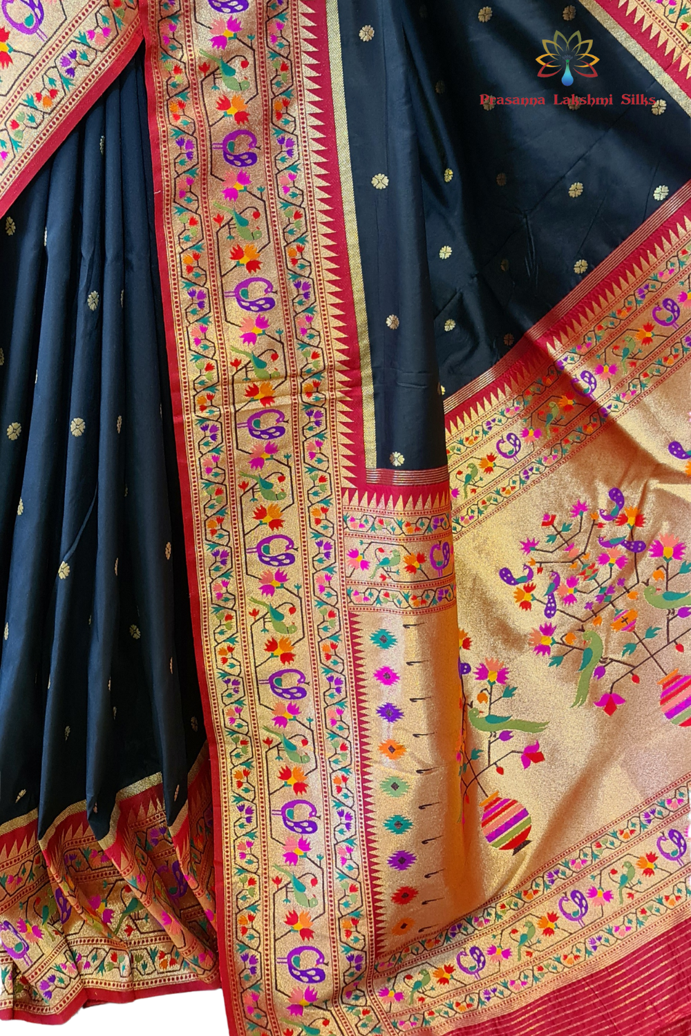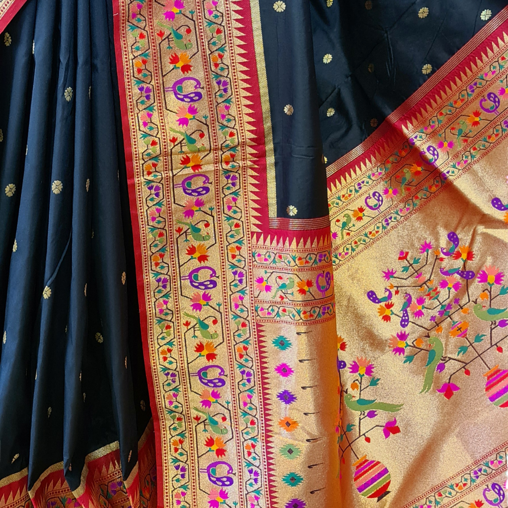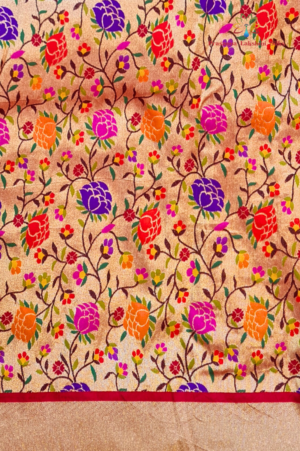 Elevate your style with our stunning Semi Banarasi Saree,allover zari woven motifs beautifully crafted tisue paithani borders with rich zari paithani pallu paired with paithani blouse.....