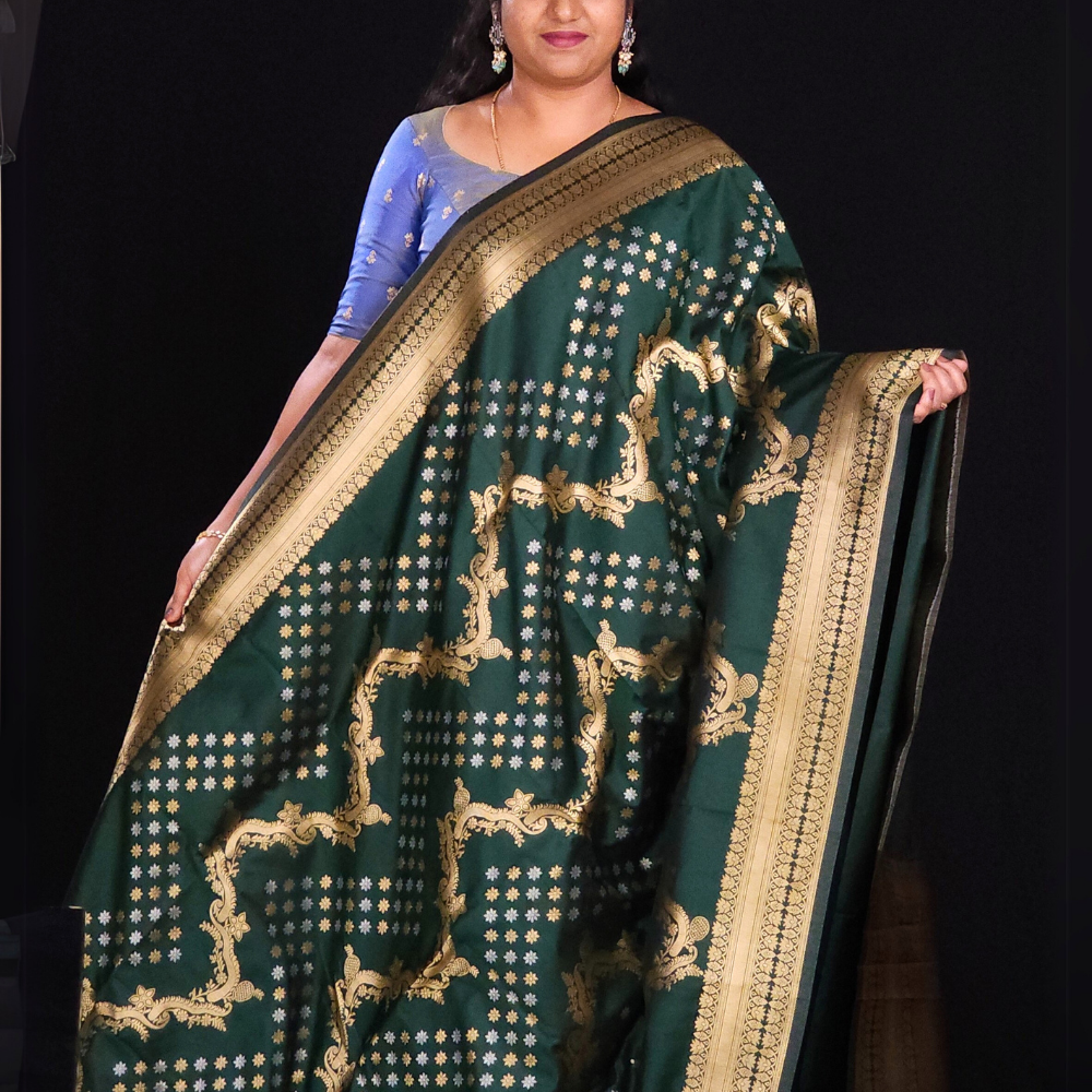 Indulge in the grandeur of our Semi Banarasi Saree, showcasing a unique blend of zig zag patterns, zari woven borders and brocade design pallu with tassels paired with running blouse.....