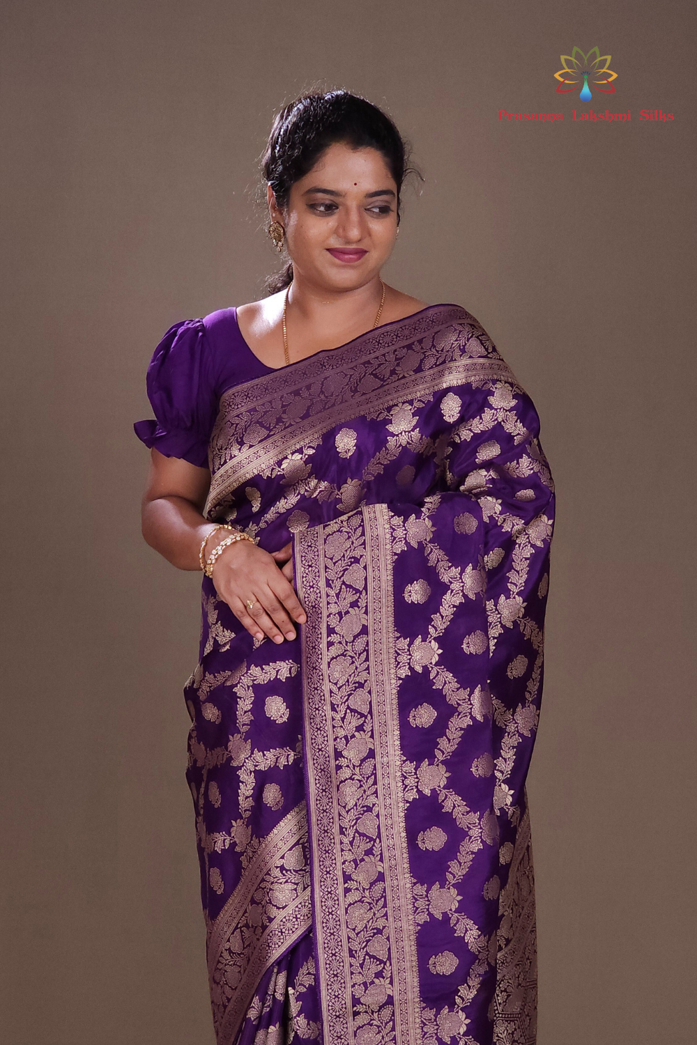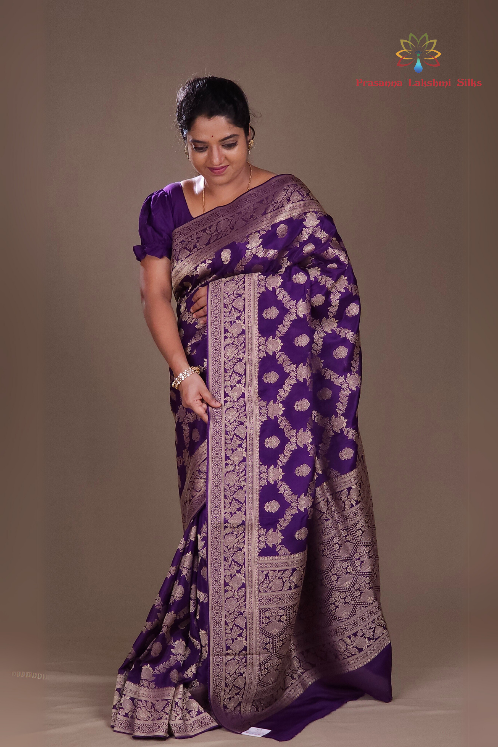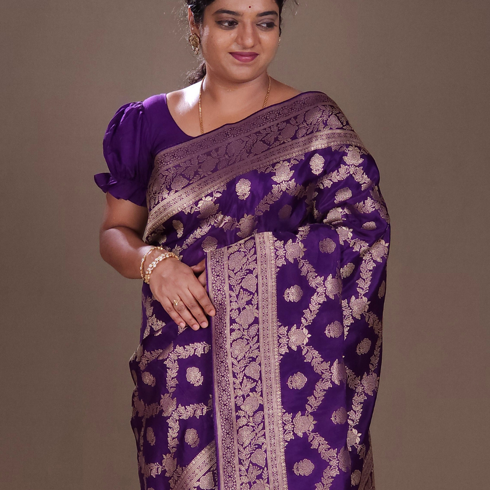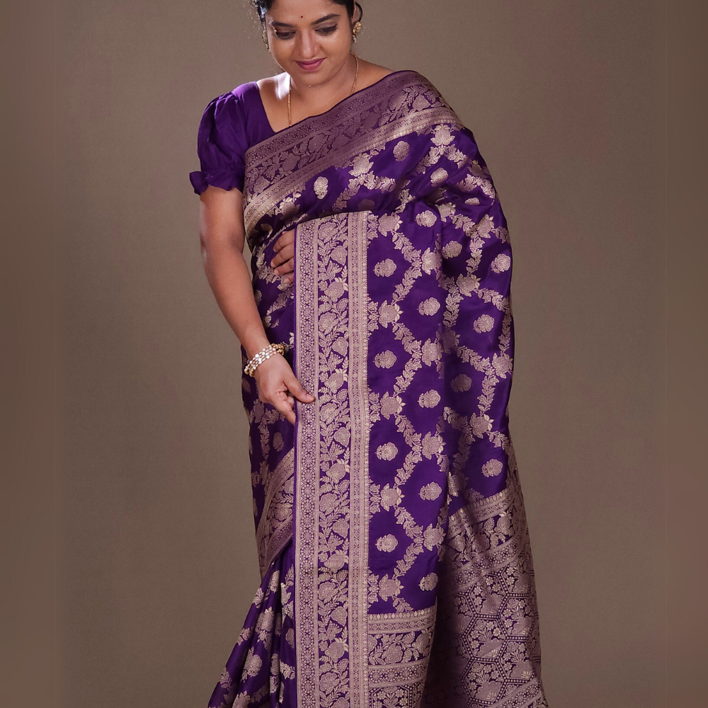 Elevate your style with our Banarasi Munga sarees with floral borders that add a royal touch to the saree. allover the body rich brocade design, while the pallu is crafted with rich zariwoven brocade and comes with a running blouse .........
