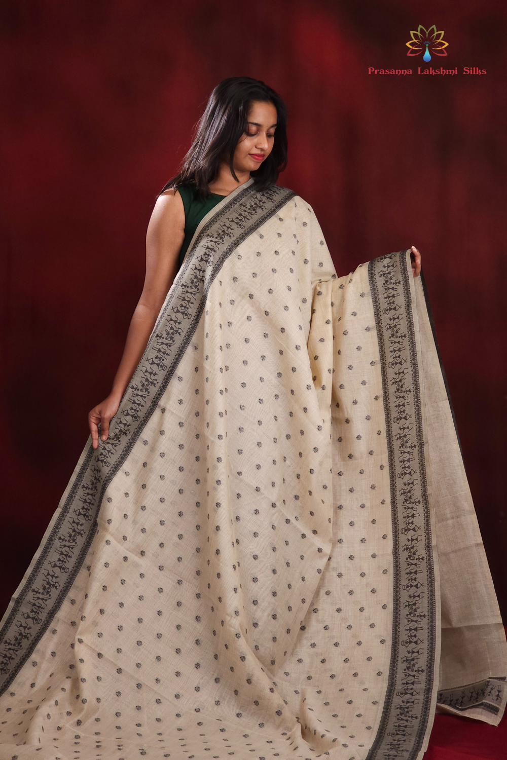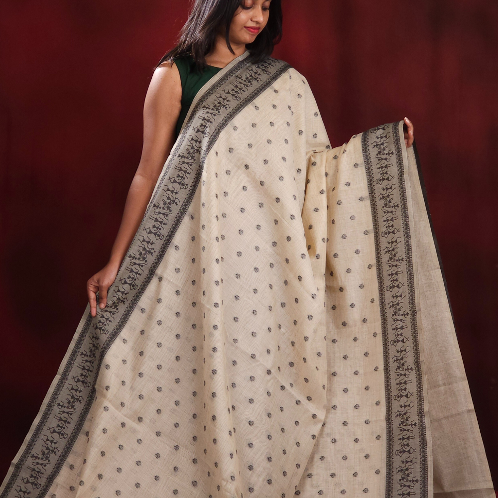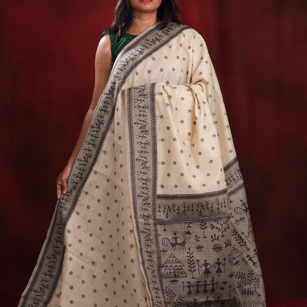 Timeless grace of our Chanderi Silk Cotton Saree, adorned with elegant thread woven motifs across the body,thread woven warli art borders and pallu, paired beautifully with a running blouse