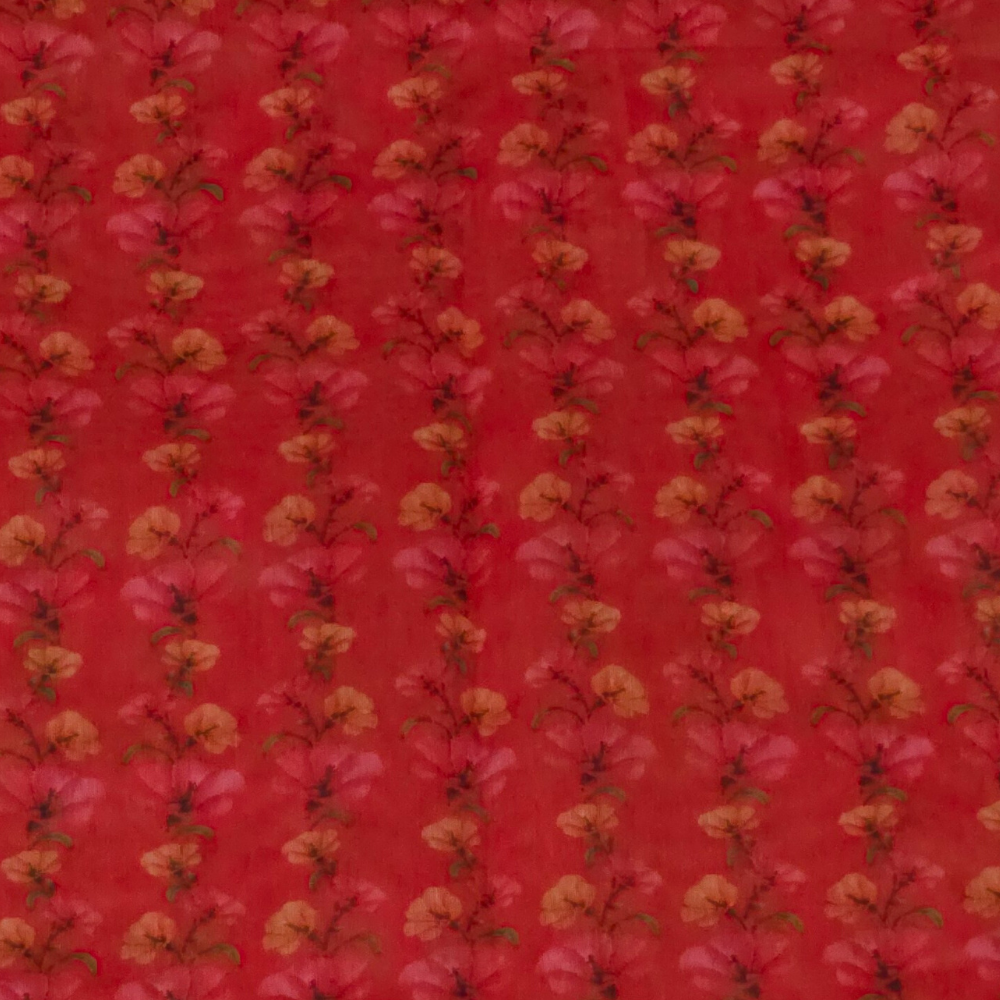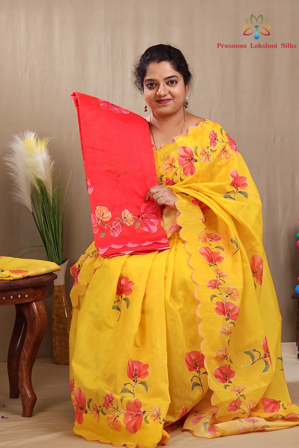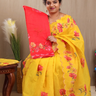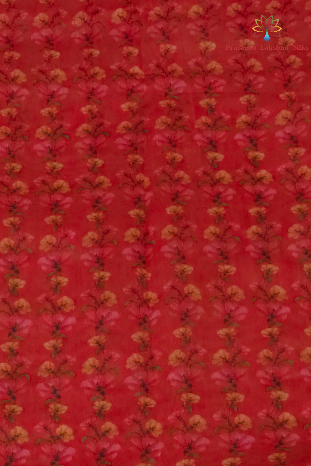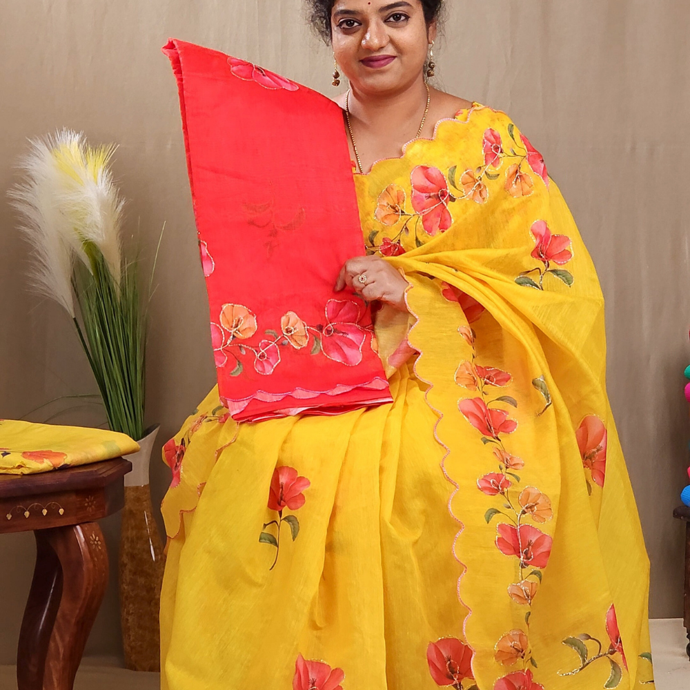 Elevate your style with this Chanderi Silk cotton sarees feature allover floral digital print bunches with elegant floral borders outlined in zari work.The pallu has the same floral charm, and paired with a small floral digital printed blouse....