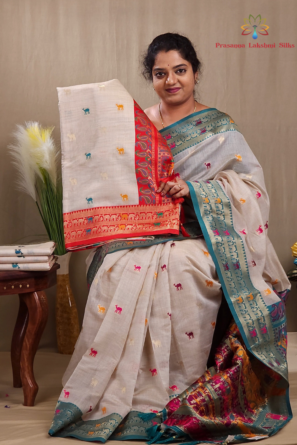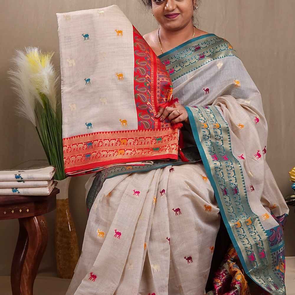 Chanderi silk cotton sarees all over camel thread woven motifs with contrast zari borders, rich brocade pallu and running blouse