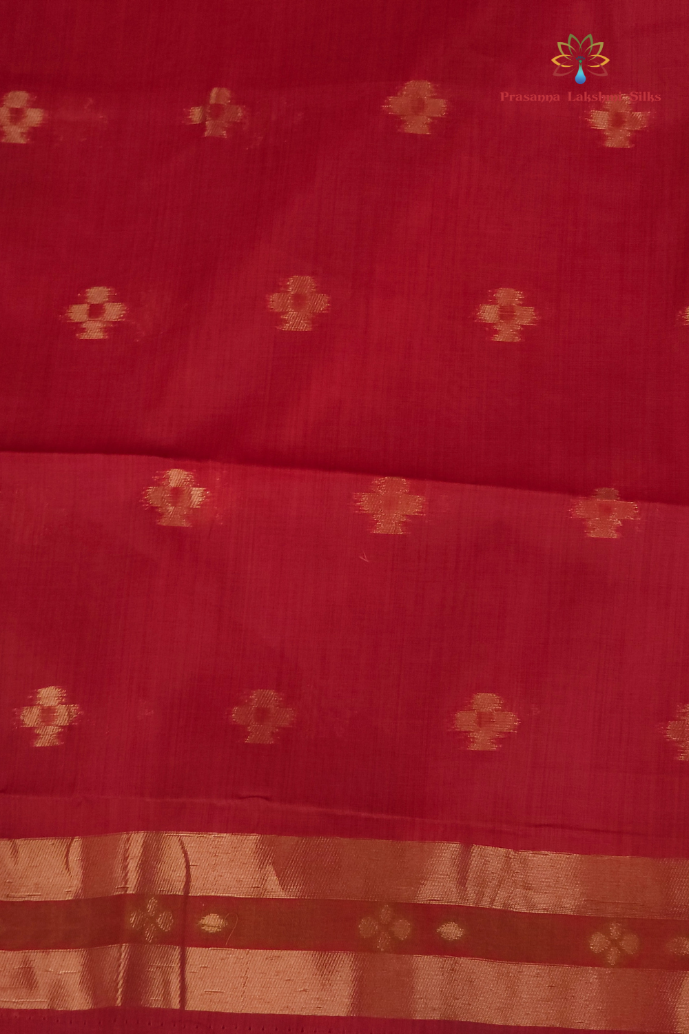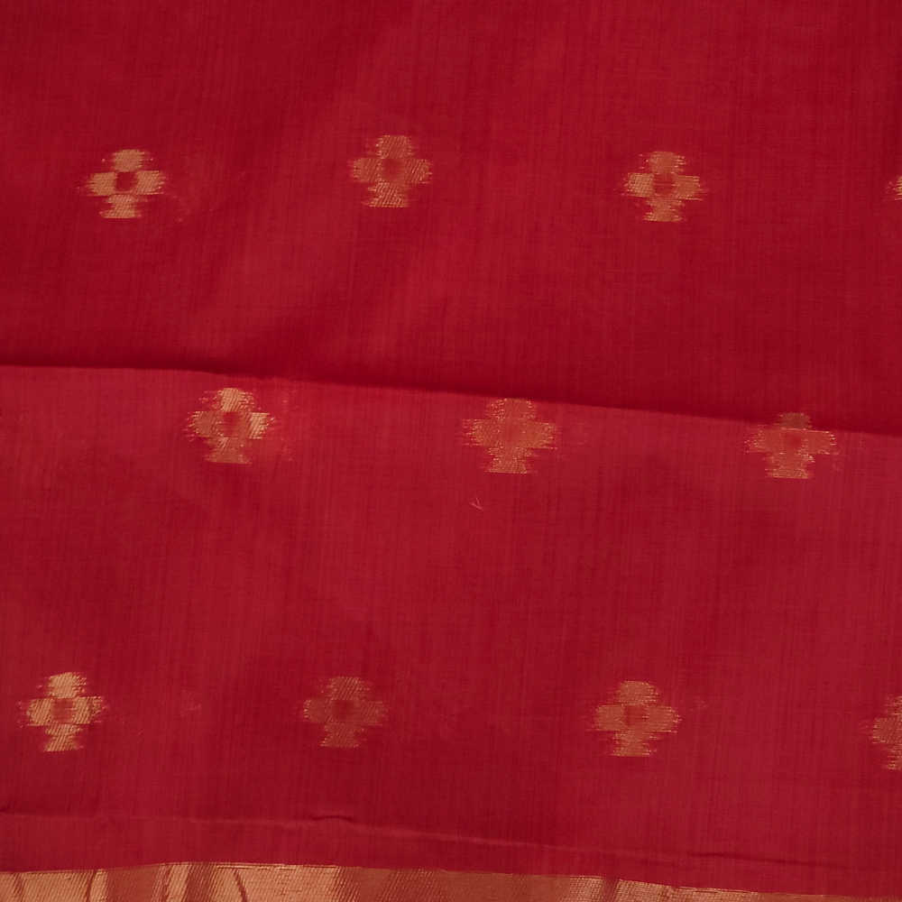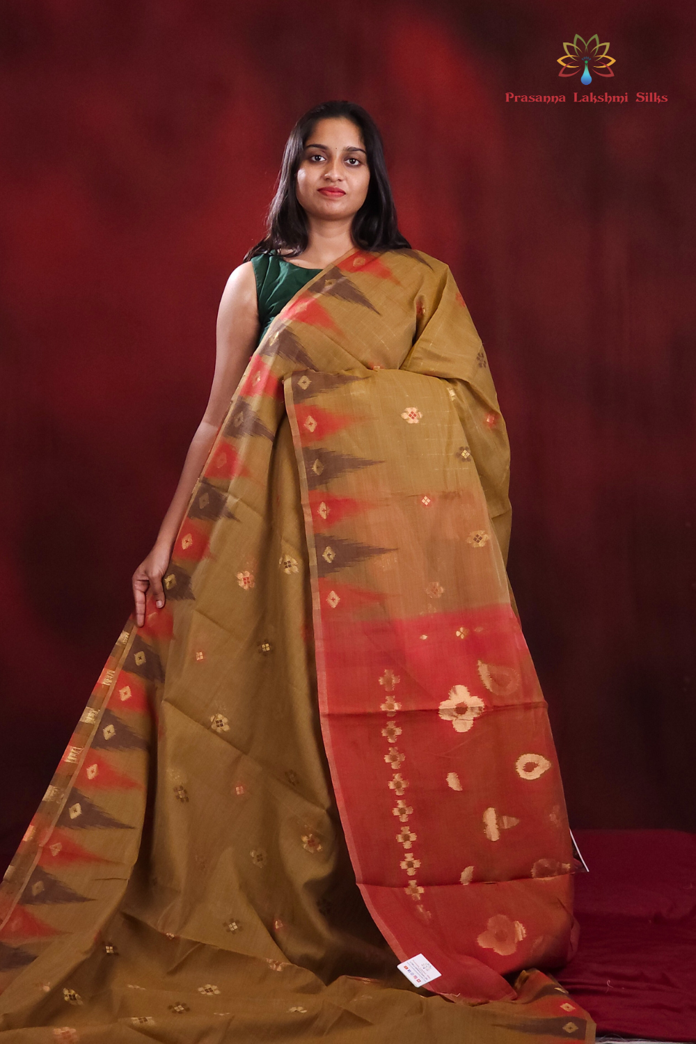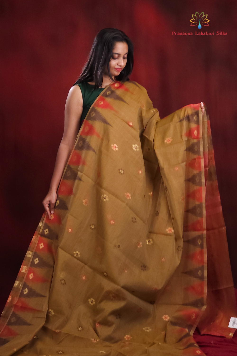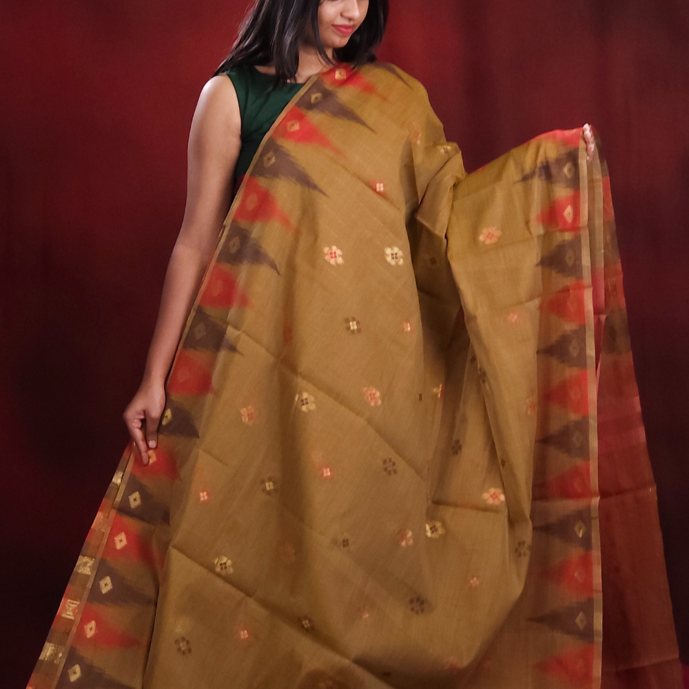 Experience the elegance of our Chanderi silk cotton saree, allover floral and zari buttas with Contrast temple borders pallu with tassels paired with contrast blouse....