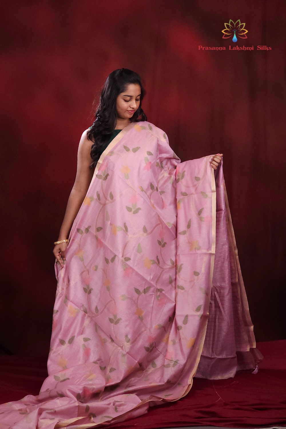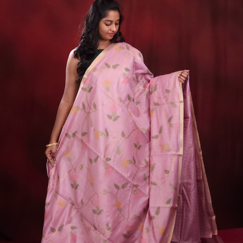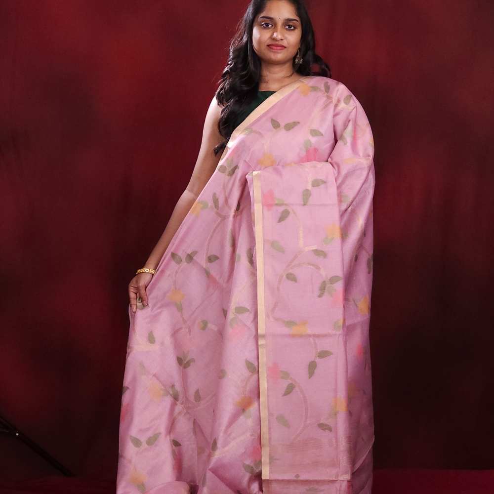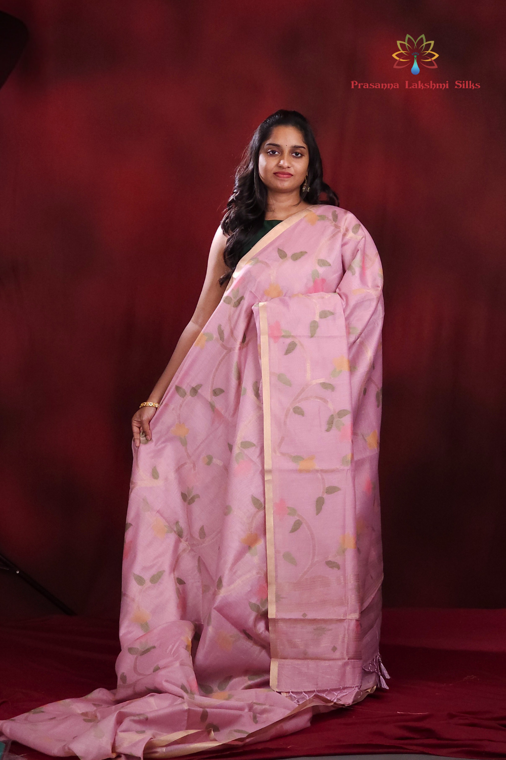 Experience the elegance of our Chanderi silk cotton saree, allover Floral motifs with 1inch jari borders and beautiful Jhamdhani weaving pallu ,with tassel paired with Running blouse....