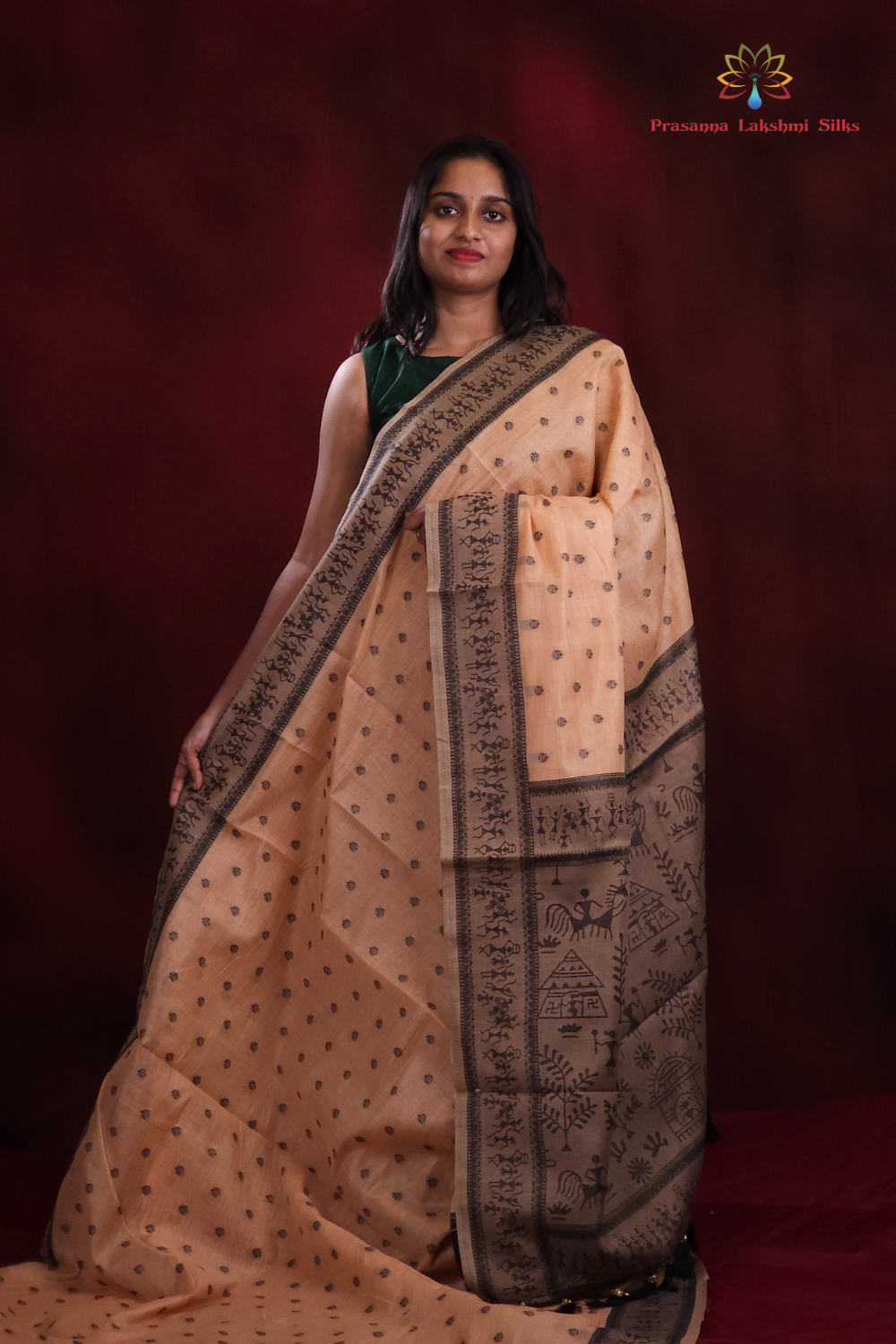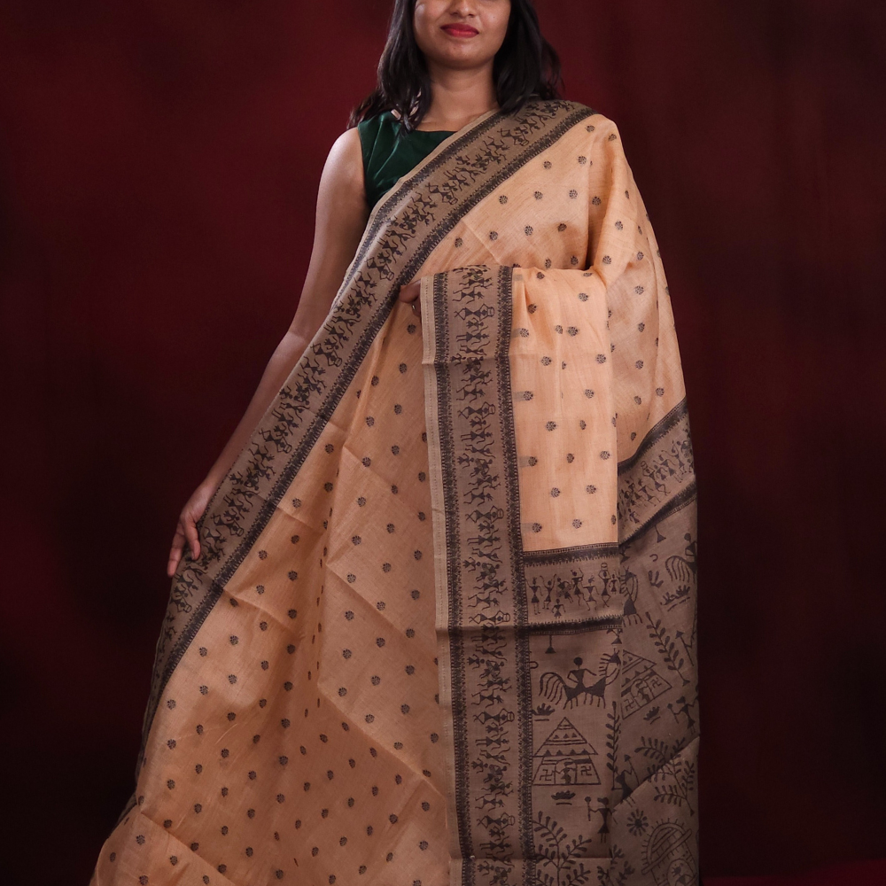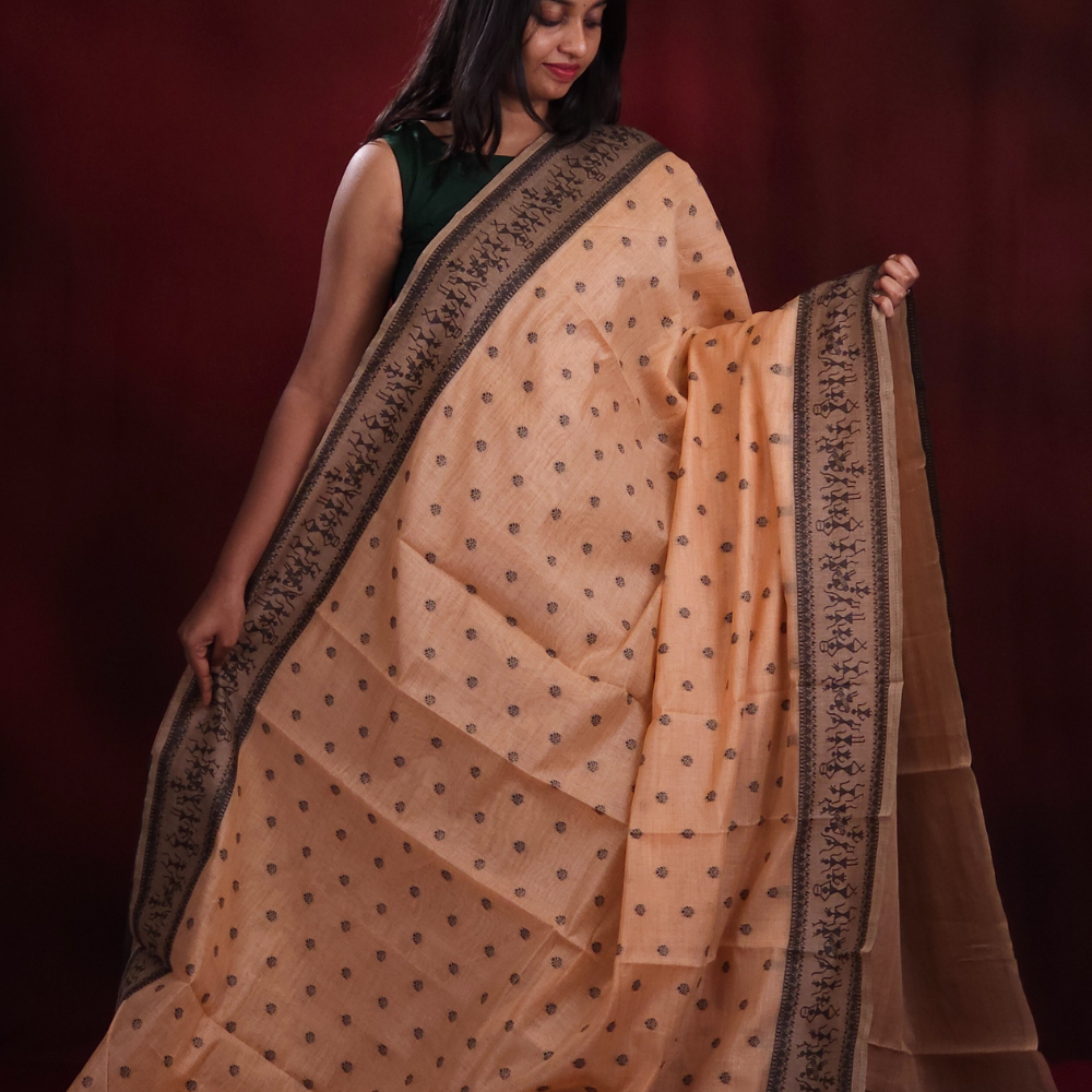 Timeless grace of our Chanderi Silk Cotton Saree, adorned with elegant thread woven motifs across the body,thread woven warli art borders and pallu, paired beautifully with a running blouse