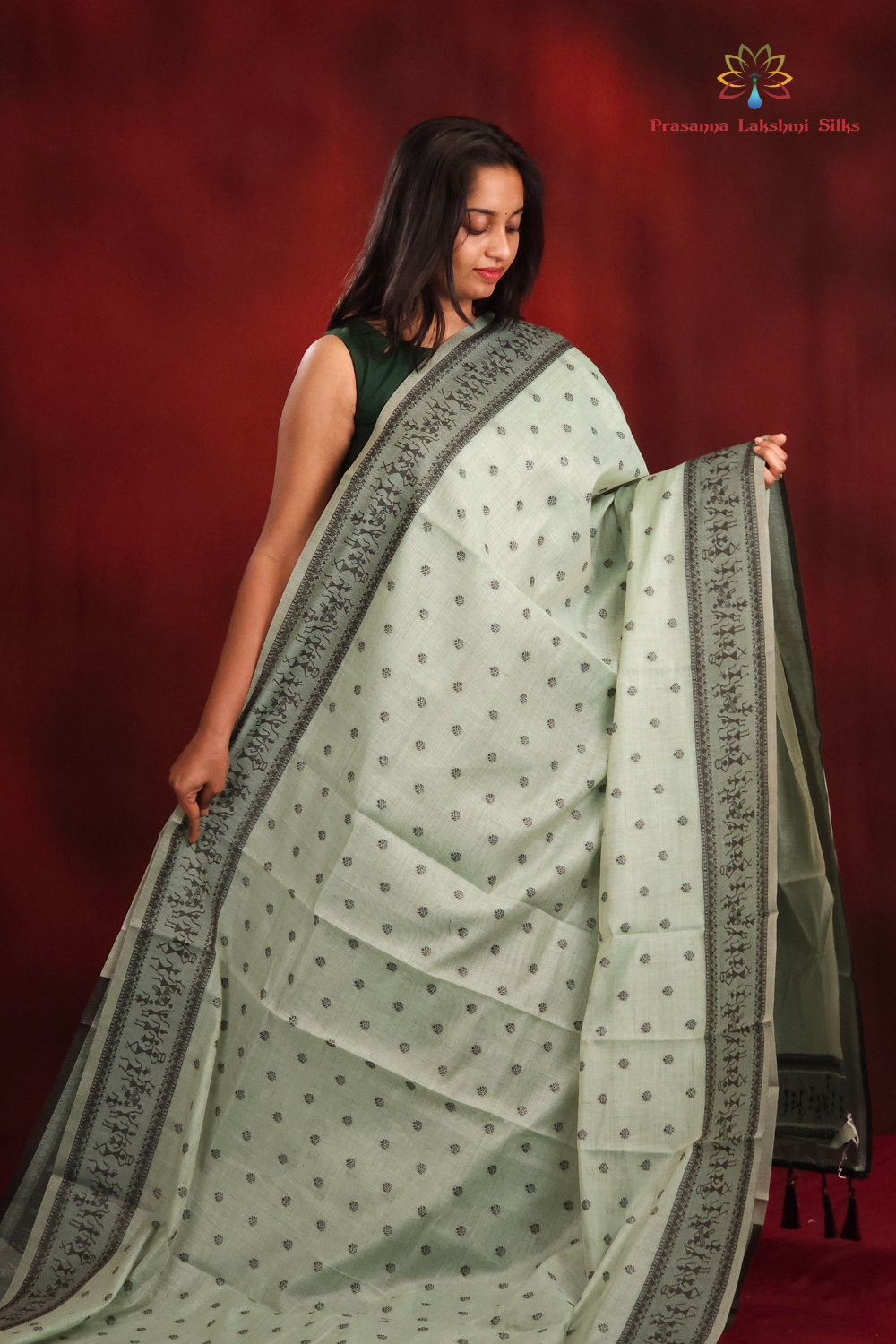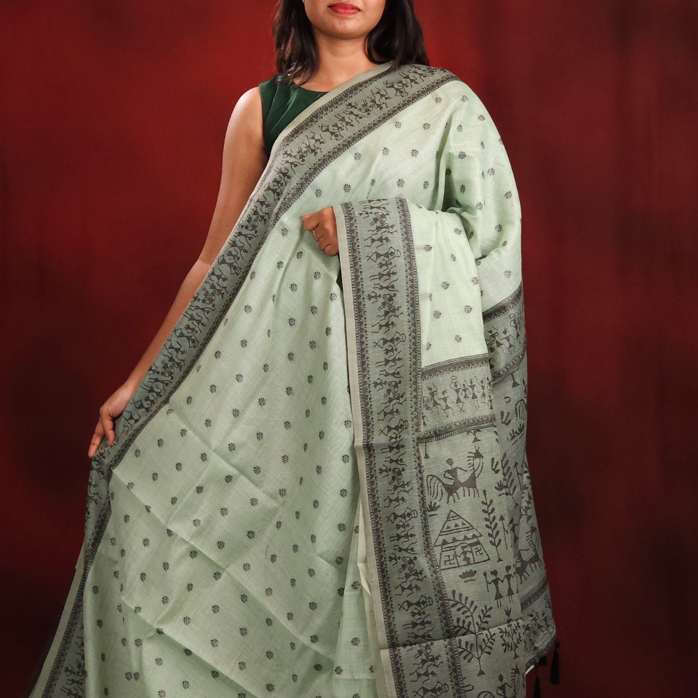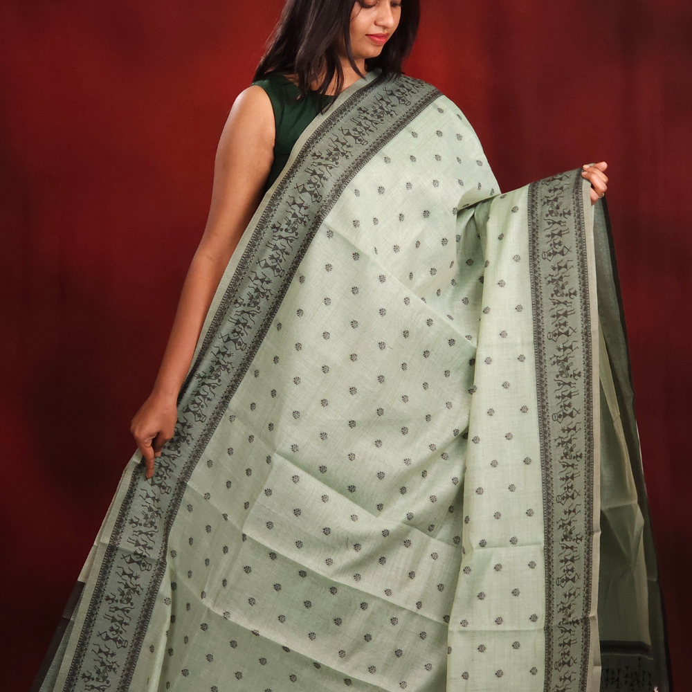 Timeless grace of our Chanderi Silk Cotton Saree, adorned with elegant thread woven motifs across the body,thread woven warli art borders and pallu, paired beautifully with a running blouse