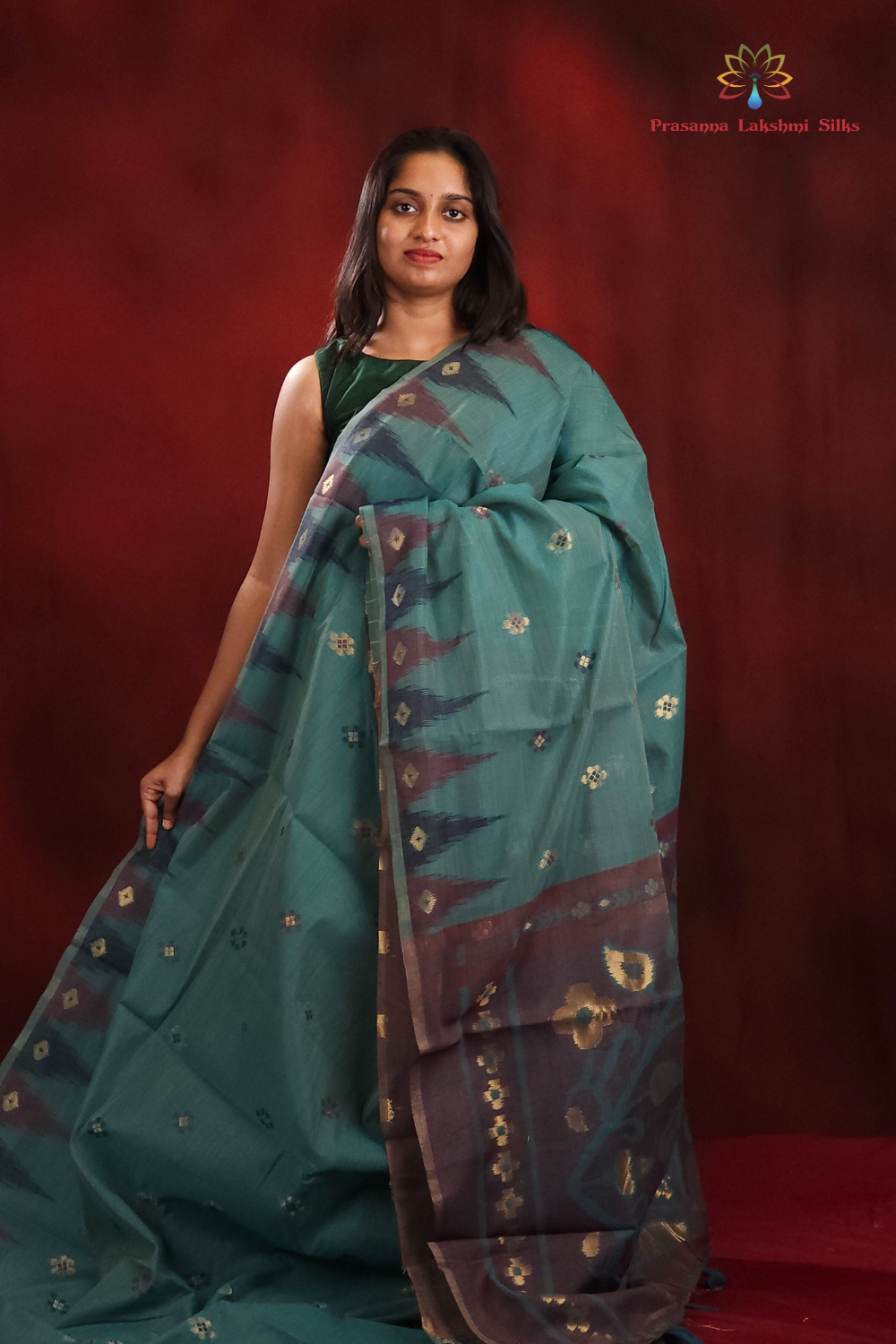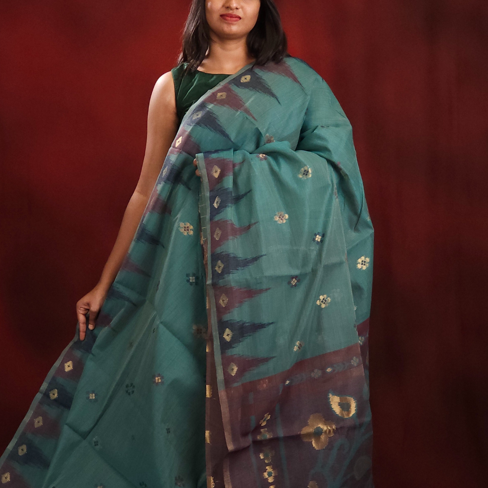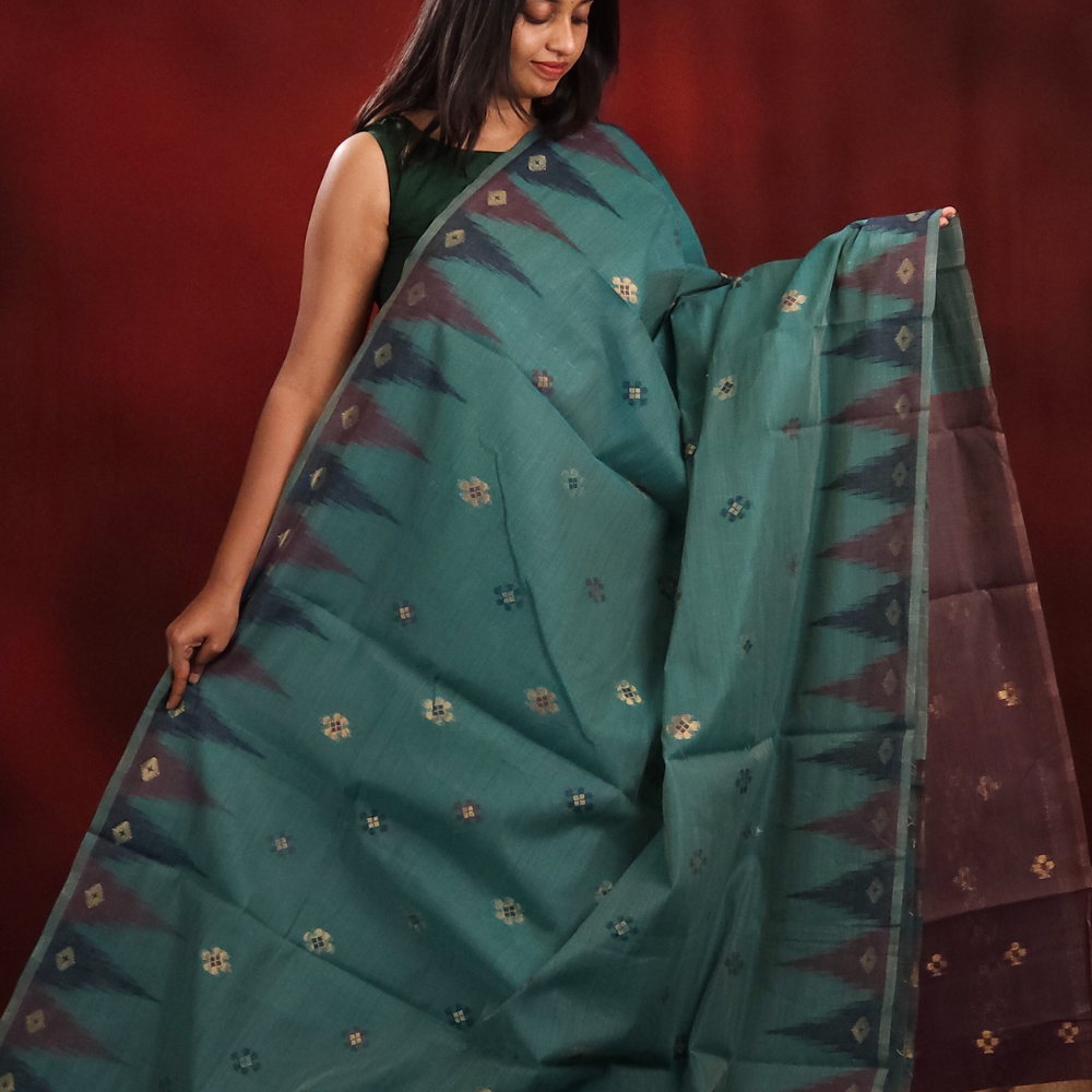 Experience the elegance of our Chanderi silk cotton saree, allover floral and zari buttas with Contrast temple borders pallu with tassels paired with contrast blouse....