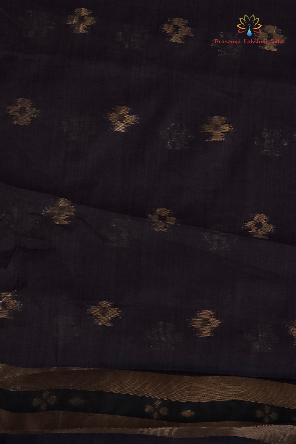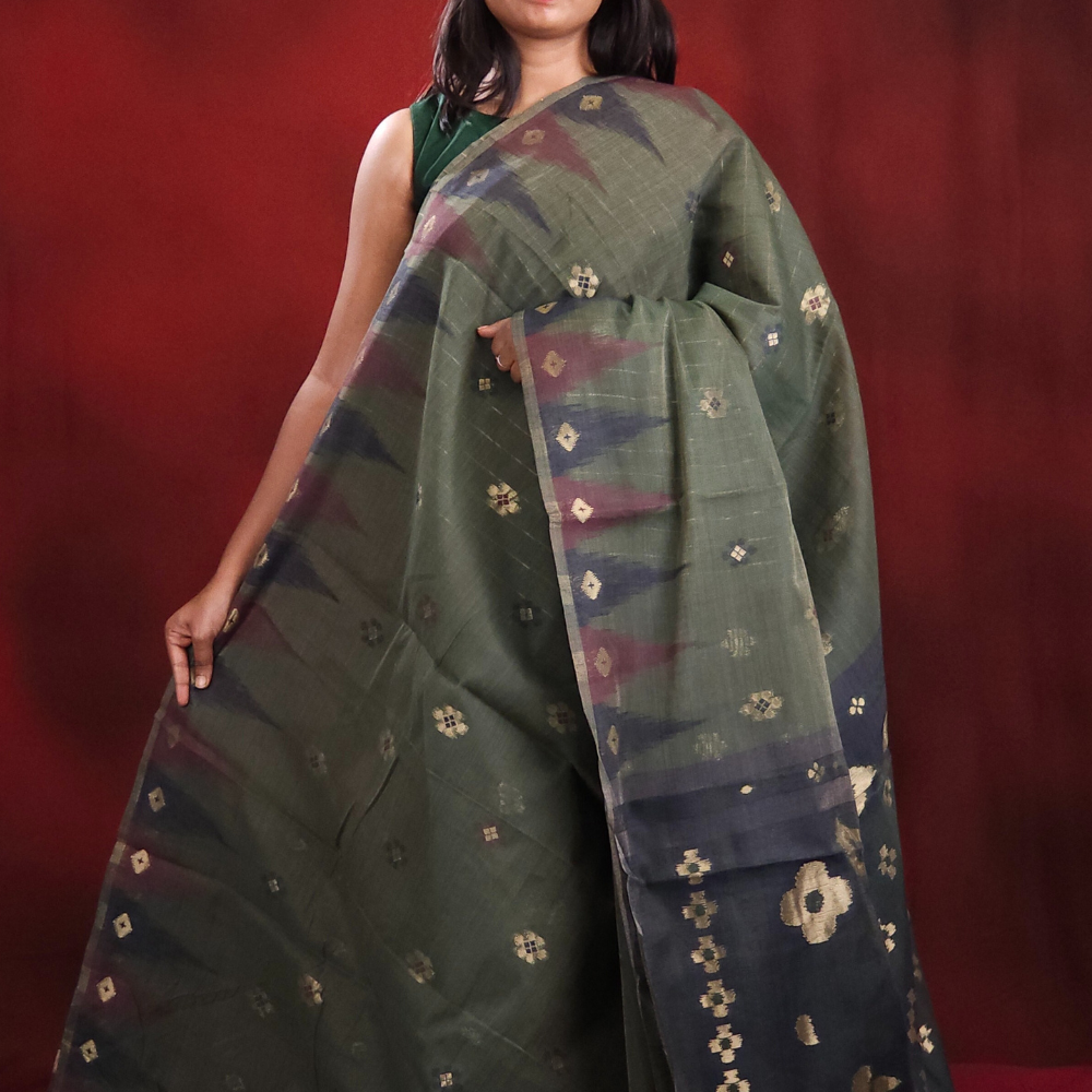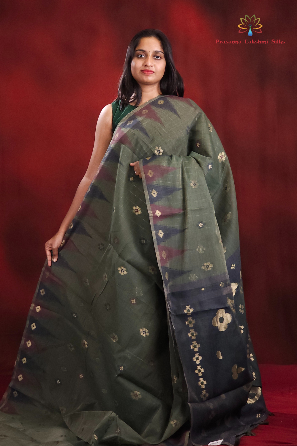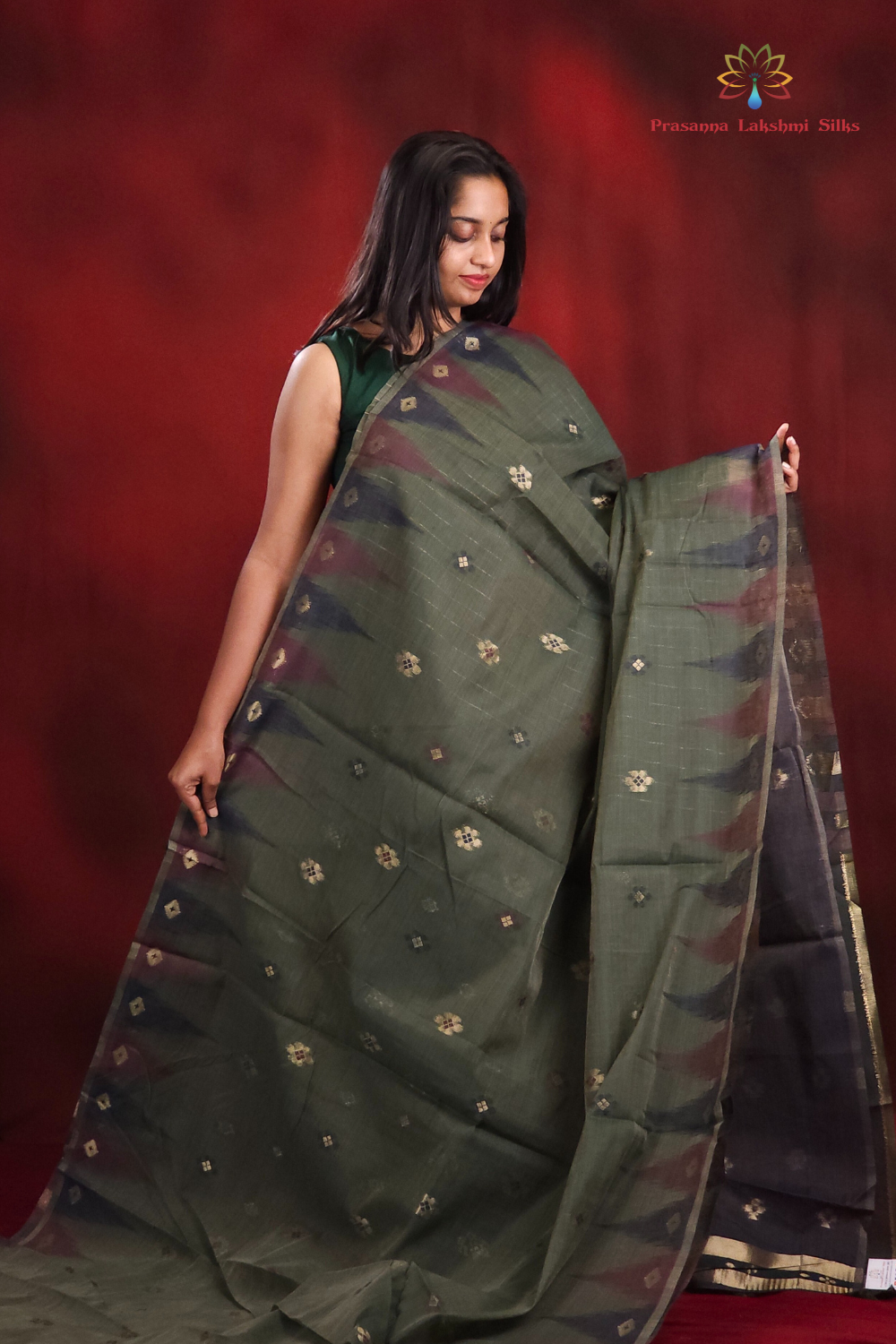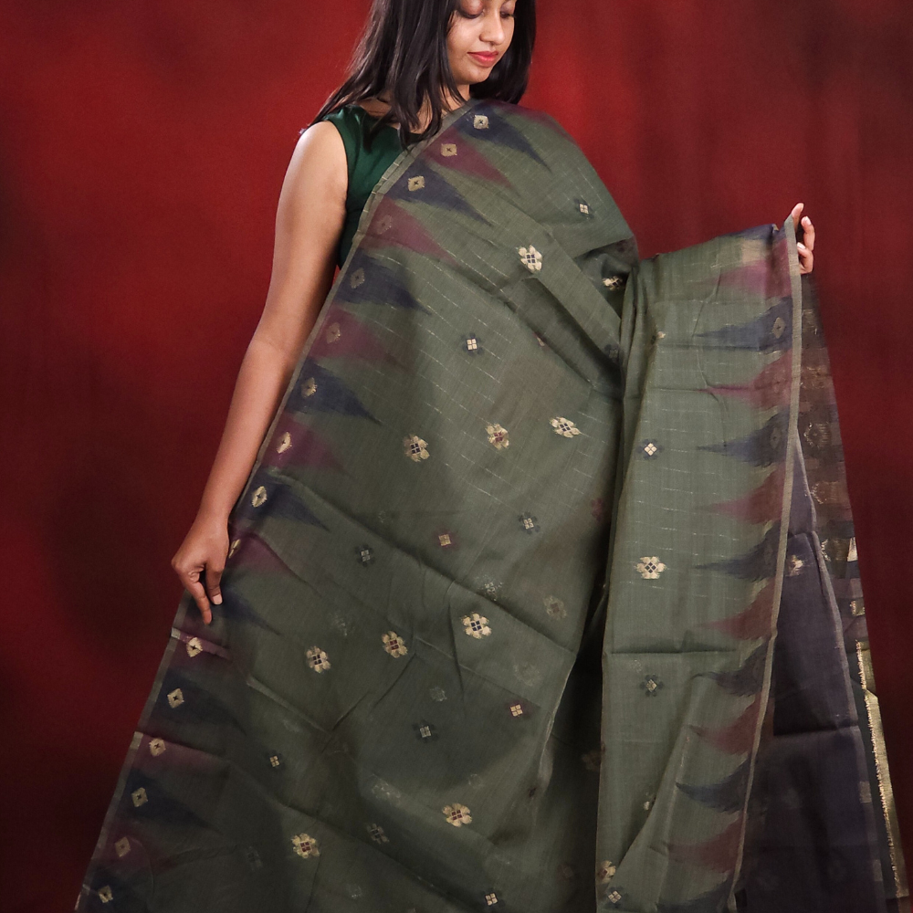 Experience the elegance of our Chanderi silk cotton saree, allover floral and zari buttas with Contrast temple borders pallu with tassels paired with contrast blouse....
