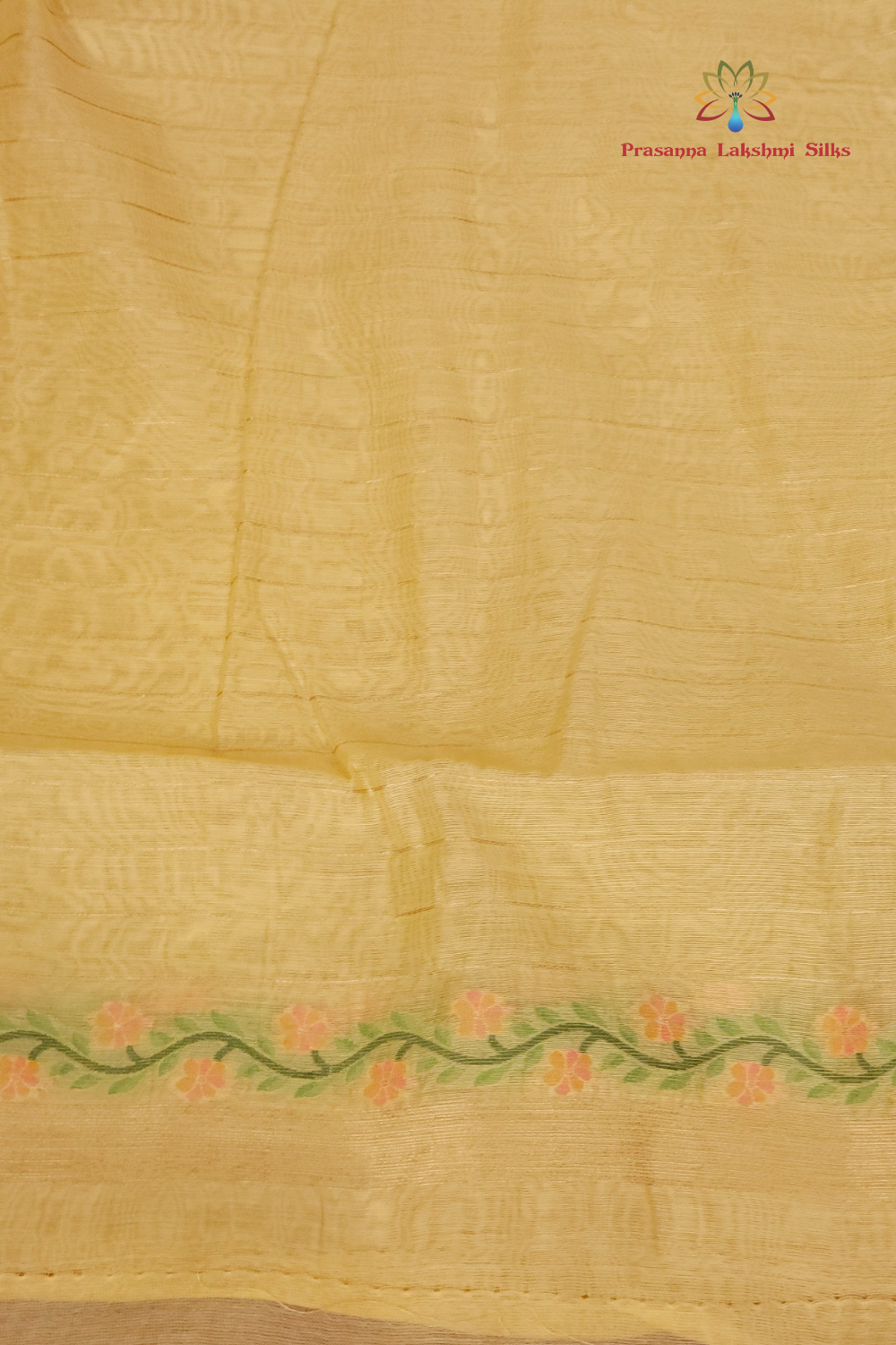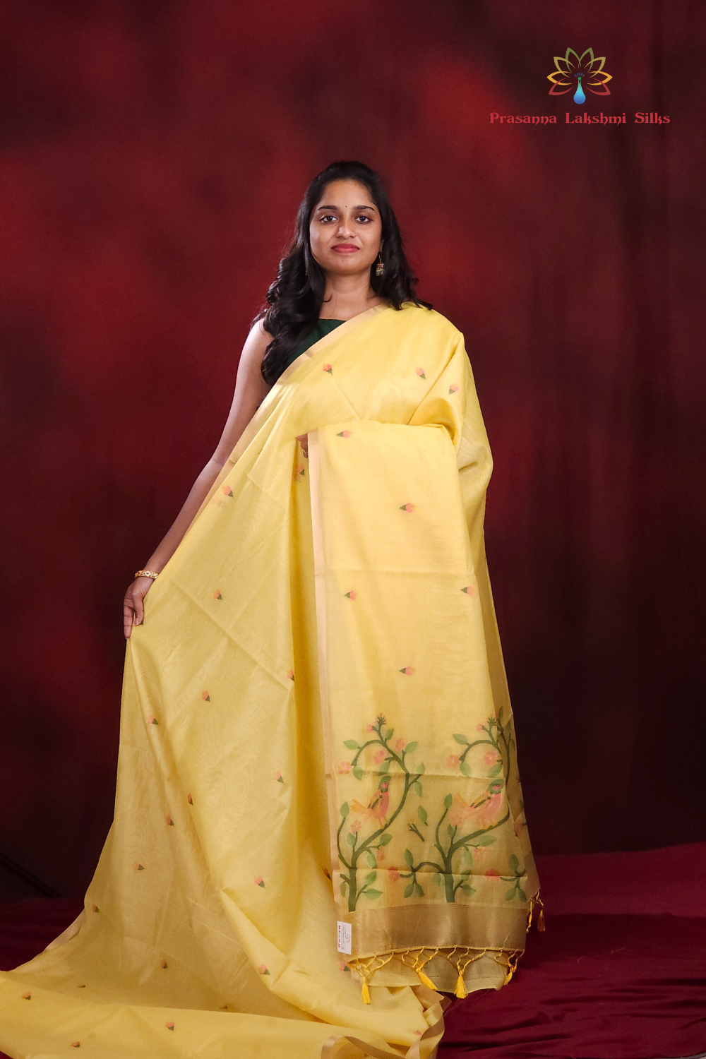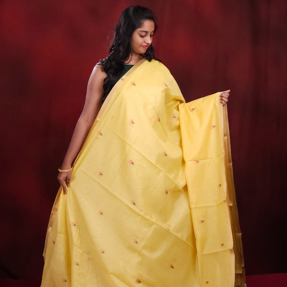 Experience the elegance of our Chanderi silk cotton saree, allover Floral motifs with 1inch jari borders and beautiful Jhamdhani weaving pallu ,with tassel paired with Running blouse....