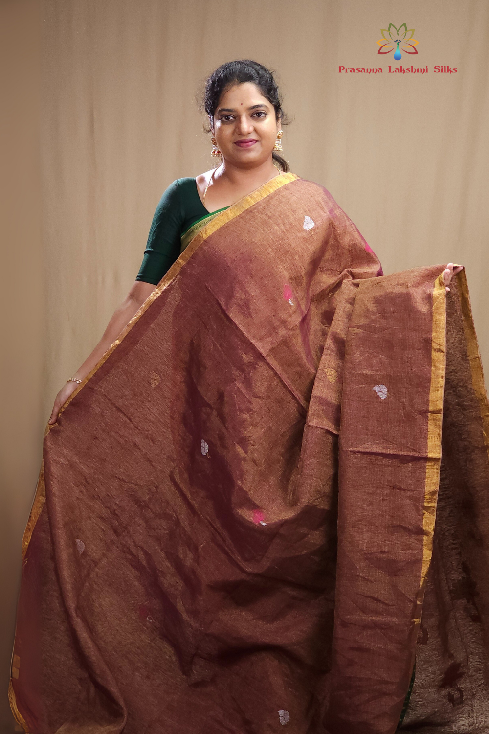 Exquisite Pure Linen Tissues Sarees featuring intricate Jamdhani floral motifs all over the body, with subtle Meenakari detailing for a touch of elegance. A sleek 1-inch zari border with rich Floral pallu paired with a running blouse for a complete graceful look.....