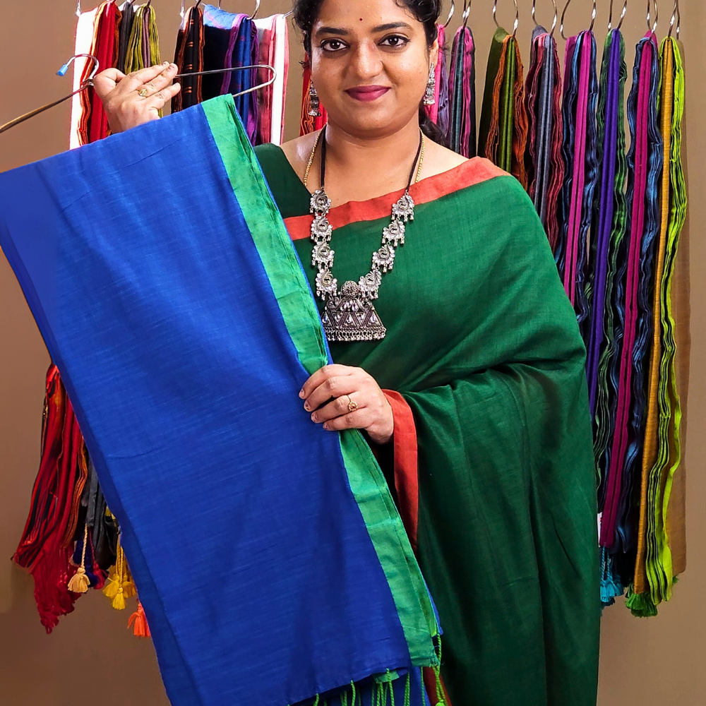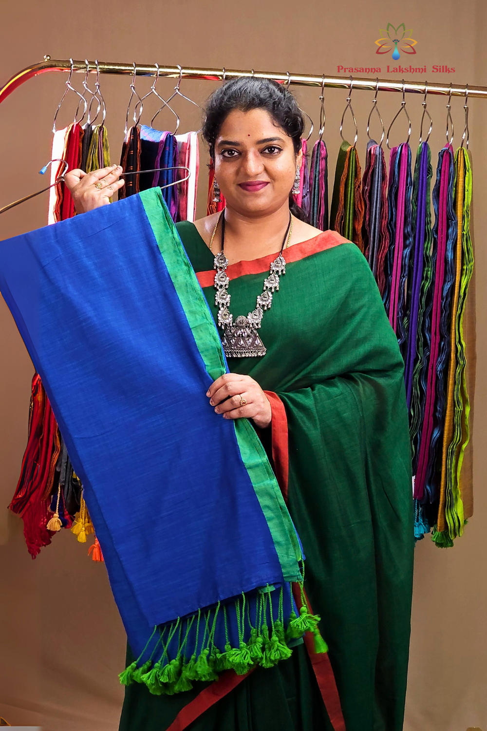 Discover the elegance of our Khadi Cotton Saree, featuring a plain body paired with contrast color detailing in 1 inch , pallu finished with tassels paired with a running blouse.....
