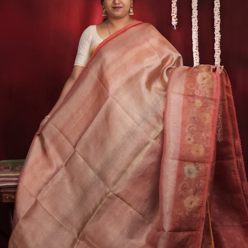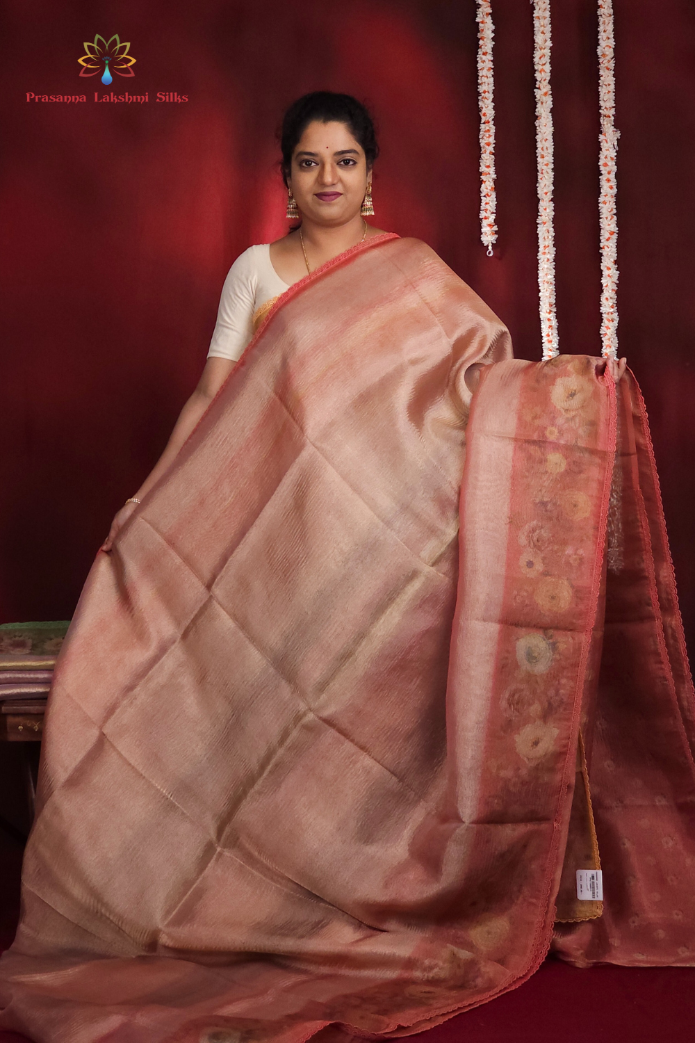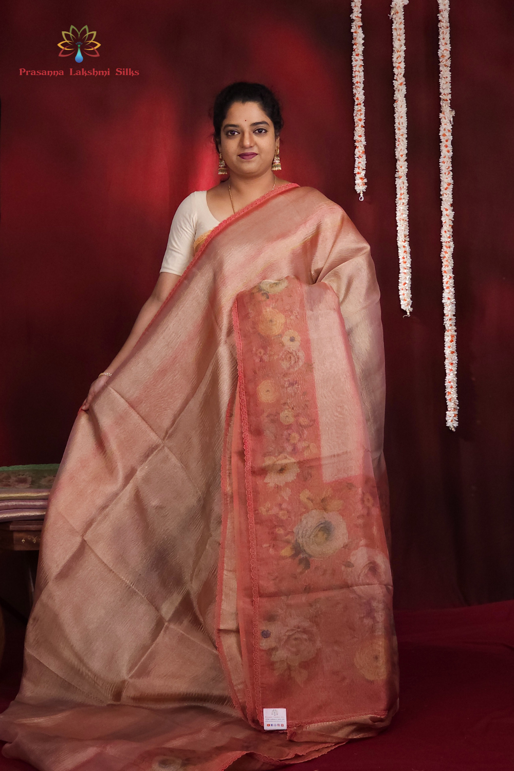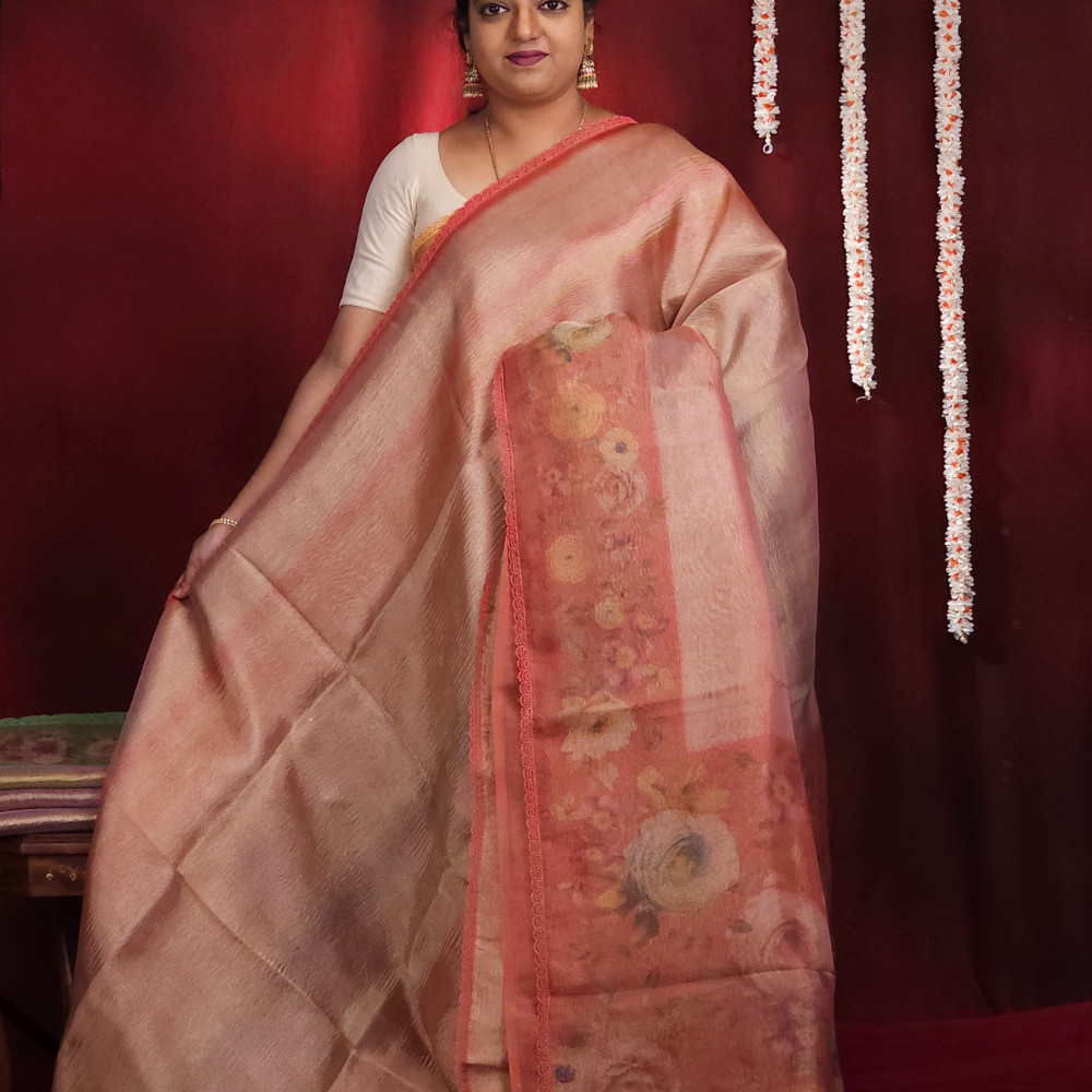 Multi colour Crush Tissue Saree with unique Digital print borders ,dainty lace detailing Rich pallu and Digital pint Blouse.....