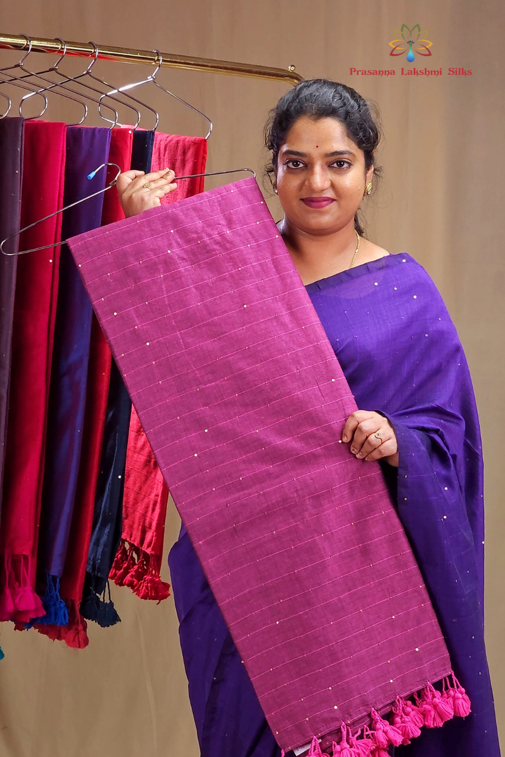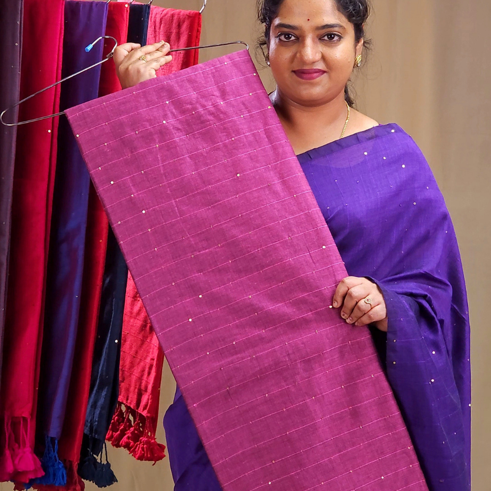 Discover the elegance of our Khadi Cotton Saree, featuring a plain body beautifully crafted with vertical sequin detailing that runs throughout the saree , pallu finished with tassels paired with a running blouse.....