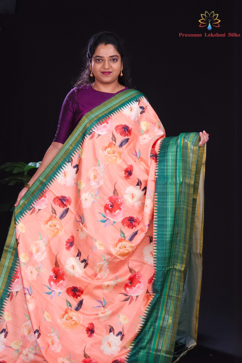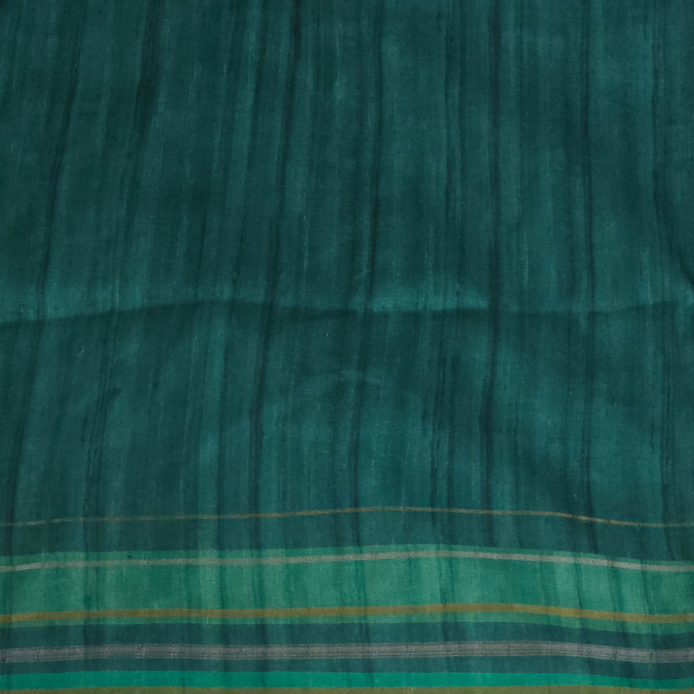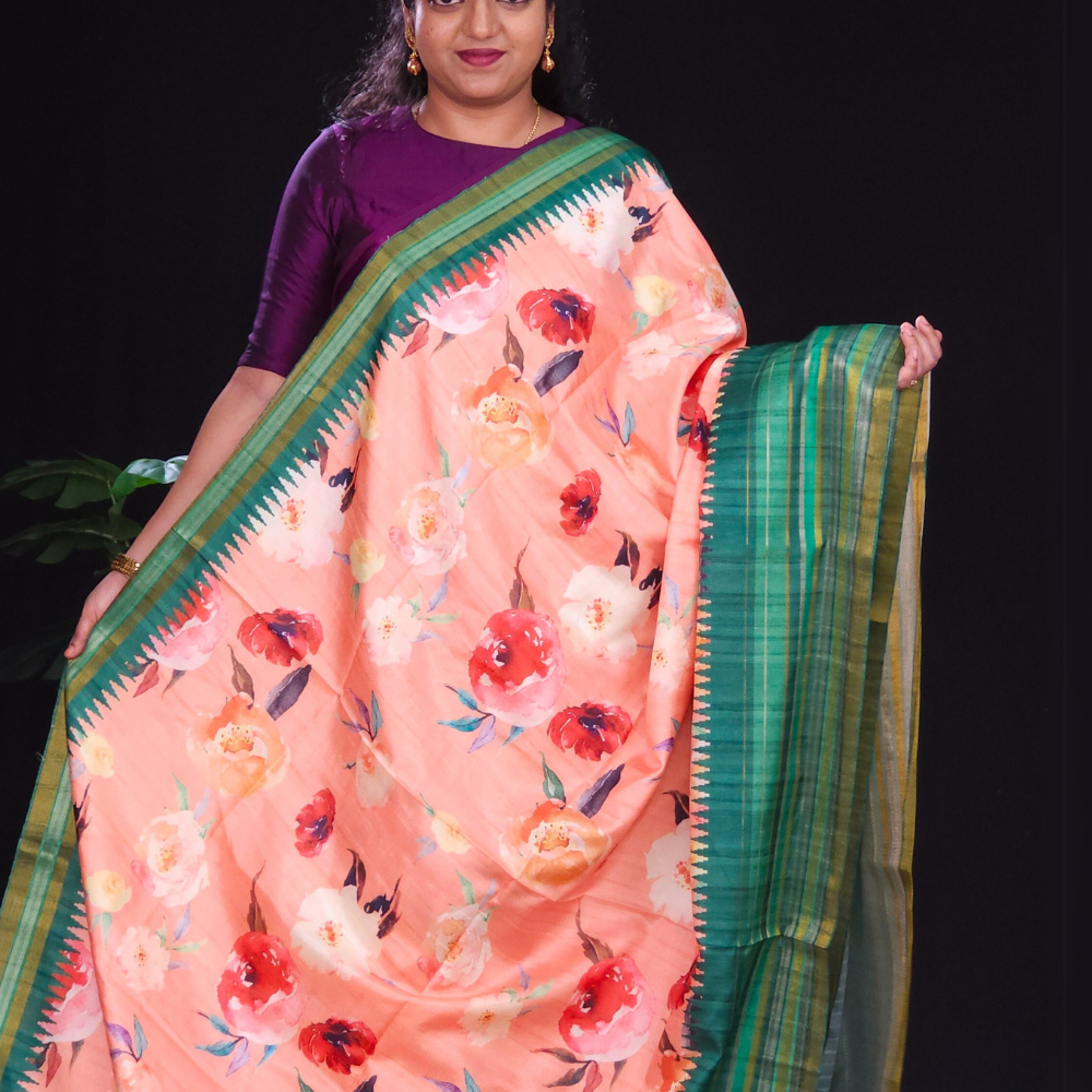 Dark Peach and Green raw silk sareee with woven border