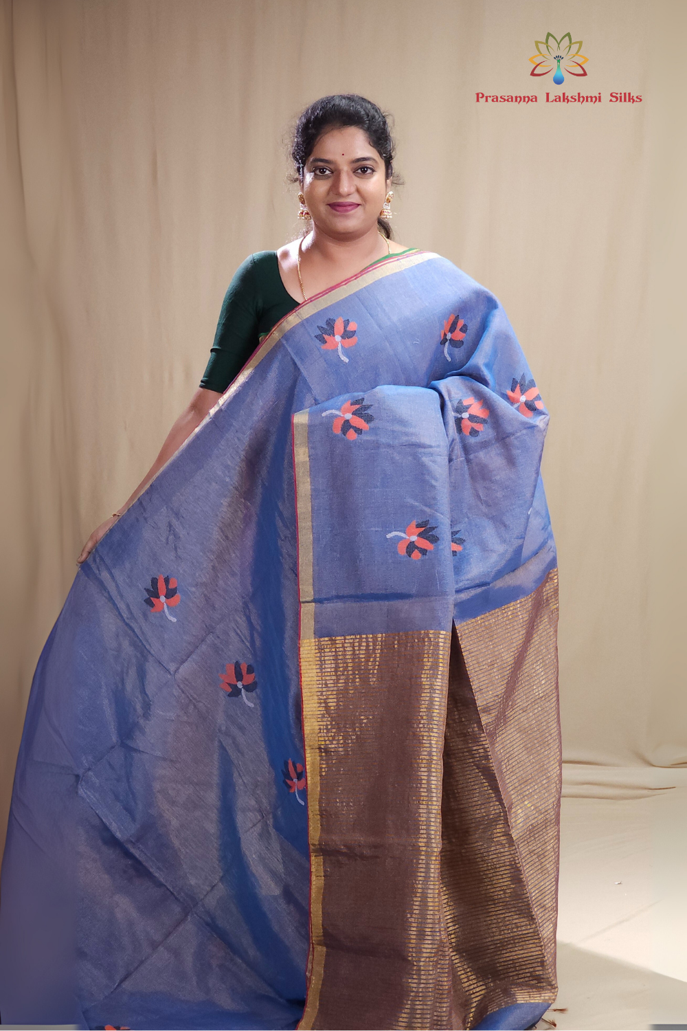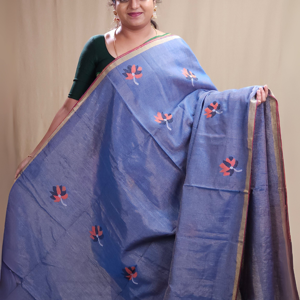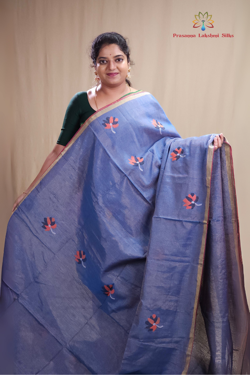 Exquisite Pure Linen Tissues Sarees featuring intricate Jamdhani floral motifs all over the body, with subtle Meenakari detailing for a touch of elegance. A sleek 1-inch zari border with rich Floral pallu paired with a running blouse for a complete graceful look.....