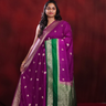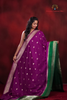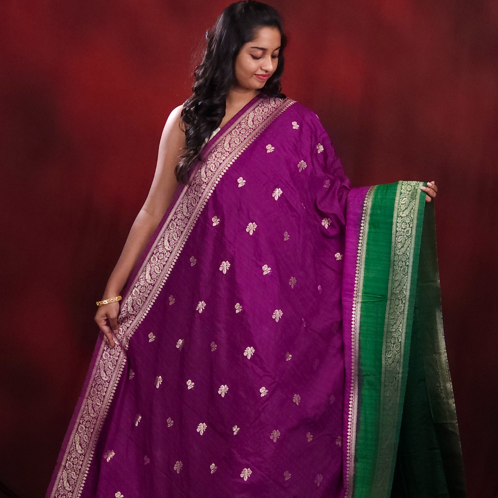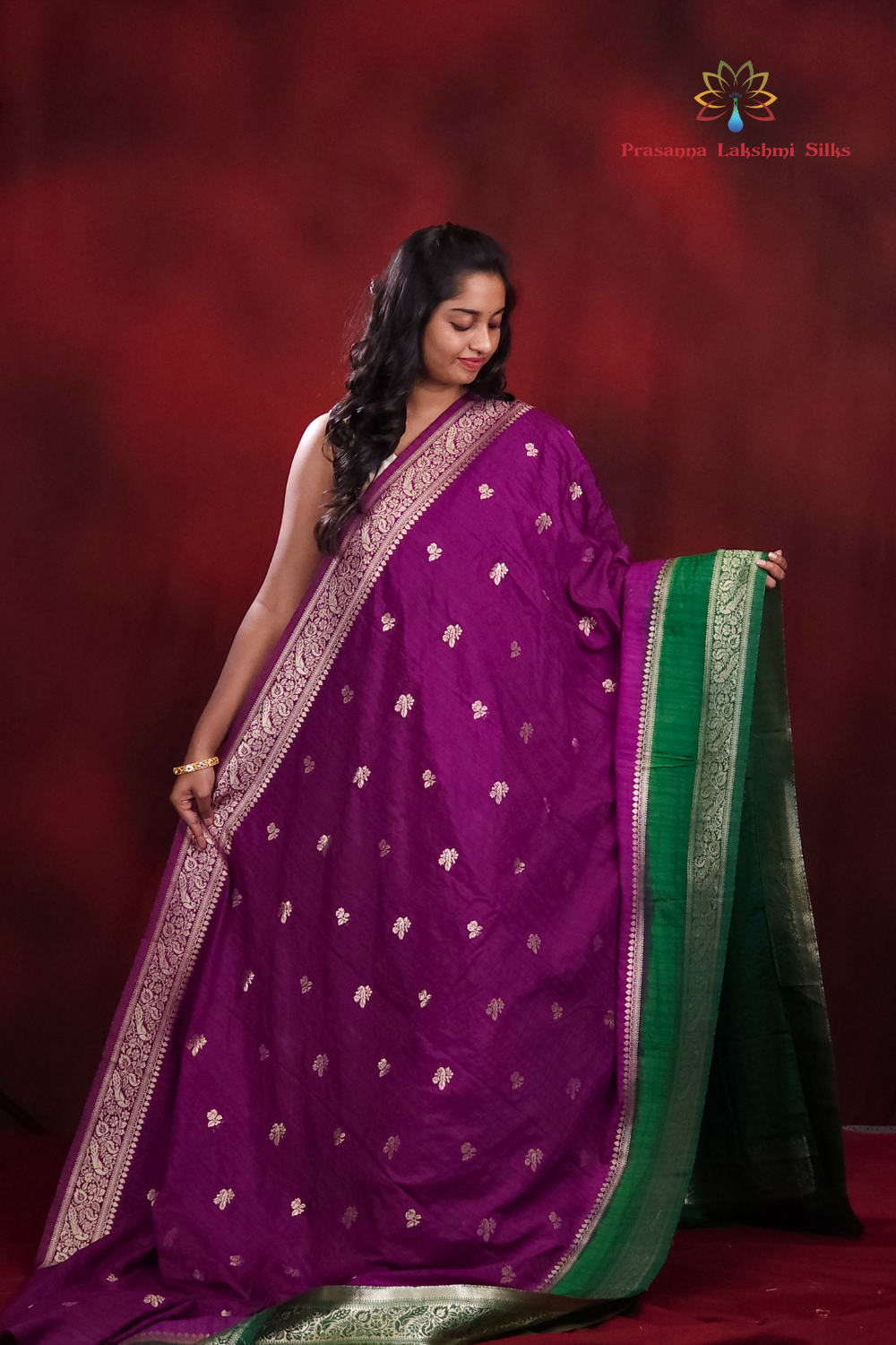 Experience the richness of Semi dupion saree allover small floral zari woven motifs with contrast zari woven gap borders, paired with stripe pallu and contrast blouse....